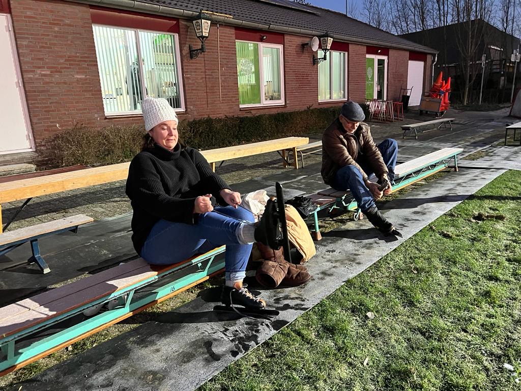 Even verderop staan twee leerlingen van de nabij gelegen basisschool De Vos verlangend naar het ijs te kijken. Is er één dag ijs, moeten ze naar school. “Misschien krijgen we wel ijsvrij”, hopen ze. De school duurt tot 15.00 uur. “Dan gauw naar huis, schaatsen halen en de baan op.” Dat gaan ze halen, denkt ijsmeester Hendriks. Het gaat wel dooien vanmiddag, maar hij verwacht dat de baan tot 20.00 uur vanavond open kan blijven. “Er komen wolken en dat betekent dat de zon niet op het ijs kan komen. Dat scheelt altijd.”