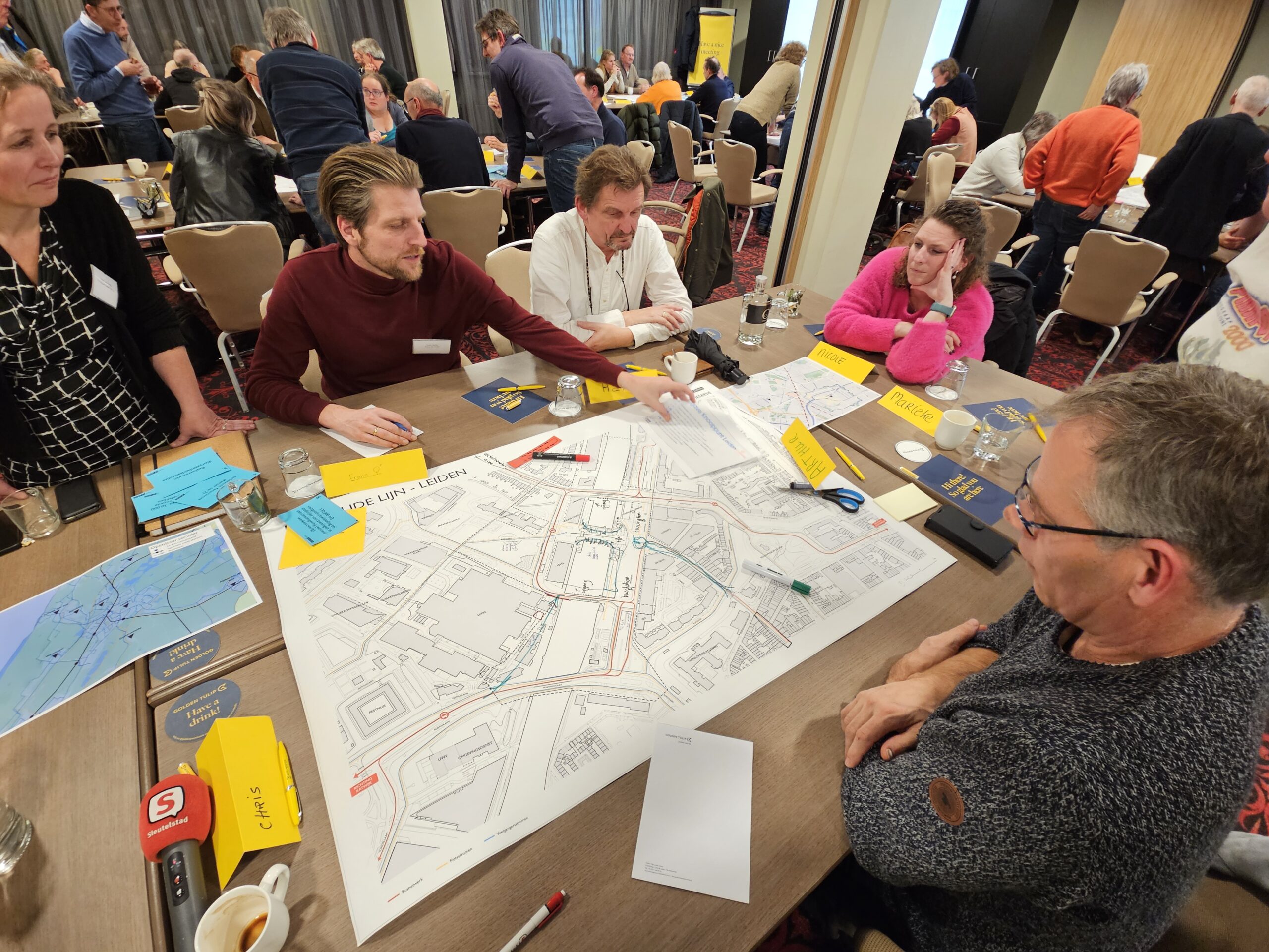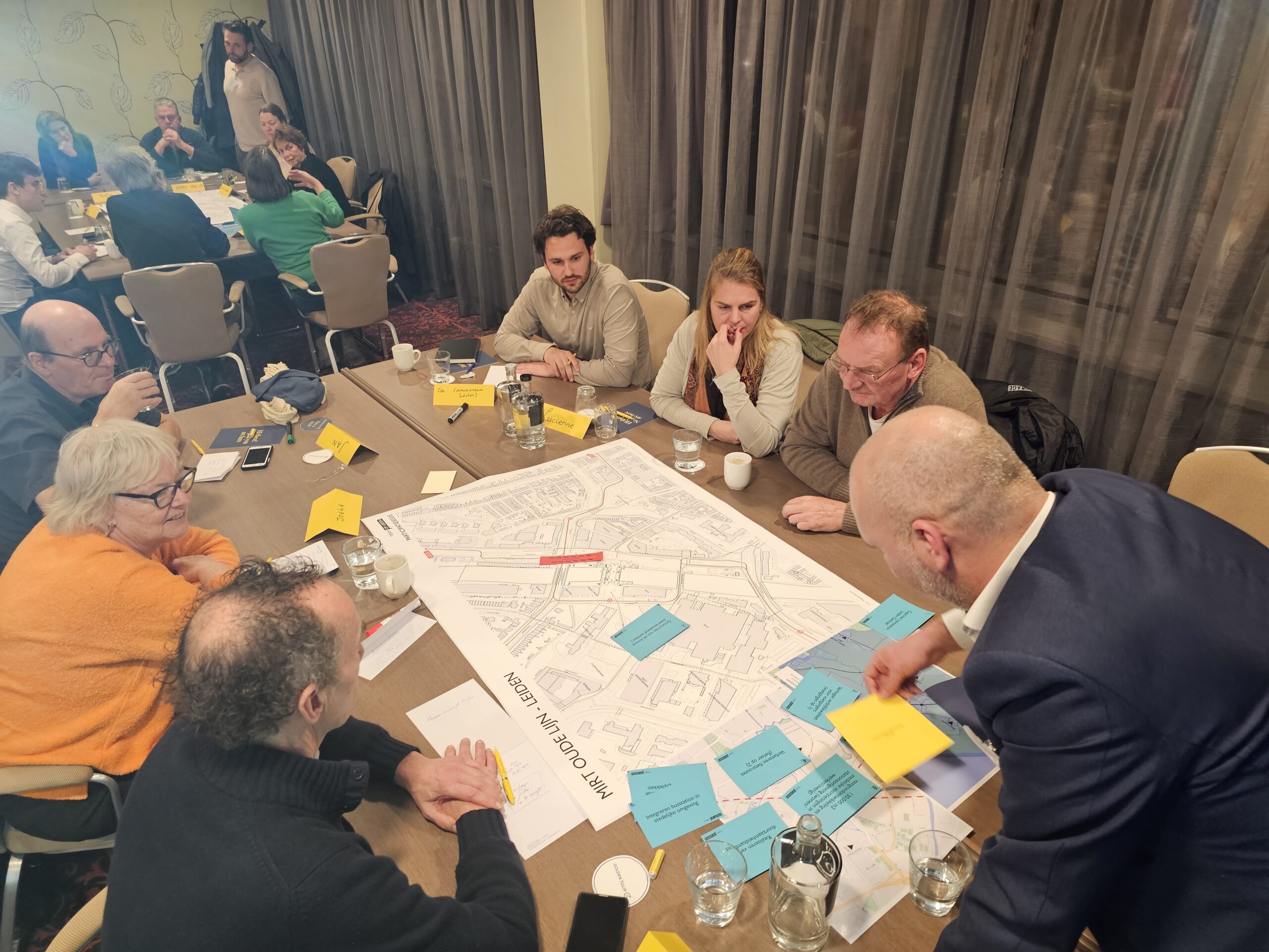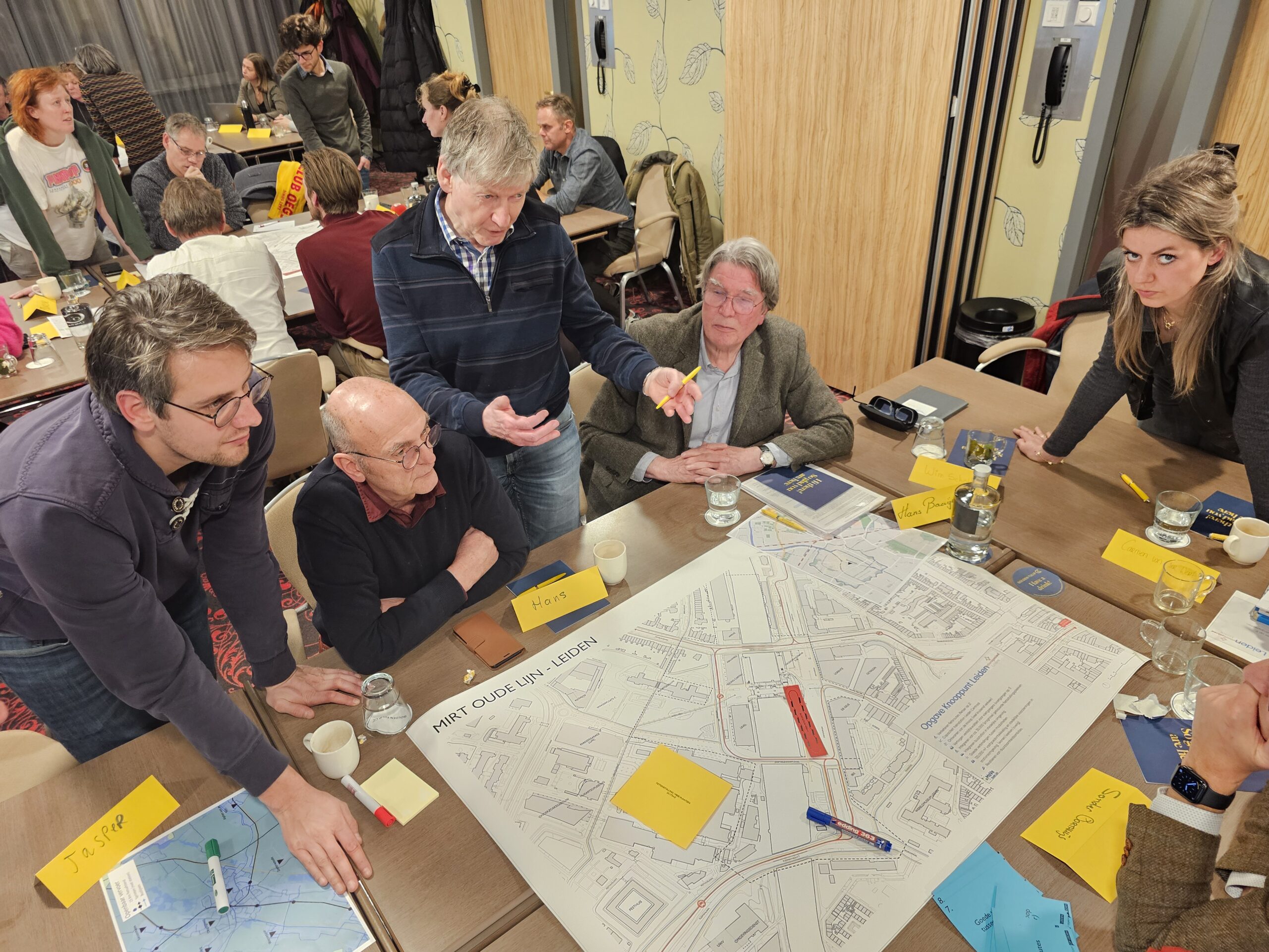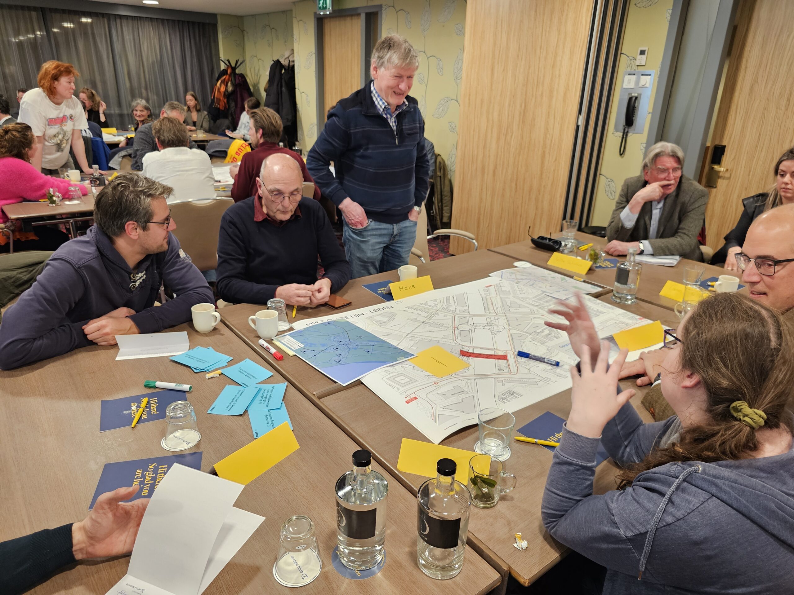 Dinsdagavond was bij het Golden Tulip Hotel in datzelfde stationsgebied de eerste van een serie bijeenkomsten waar iedereen welkom is om mee te praten en input te leveren voor de plannen. Daarvan werd flink gebruik gemaakt. Circa vijftig belangstellenden waren op komen dagen en namen na een korte inleiding plaats aan een van de acht ‘meedenktafels’. Elke tafel stond onder leiding van enkele leden van ‘Team op Leiden’. Dat is het consortium van architecten, stedenbouwkundigen en ingenieurs dat is samengesteld om de plannen vorm te geven.