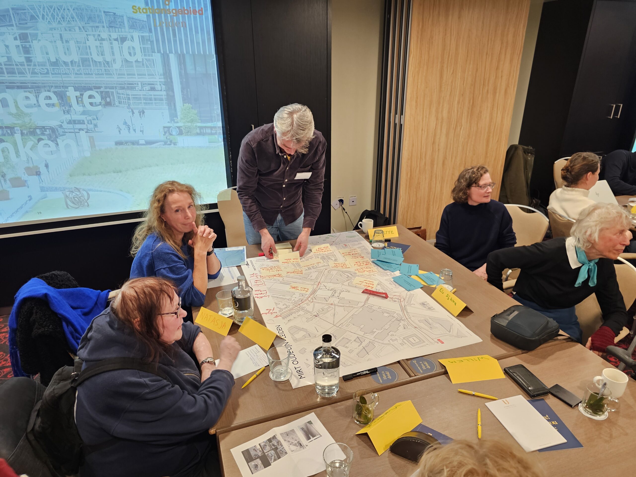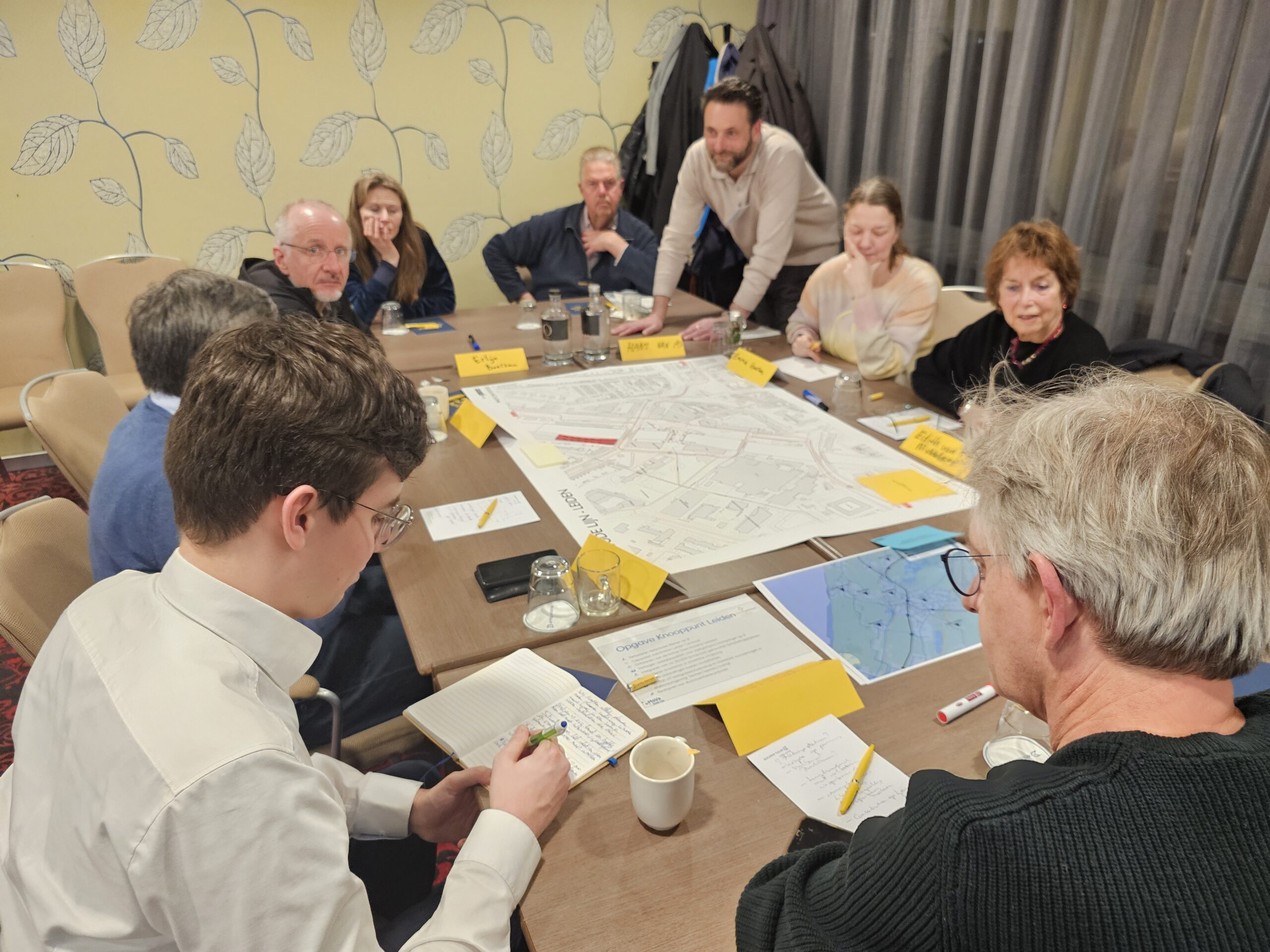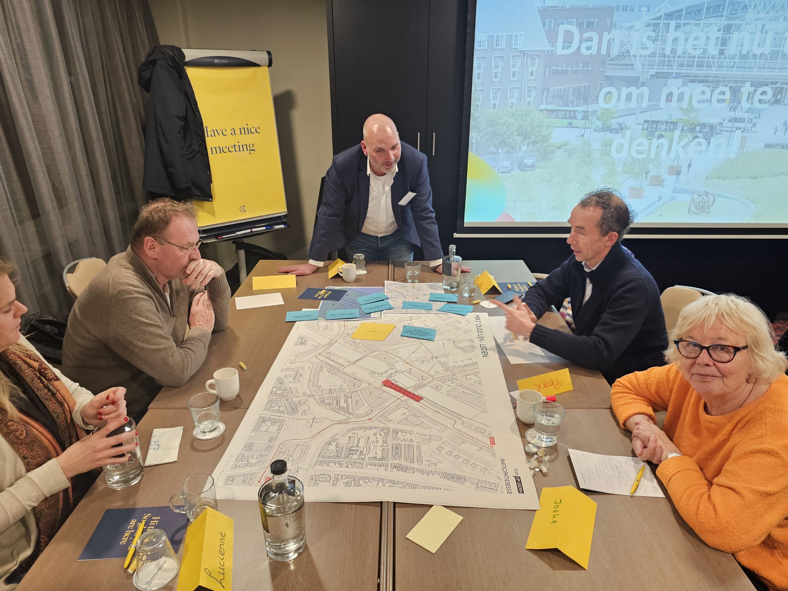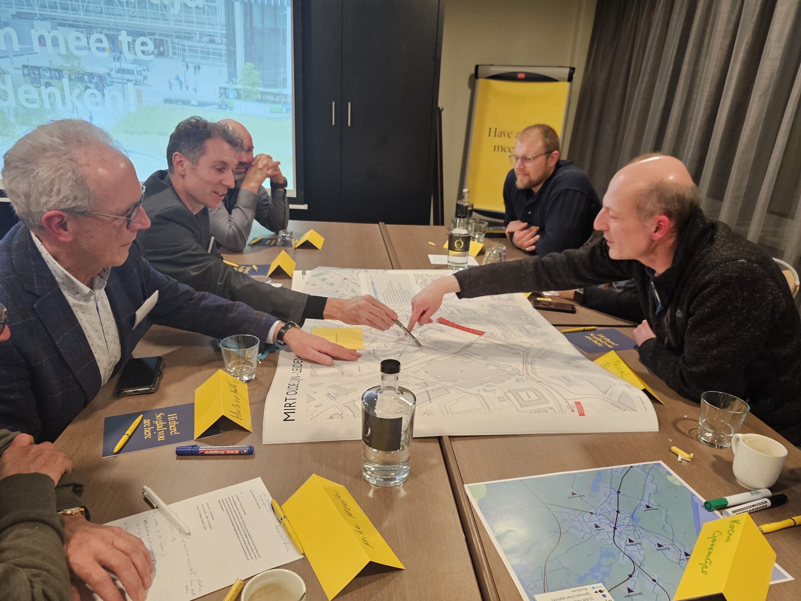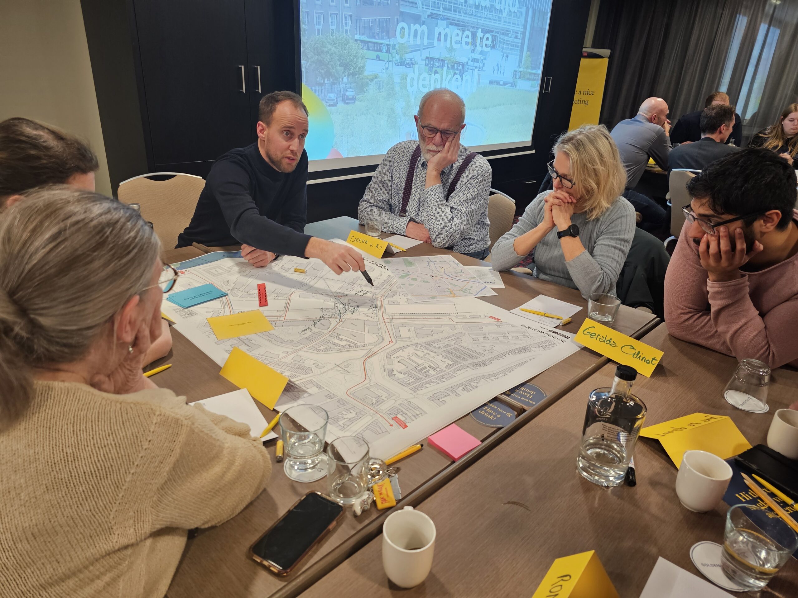 Dinsdagavond was bij het Golden Tulip Hotel in datzelfde stationsgebied de eerste van een serie bijeenkomsten waar iedereen welkom is om mee te praten en input te leveren voor de plannen. Daarvan werd flink gebruik gemaakt. Circa vijftig belangstellenden waren op komen dagen en namen na een korte inleiding plaats aan een van de acht ‘meedenktafels’. Elke tafel stond onder leiding van enkele leden van ‘Team op Leiden’. Dat is het consortium van architecten, stedenbouwkundigen en ingenieurs dat is samengesteld om de plannen vorm te geven.