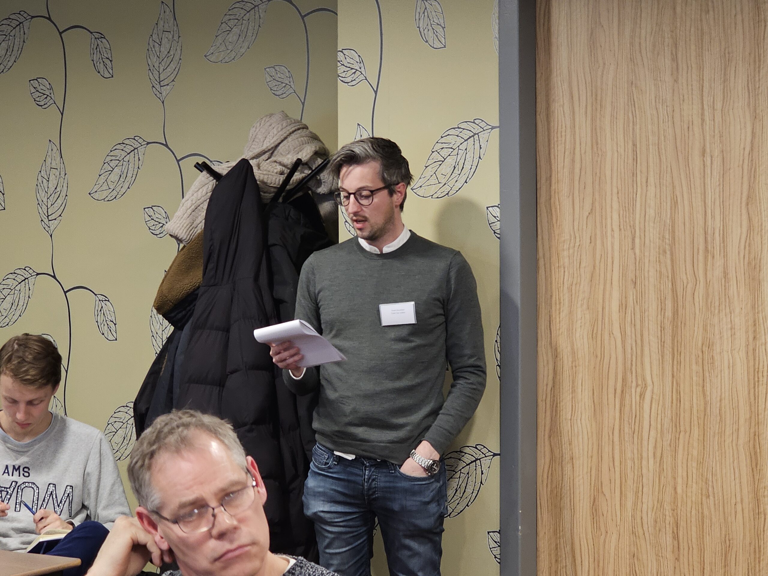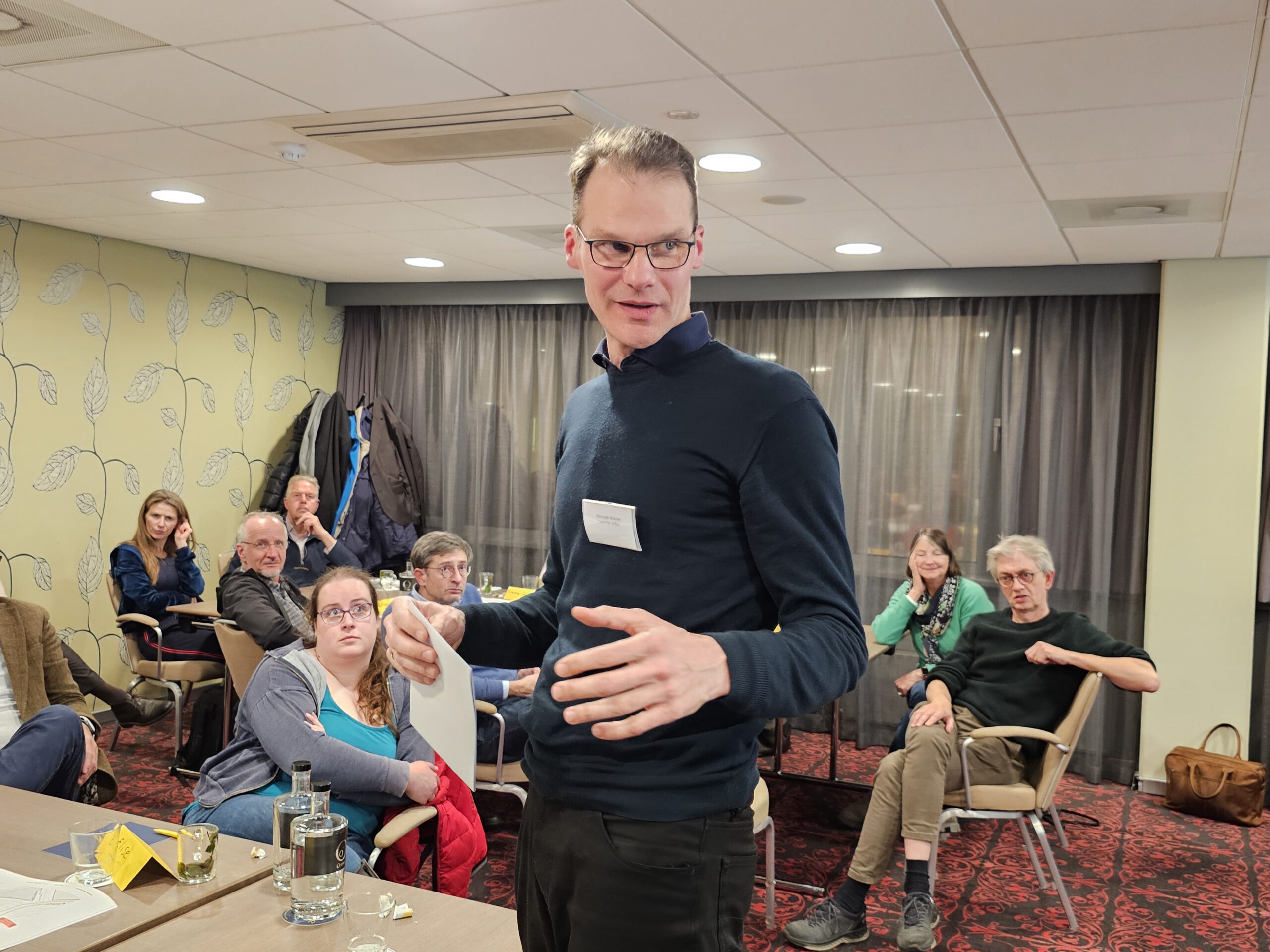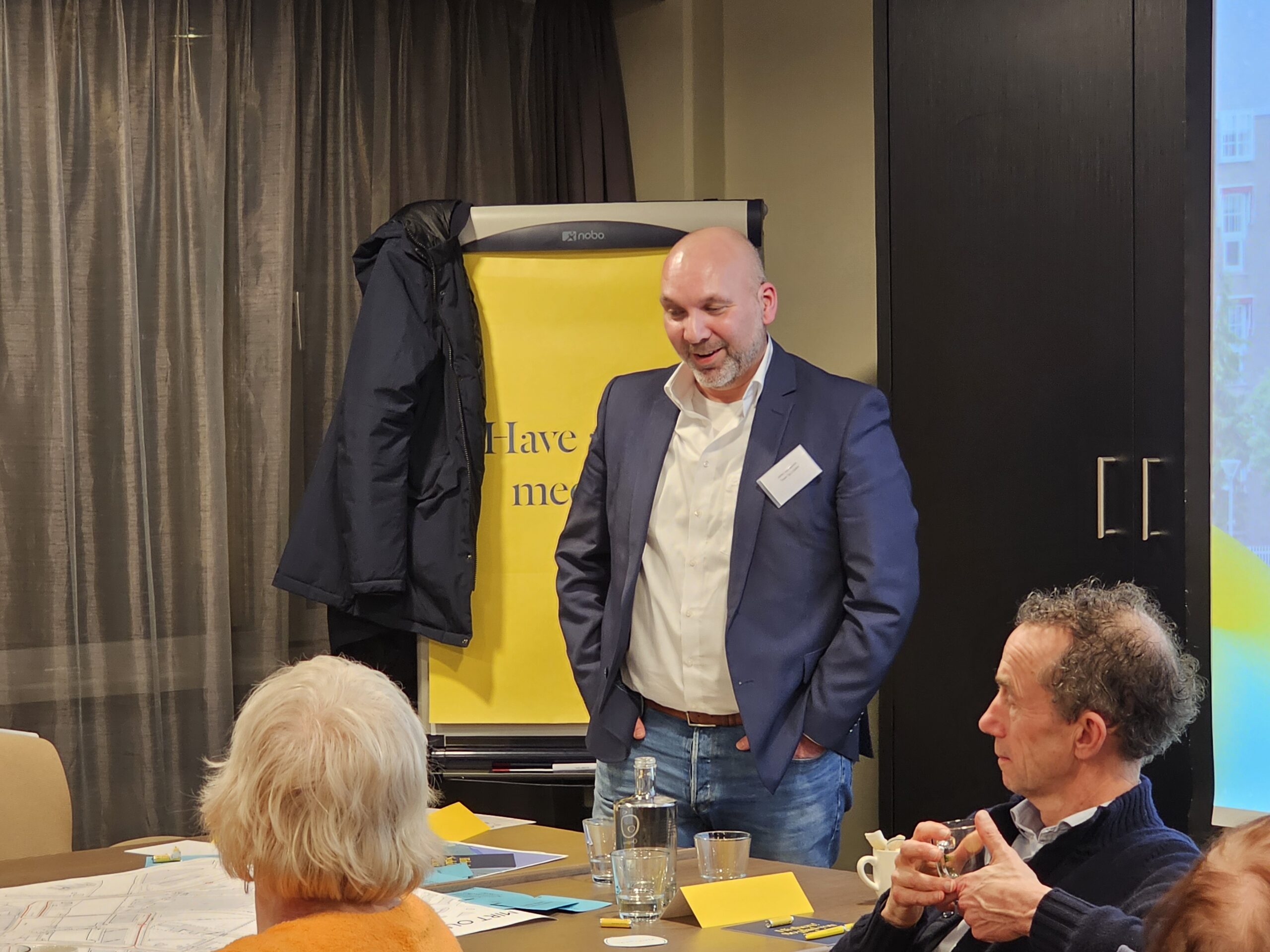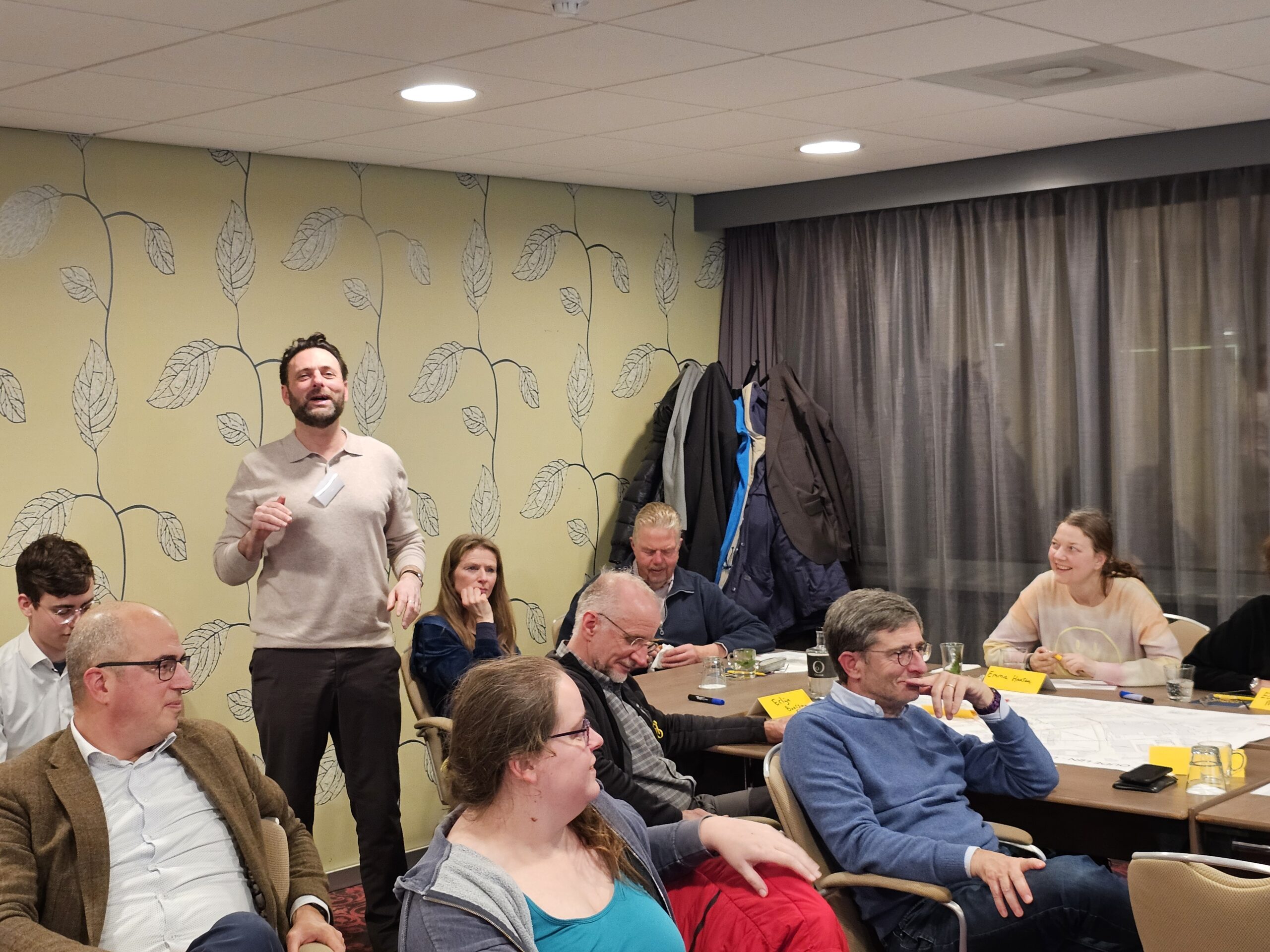 Chris de Waard schoof aan bij een van de meedenktafels en sprak na afloop met omgevingsmanager Len Hazeleger, en meedenkers Hans, Marieke en Tjeerd.