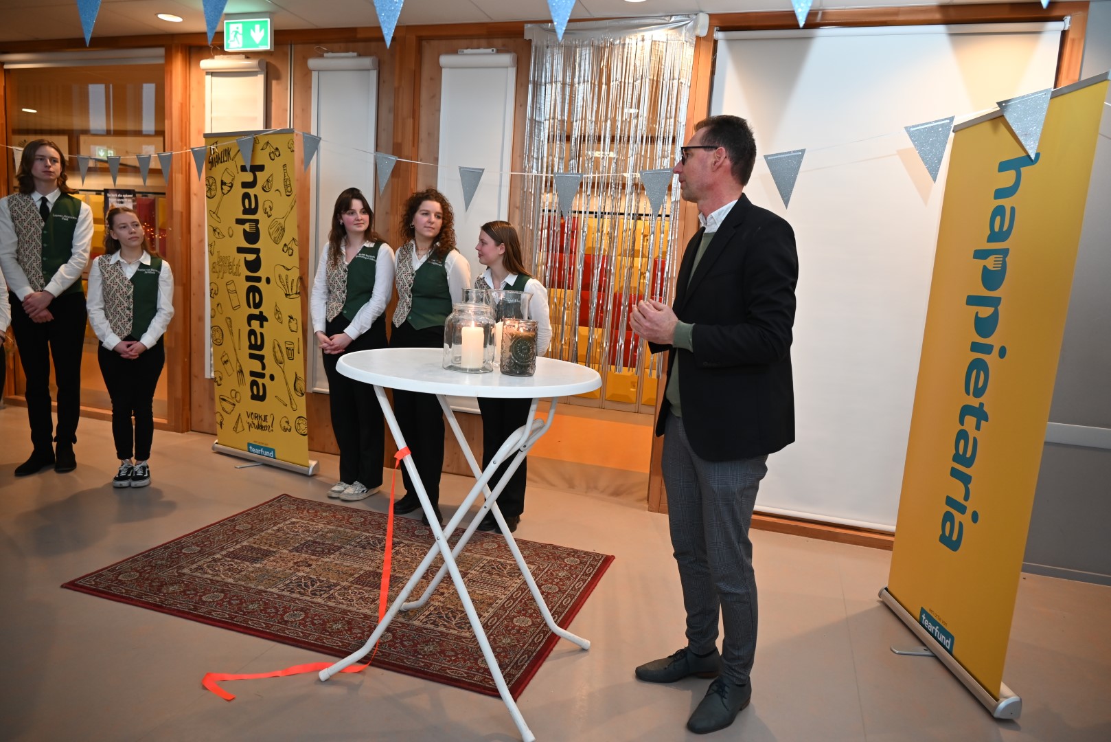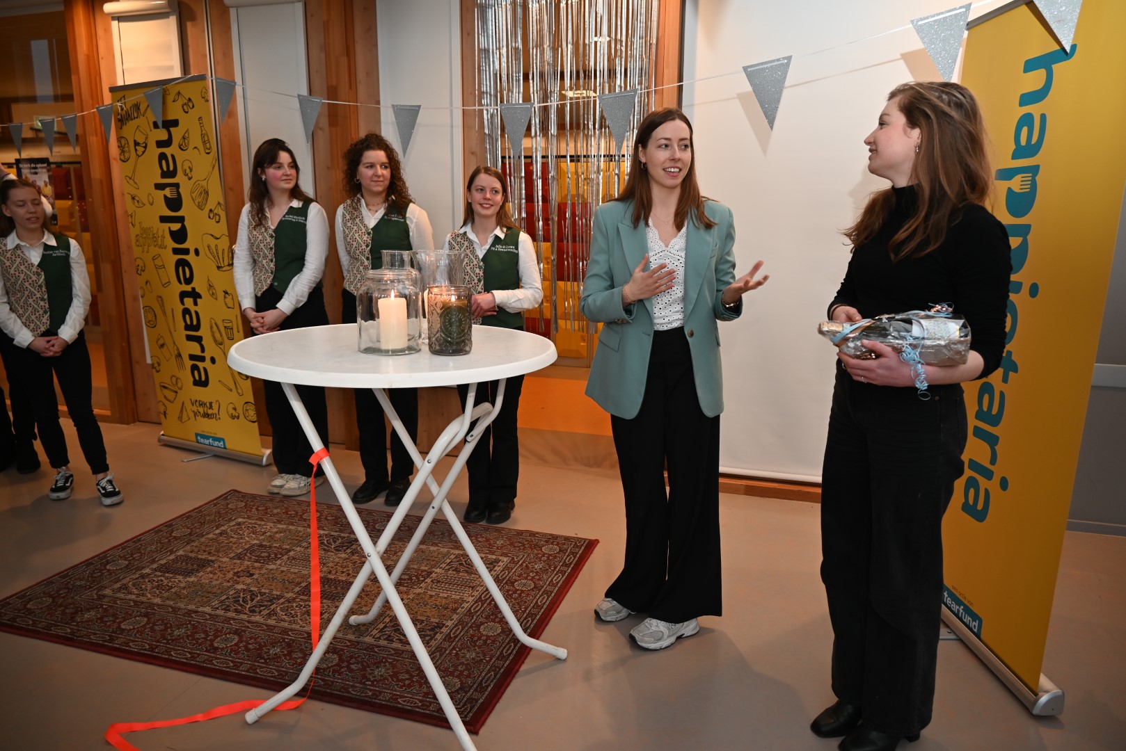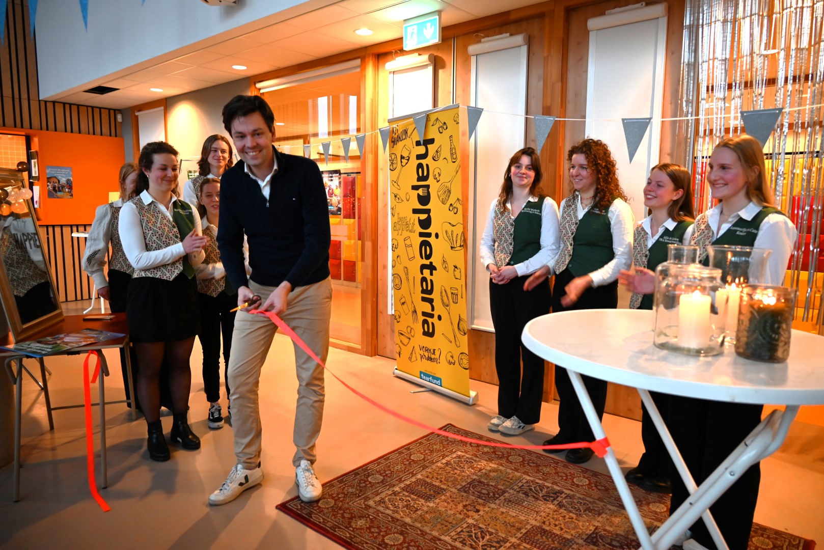Voorzitter Mariette Soellaart heette de eerste gasten van de 2024-editie van harte welkom in de tot restaurant omgebouwde aula van het Driestar College. Daarna verrichte wethouder Julius Terpstra de openingshandeling van Happietaria Leiden dat tot en met 2 maart is geopend.