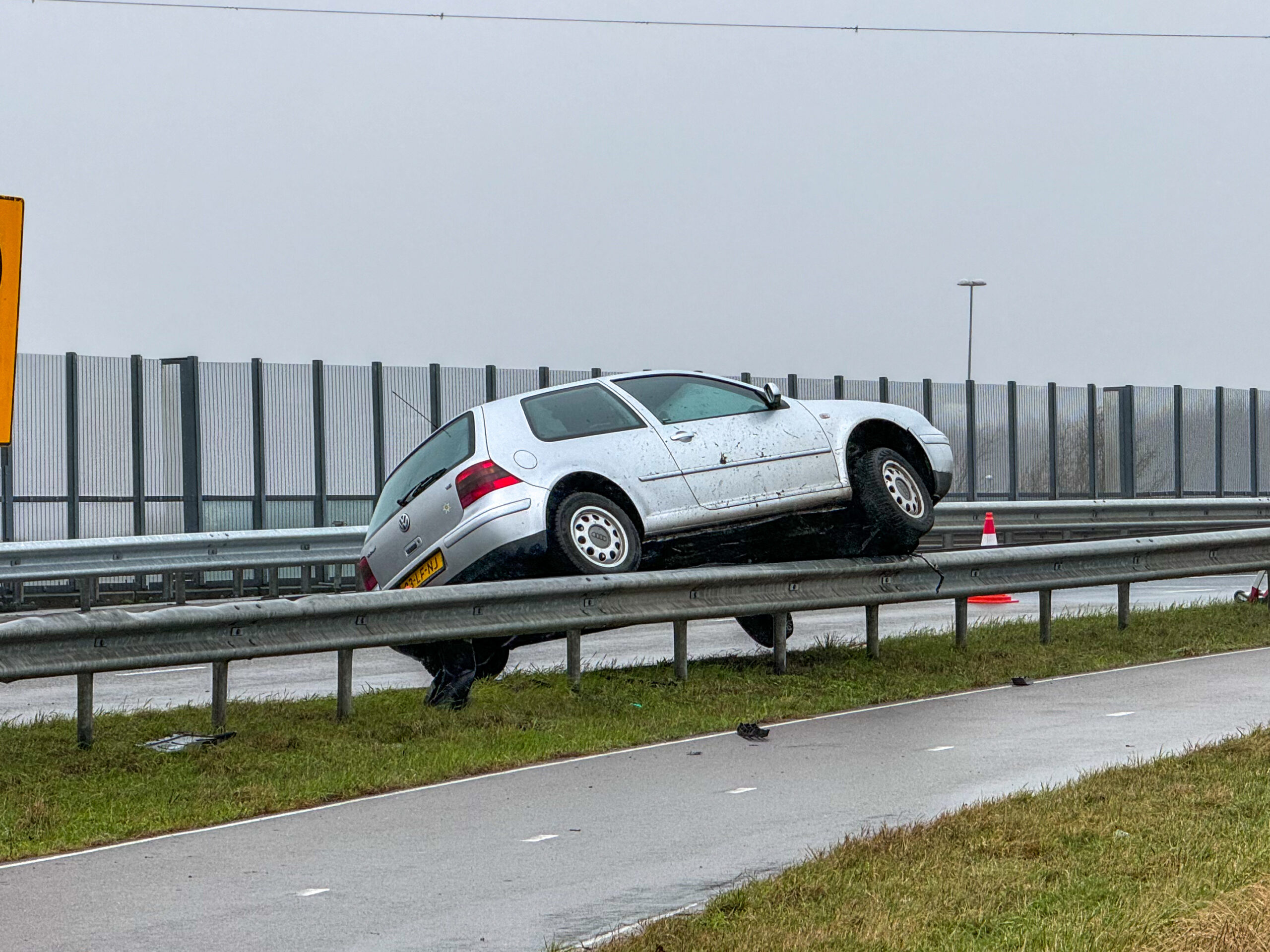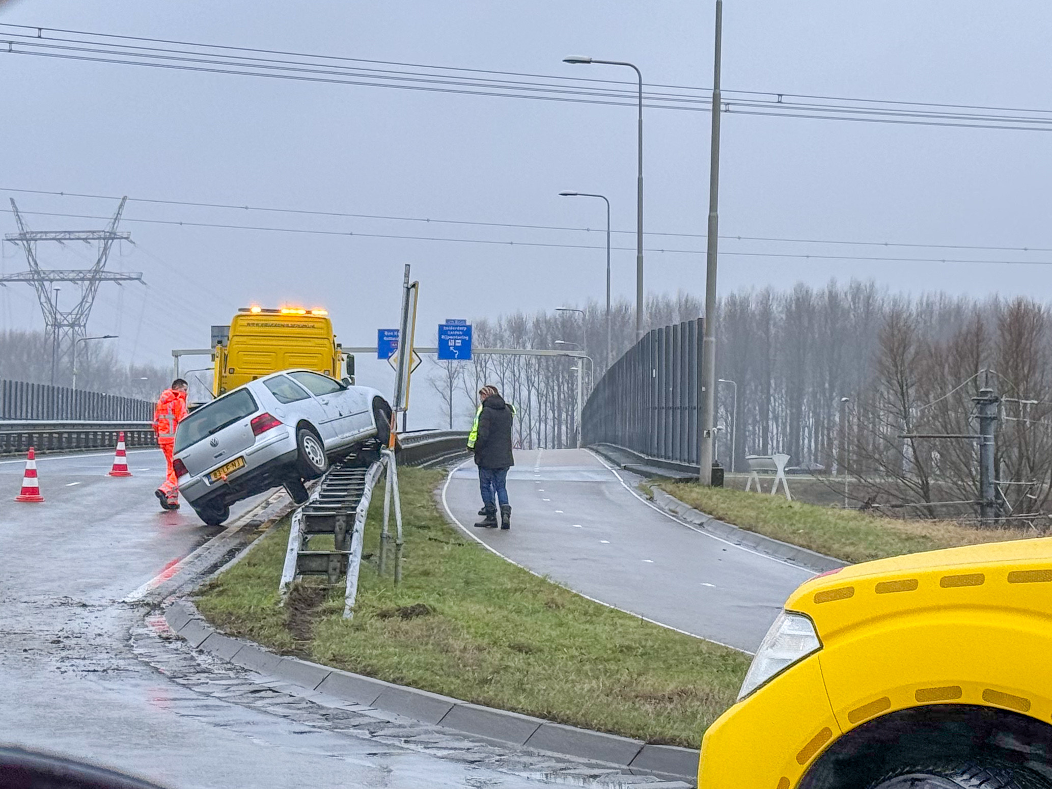 Een bergingsbedrijf heeft ter plaatse de auto van de vangrail getakeld. Door het ongeluk was een rijstrook afgesloten wat voor een kleine file zorgde. De oorzaak van het ongeluk is vooralsnog onbekend.