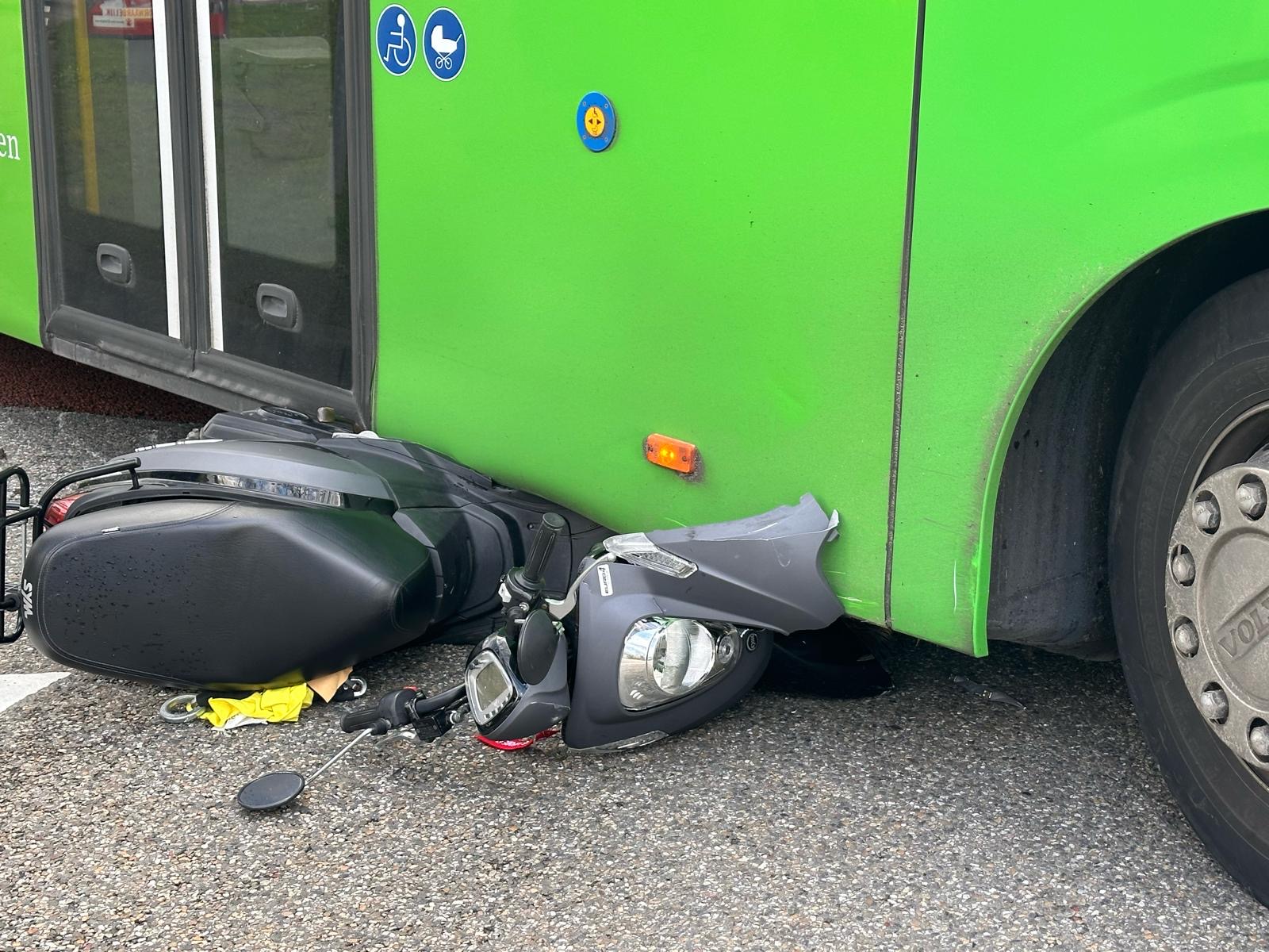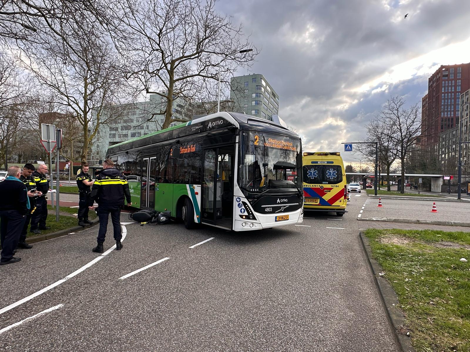 Een scooter is zondagmiddag rond 15.50 uur onder een lijnbus van Arriva terecht gekomen. Dat gebeurde op de kruising van de De Sitterlaan met de Lammenschansweg in Leiden. De berijder raakte wel gewond, maar is met eigen vervoer door familie naar het ziekenhuis gebracht.