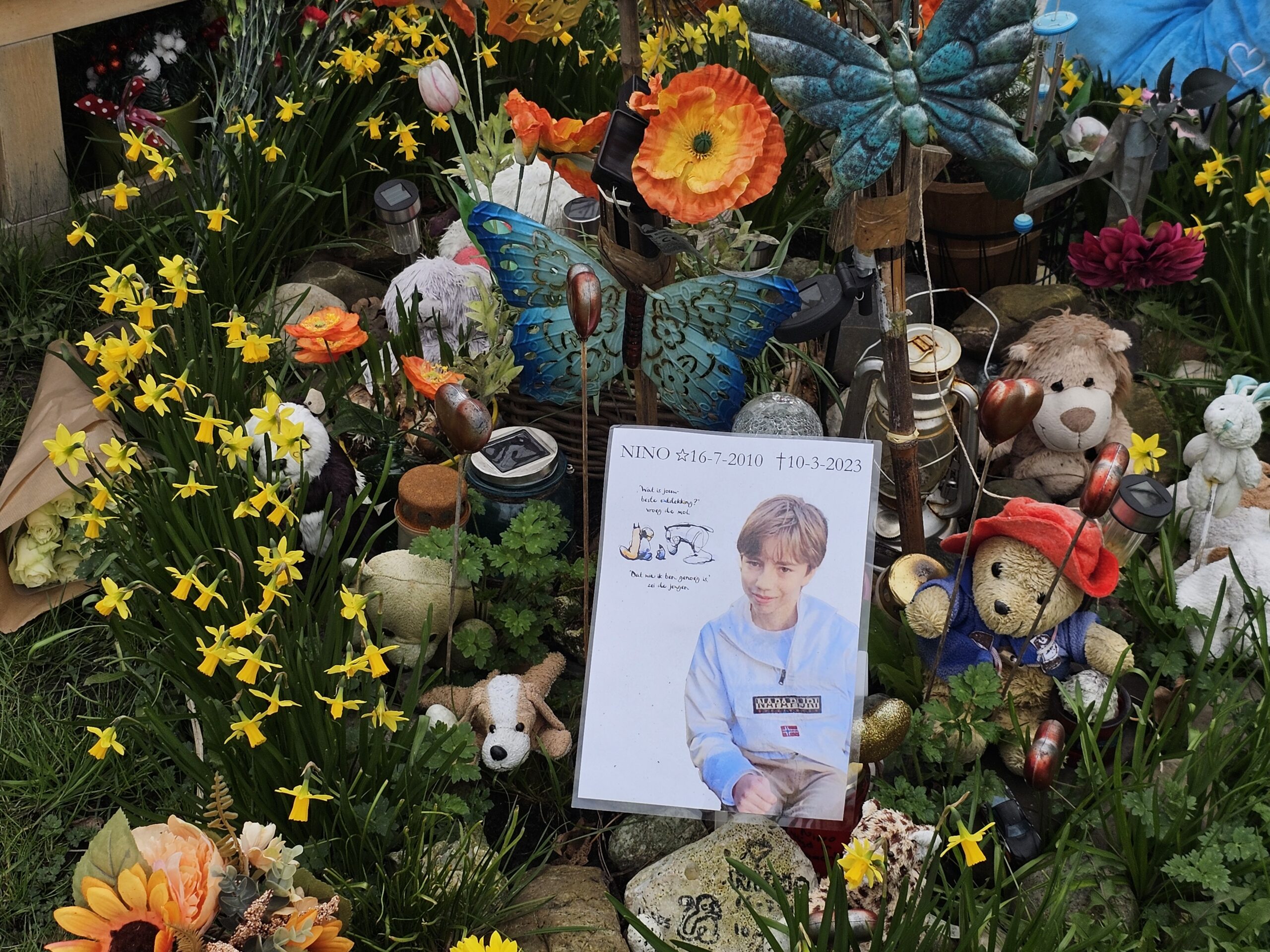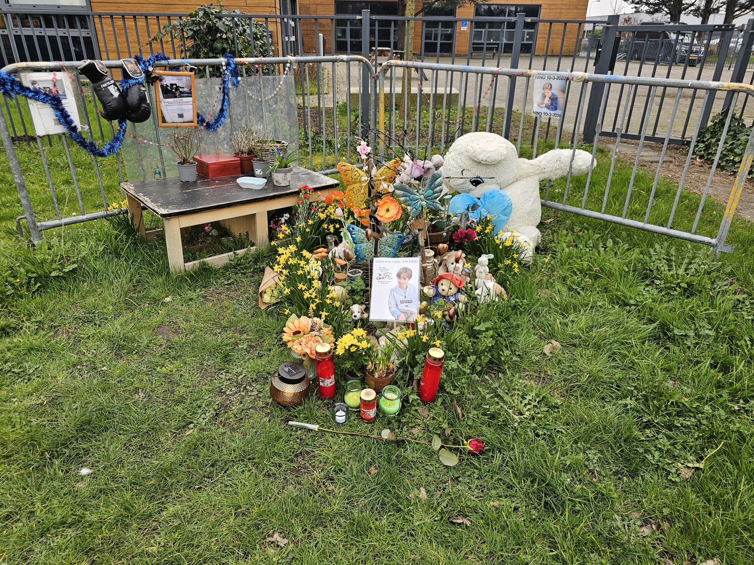 Het was zondag precies een jaar geleden dat op vrijdagmorgen 10 maart 2023 de Leiderdorpse Nino van der Zeeuw op 12-jarige leeftijd omkwam bij een verkeersongeluk op de Rietschans in Leiderdorp. In het gras voor de plek van het ongeval is een plekje ingericht ter nagedachtenis aan Nino. Zondag brandden er ook kaarsjes bij zijn foto.