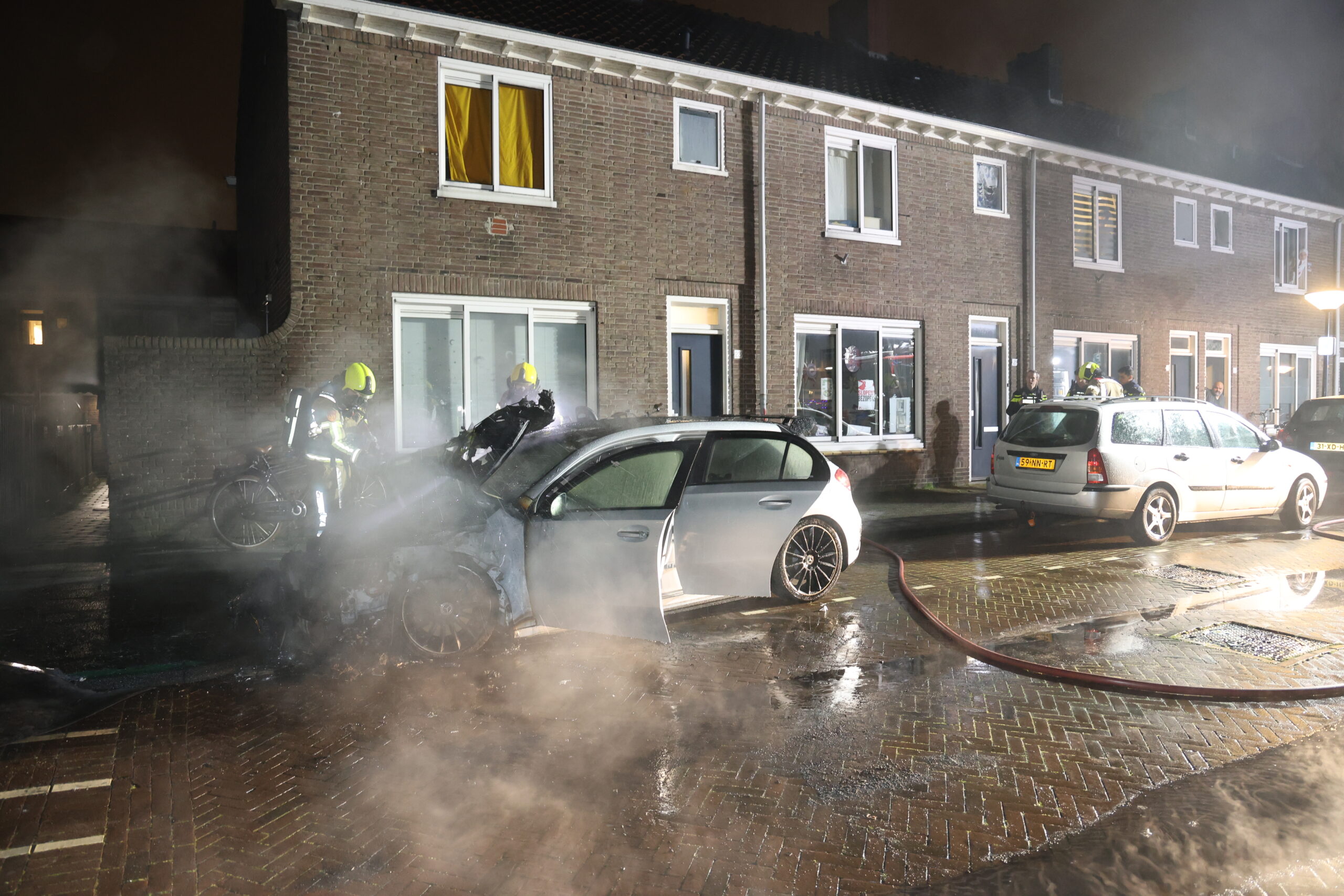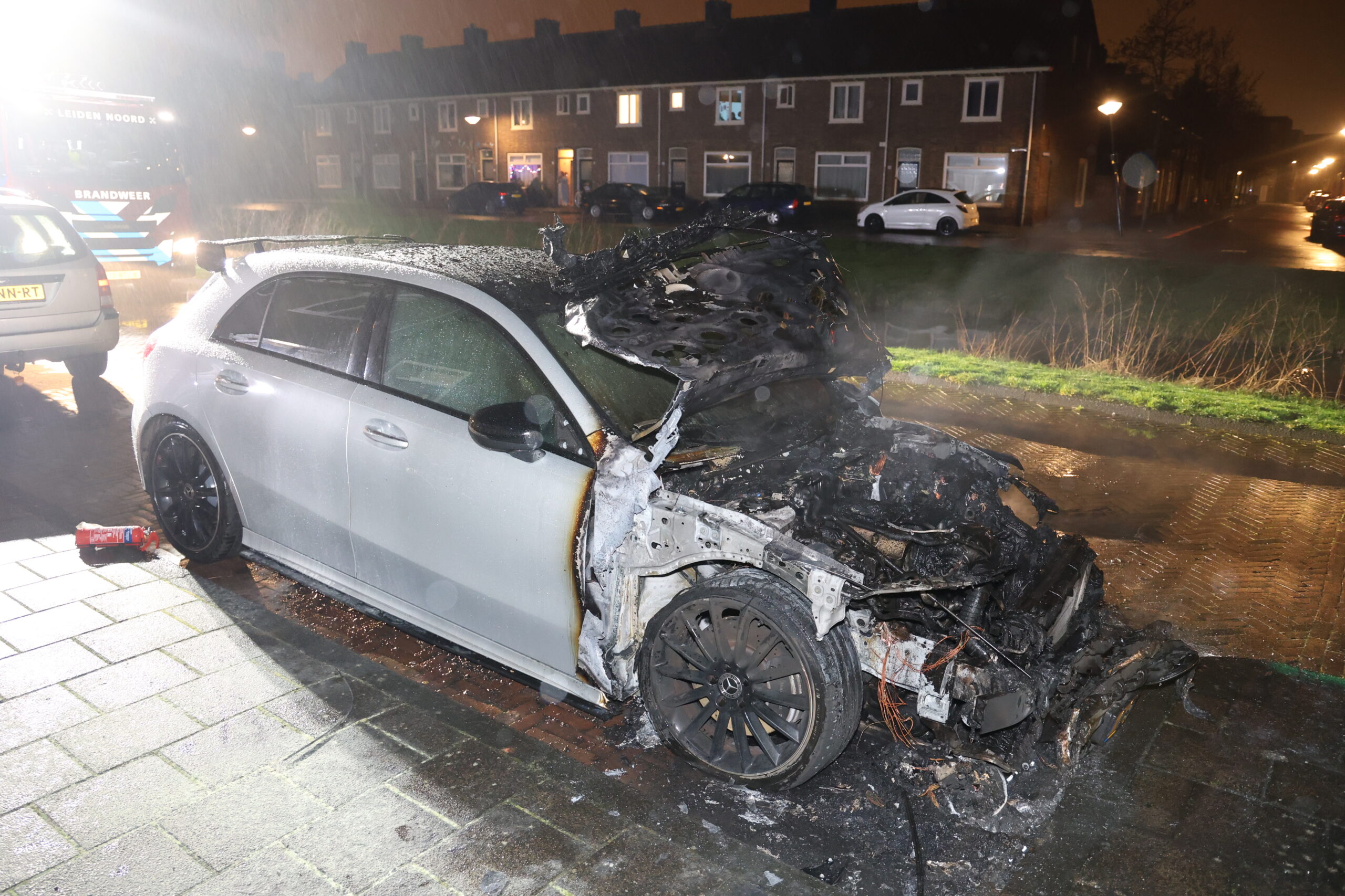 Toen de brandweer rond 23.00 uur arriveerde sloegen de vlammen al uit de motorkap van de Mercedes-Benz. Ondanks dat direct gestart is met blussen, kon niet worden voorkomen dat het voertuig volledig uitbrandde.