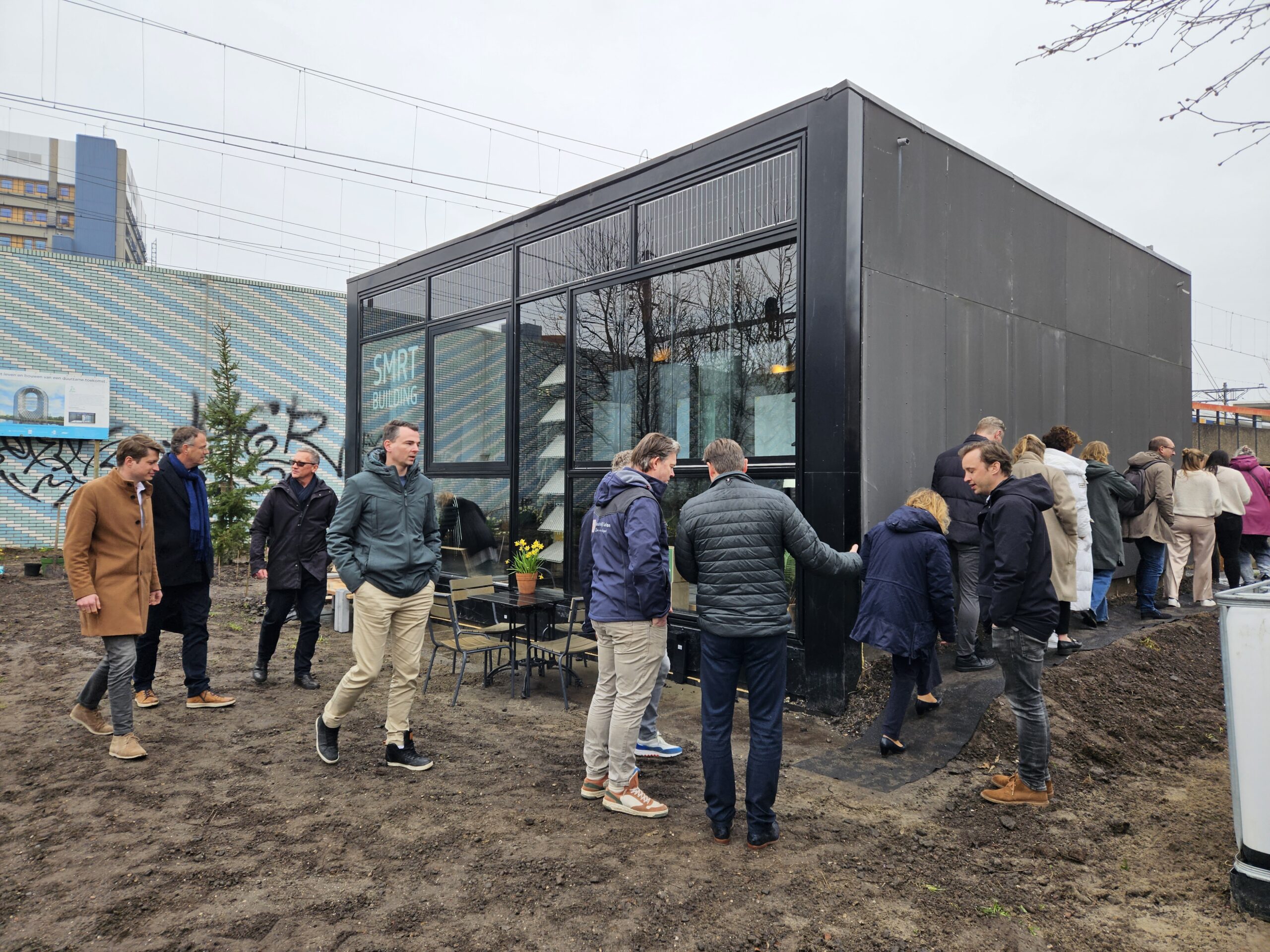 Onder meer projectmanager Aniek Langendijk en Duzan Doepel van architectenbureau Doepel Strijkers hielden een praatje bij de opening van de SMRT building. Ook wethouder Yvonne van Delft (energie) was bij de lancering aanwezig.