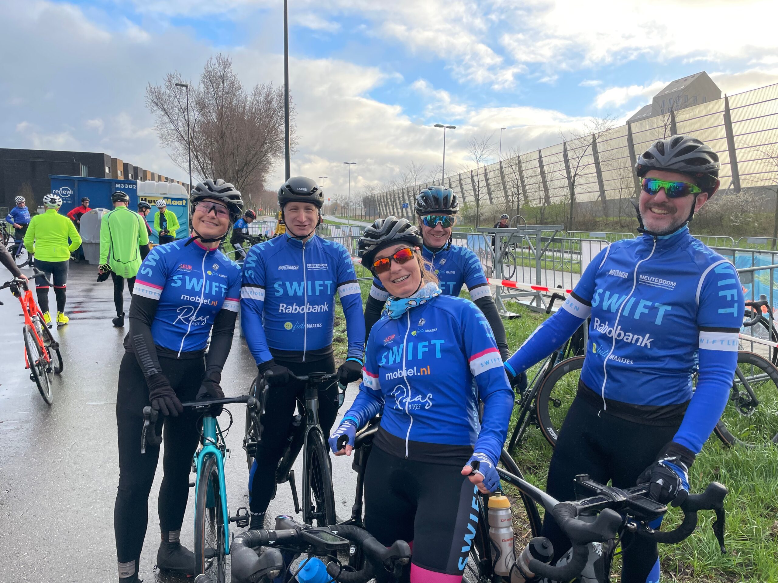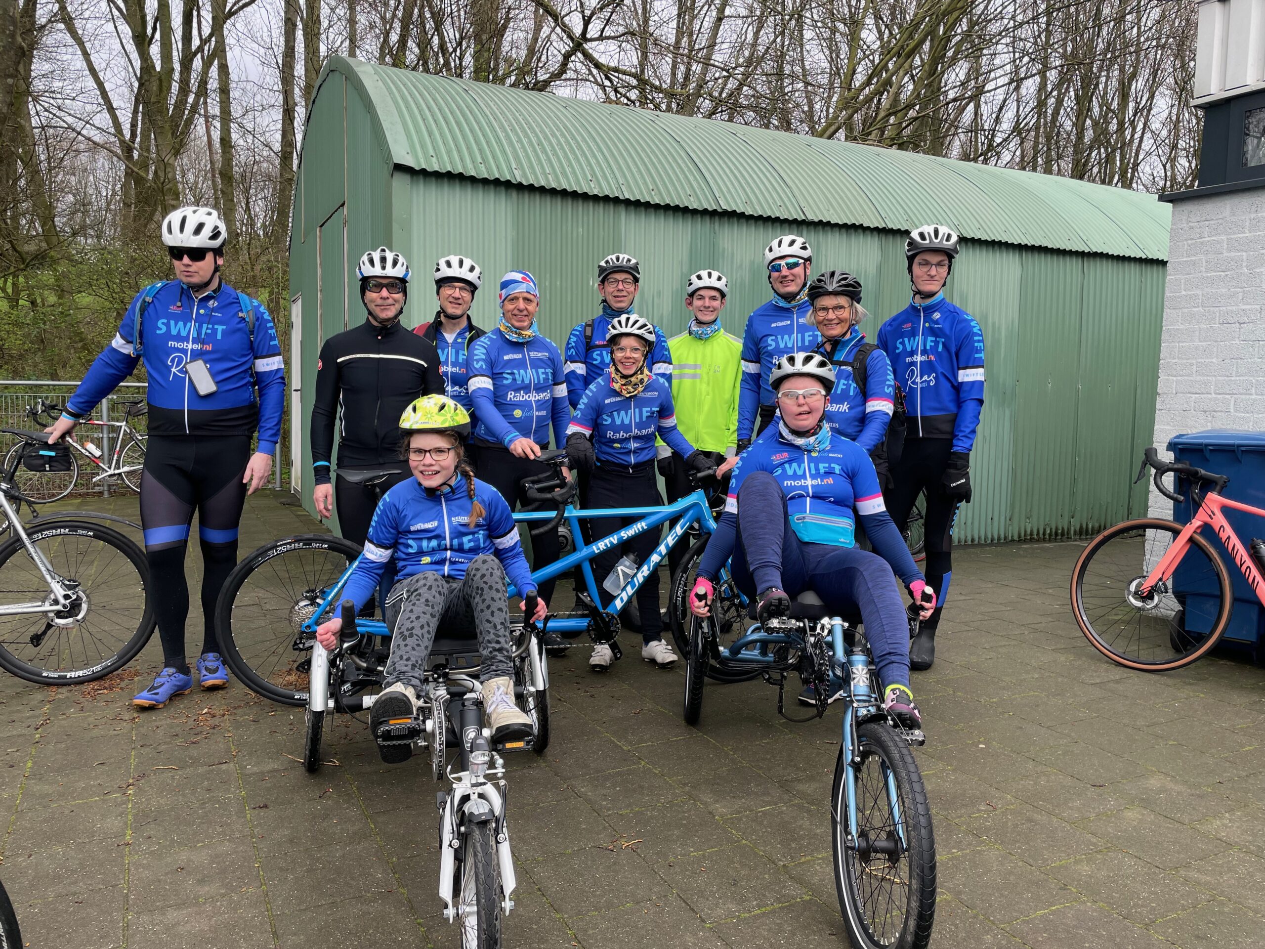 Eveline is met een hele groep van het aangepast wielrennen van Swift. “We trainen elke woensdag van 18.00-19.00 uur. Iedereen is welkom.” Ze rijdt 75 km. “Ik doe al voor de vijftiende keer mee denk ik. Al van jongs af aan rijd ik de Joop Zoetemelk Classic.” Ook als het koud, nat en winderig is, want Eveline is een echte bikkel. “Zeker weten.”