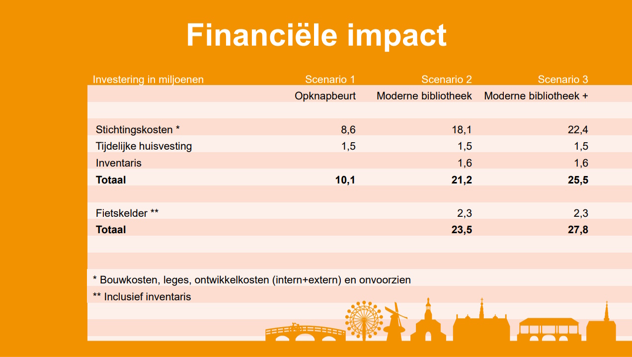 Bij de meest ingrijpende variant trekt Leiden de portemonnee voor 27,8 miljoen euro als ook de fietsenkelder wordt meegenomen. Alle bedragen zijn wel inclusief inrichtingskosten en een bedrag van anderhalf miljoen voor de tijdelijke huisvesting van de bibliotheek. Tijdens de verbouwing die zomaar anderhalf jaar kan gaan duren, moet de bieb wel gewoon open blijven. De investering betekent dat de gemeente 36 jaar lang 748.000 euro op de begroting moet vrijmaken voor de rente en het afbetalen van de benodigde lening. Bij de middenvariant gaat het om 554.000 euro.