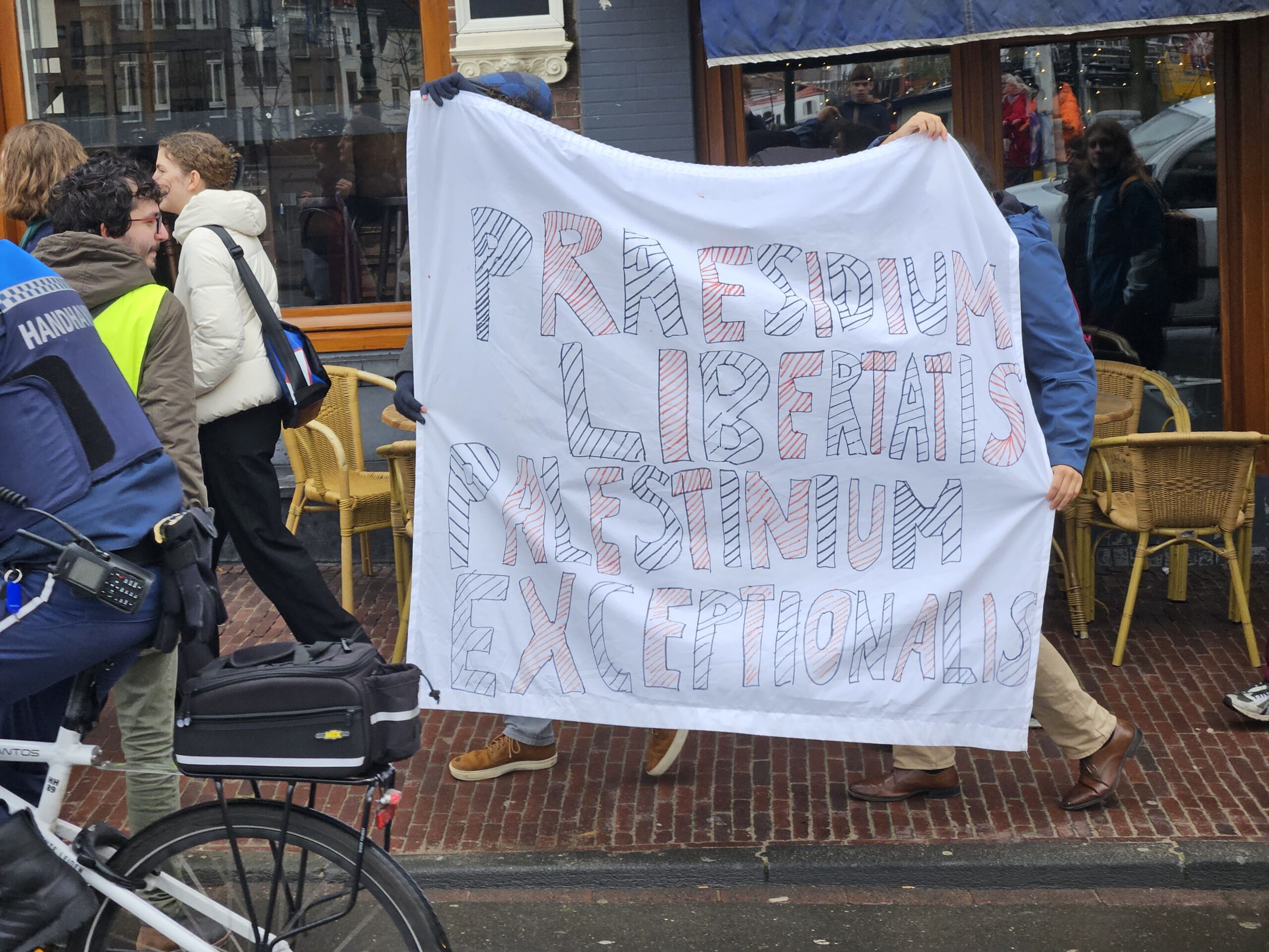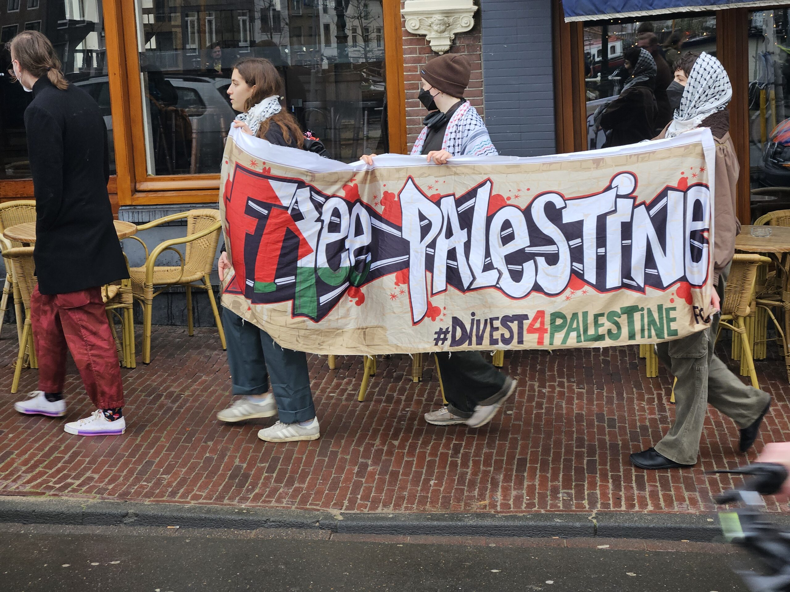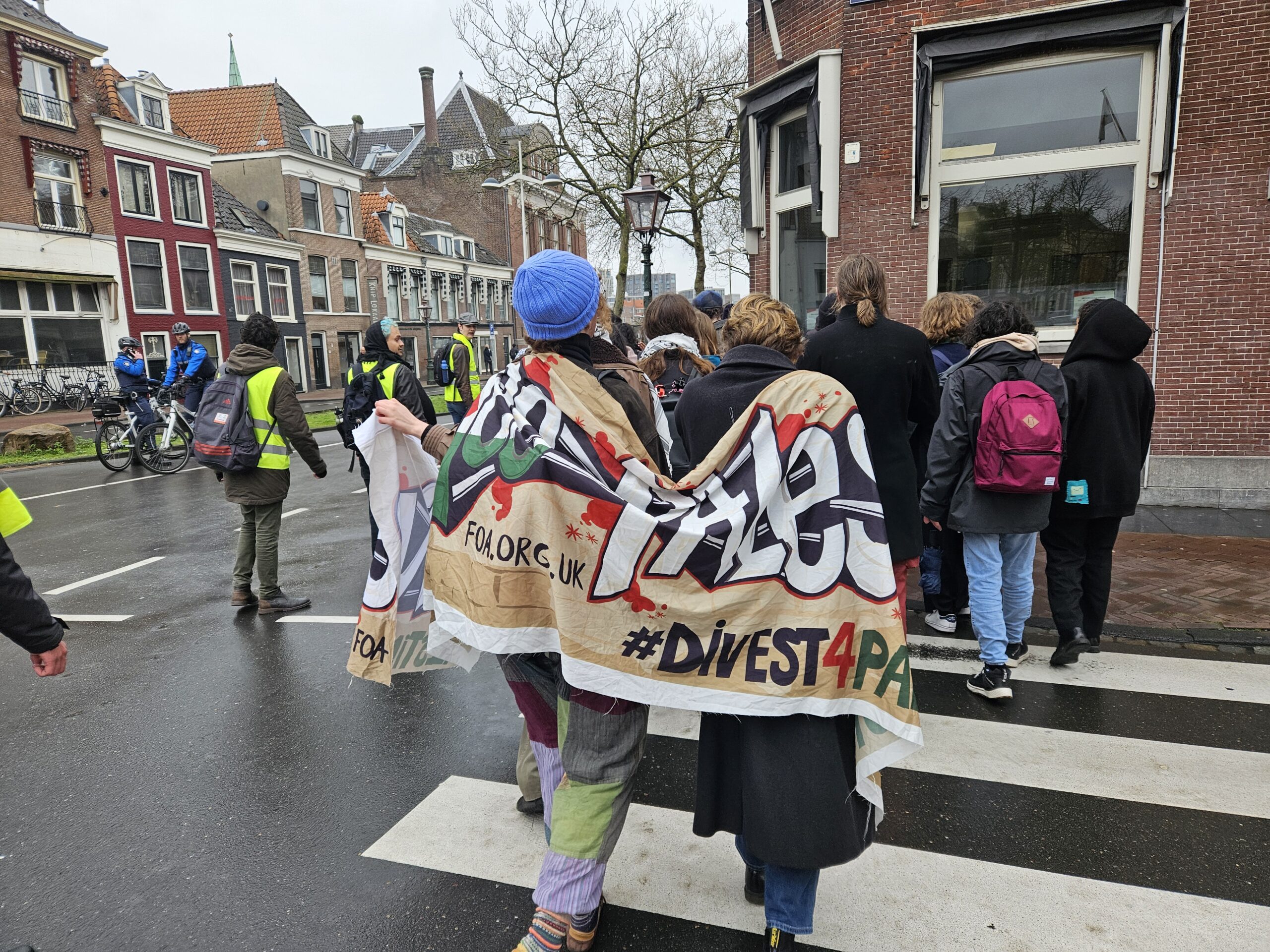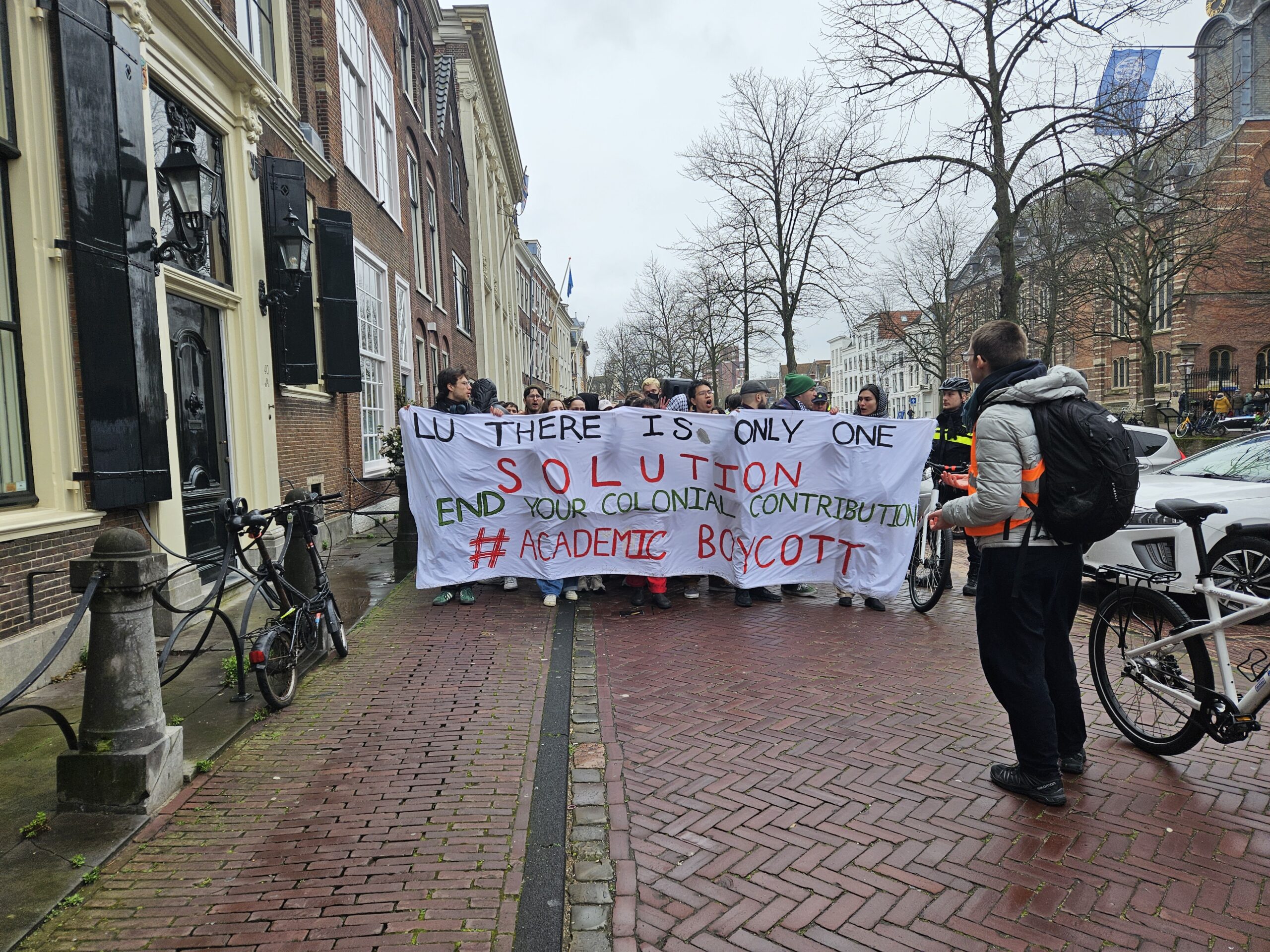 De studenten begonnen hun protestmars naast het Lipsius-gebouw en liepen langs het Academiegebouw via het Rapenburg in de richting van Leiden Centraal. Tientallen demonstranten deden mee. “Een academische boycot houdt in dat Universiteit Leiden de banden verbreekt met zionistische instituties die medeplichtig zijn aan de bezetting van Palestina”, legt woordvoerder Evalien uit. Als voorbeeld hiervan verwijst ze naar Israëlische universiteiten die zijn gebouwd op de Westelijke Jordaanoever. “Dat deze universiteiten daar gebouwd zijn, gaat tegen het internationaal recht in.”