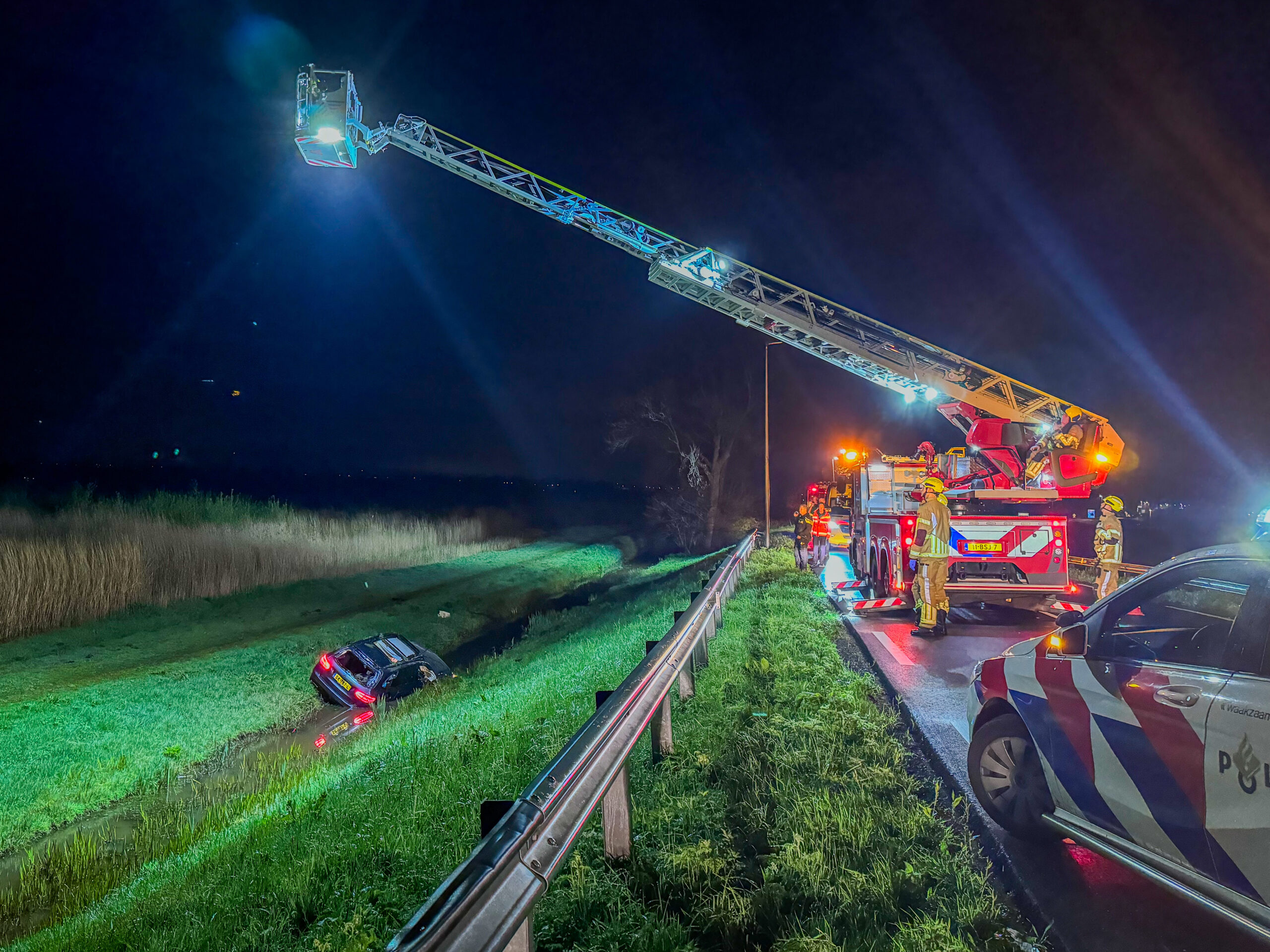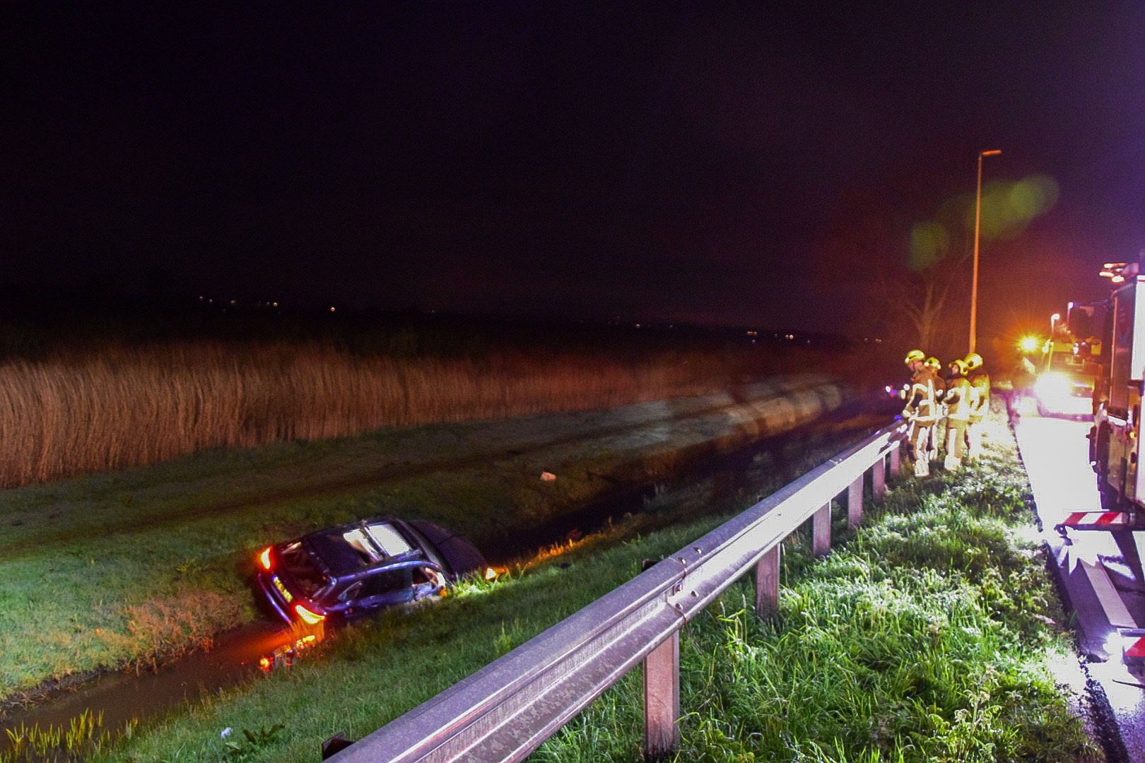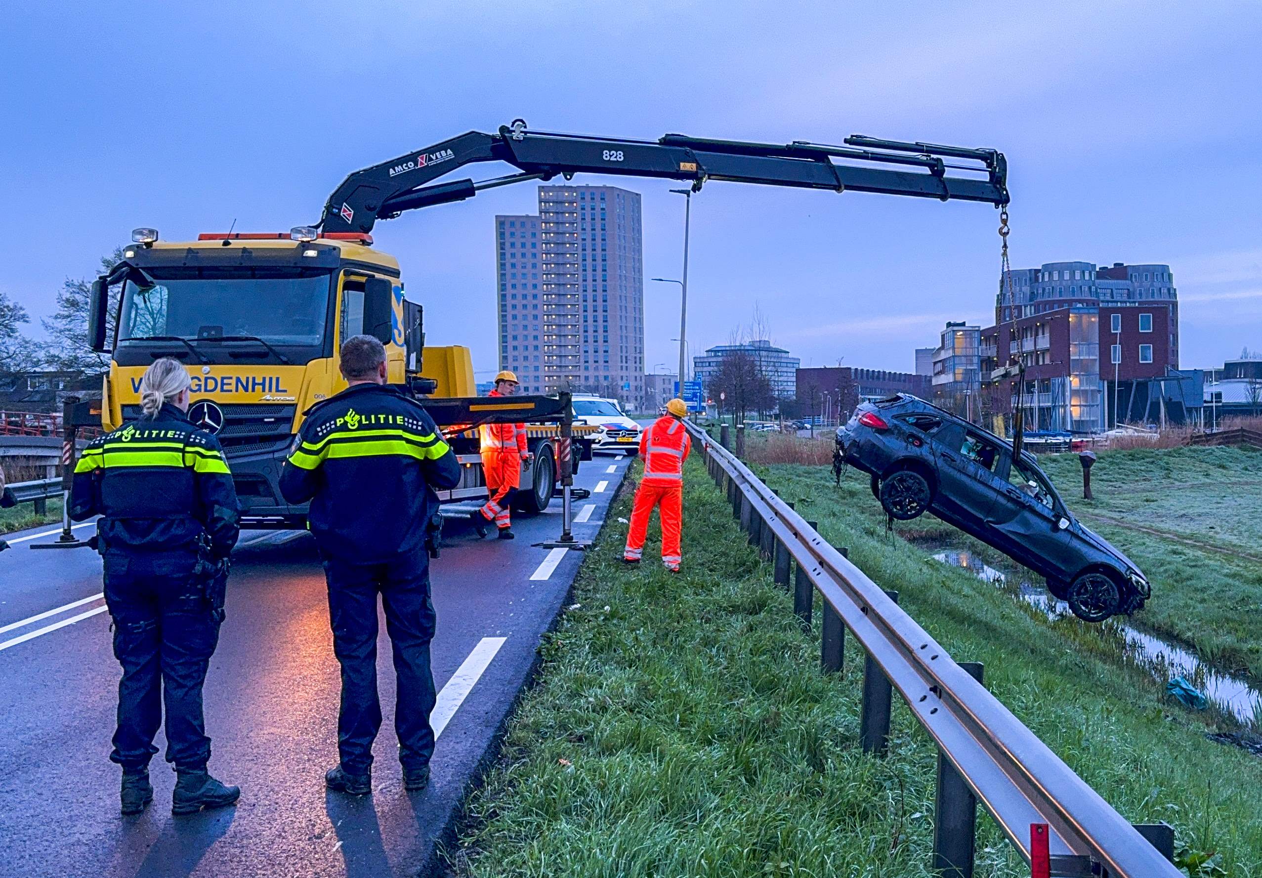 Een automobilist is vanmorgen vroeg even voorbij de ‘koeienrotonde’ op de Oude Spoorbaan in Leiderdorp van de weg geraakt. De auto schoot over de vangrail van het talud af en kwam zwaar beschadigd in een sloot terecht. Van de bestuurder ontbreekt elk spoor.