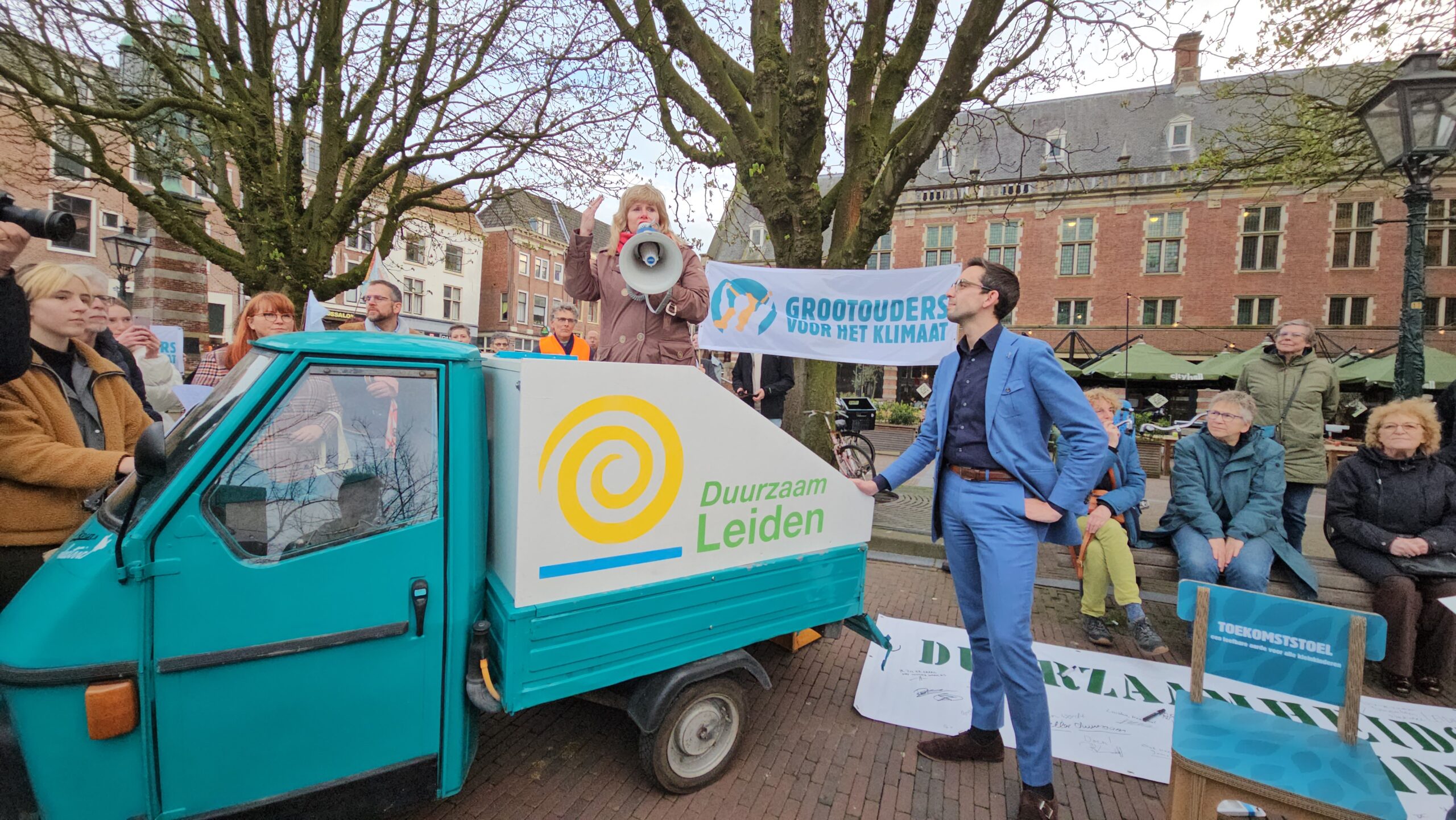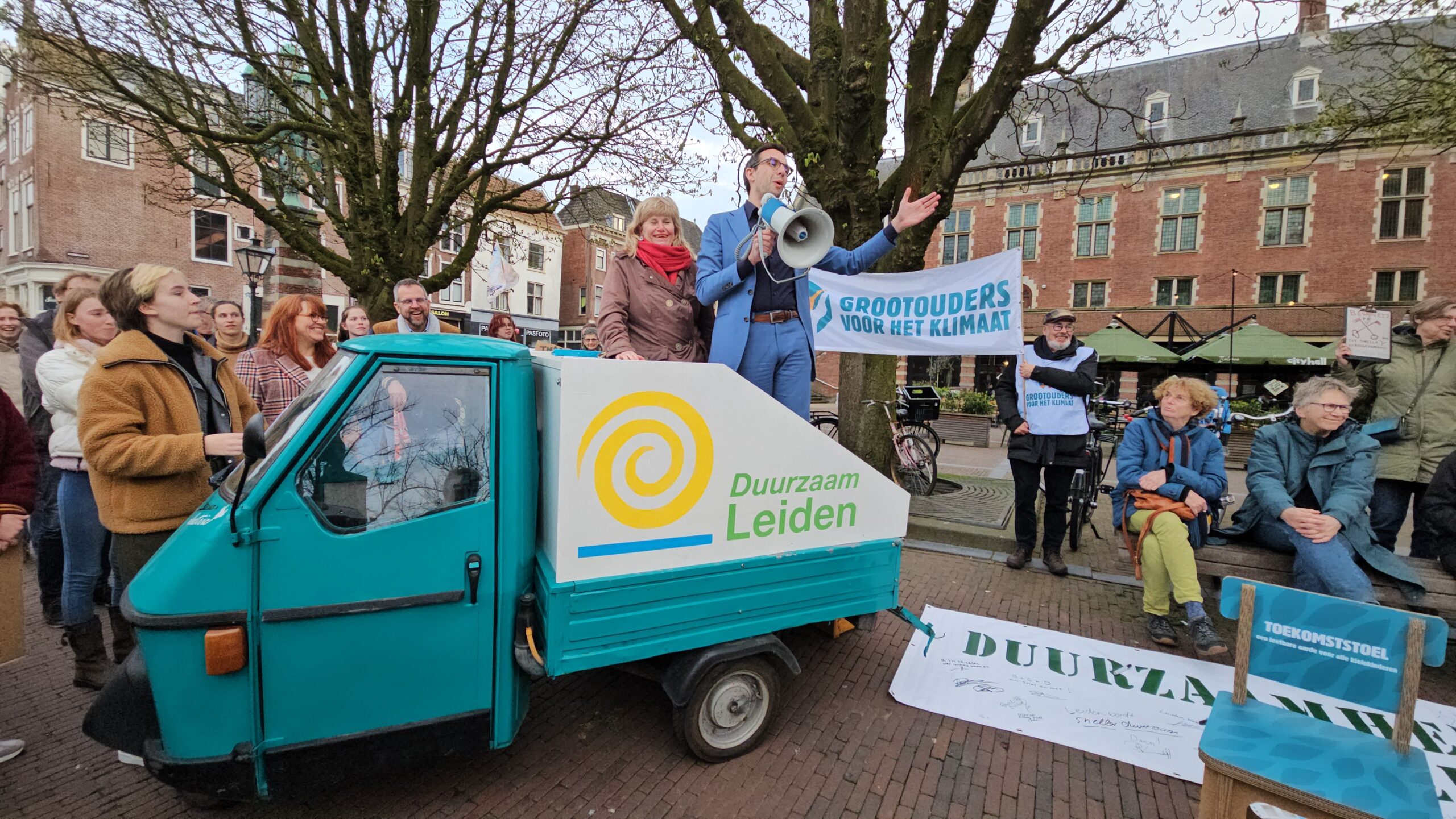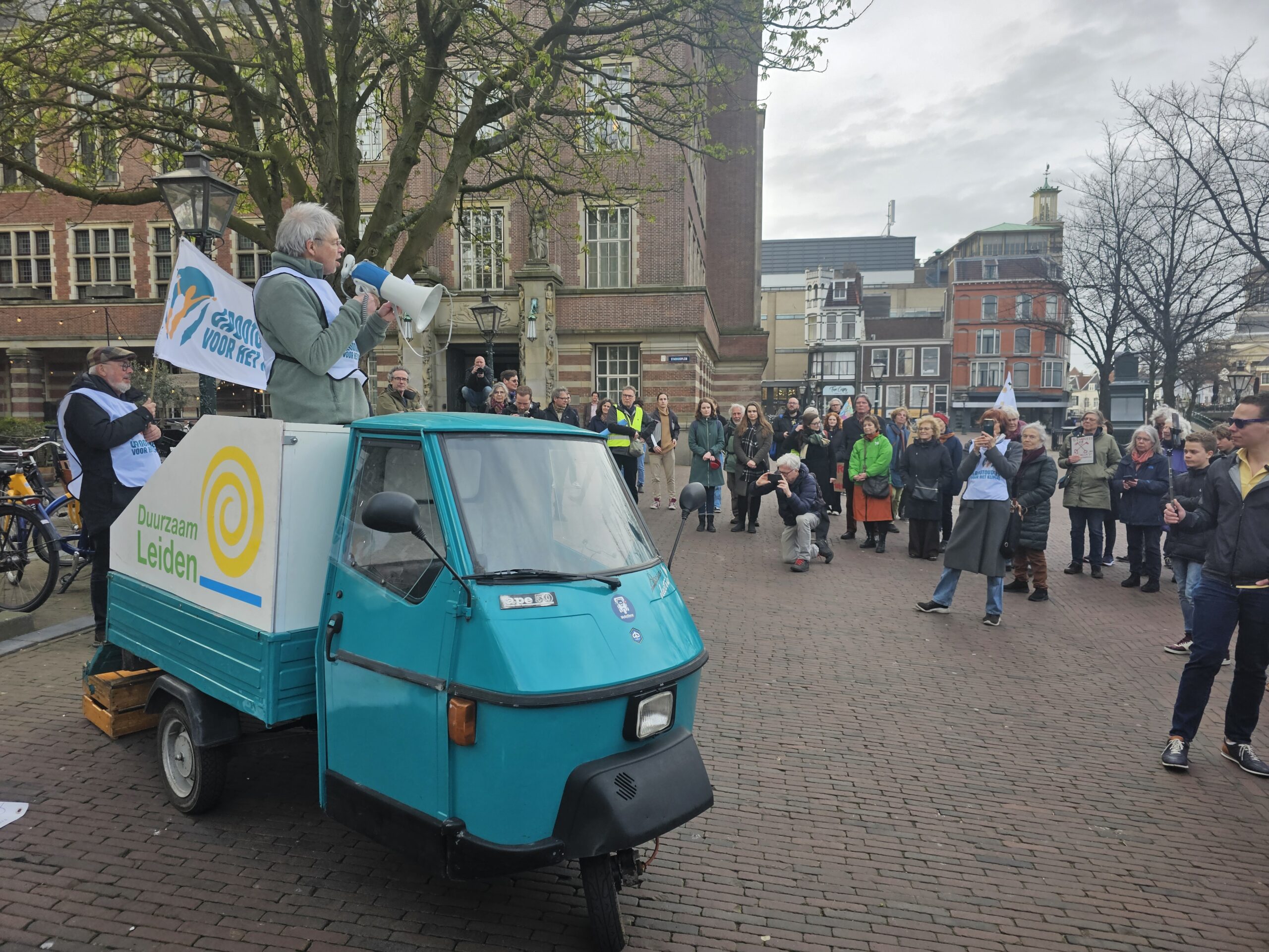 “Het Volkshuis is geloof ik inmiddels wel de oplossing van elke organisatie met een huisvestingsvraagstuk”, zegt wethouder Yvonne van Delft als ze vanaf een elektrisch wagentje de deelnemers aan de klimaatmars toespreekt. “Een andere en misschien wel goedkopere plek is ook goed”, opperde Maarten Stoffers van Leiden Sneller Duurzaam op zijn beurt. Of het duurzaamheidscentrum er komt, moet in de loop van het jaar duidelijk worden. De gemeenteraad buigt zich de komende tijd over de adviezen van het burgerberaad en een energieloket is door het college voorzien van het advies ‘nader te onderzoeken’.
