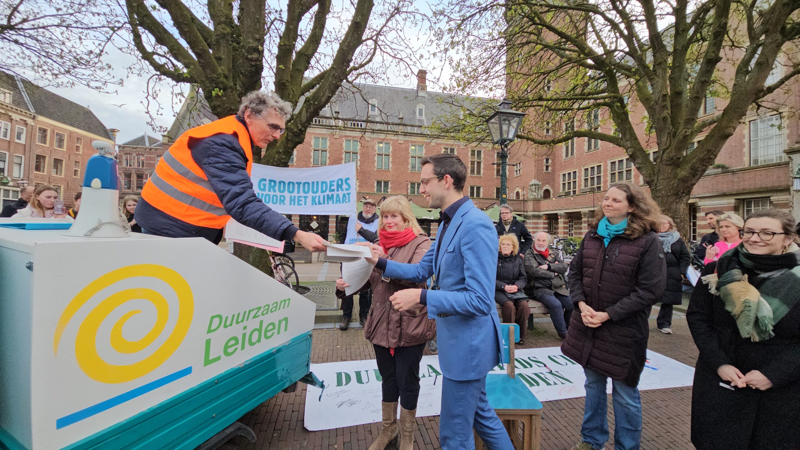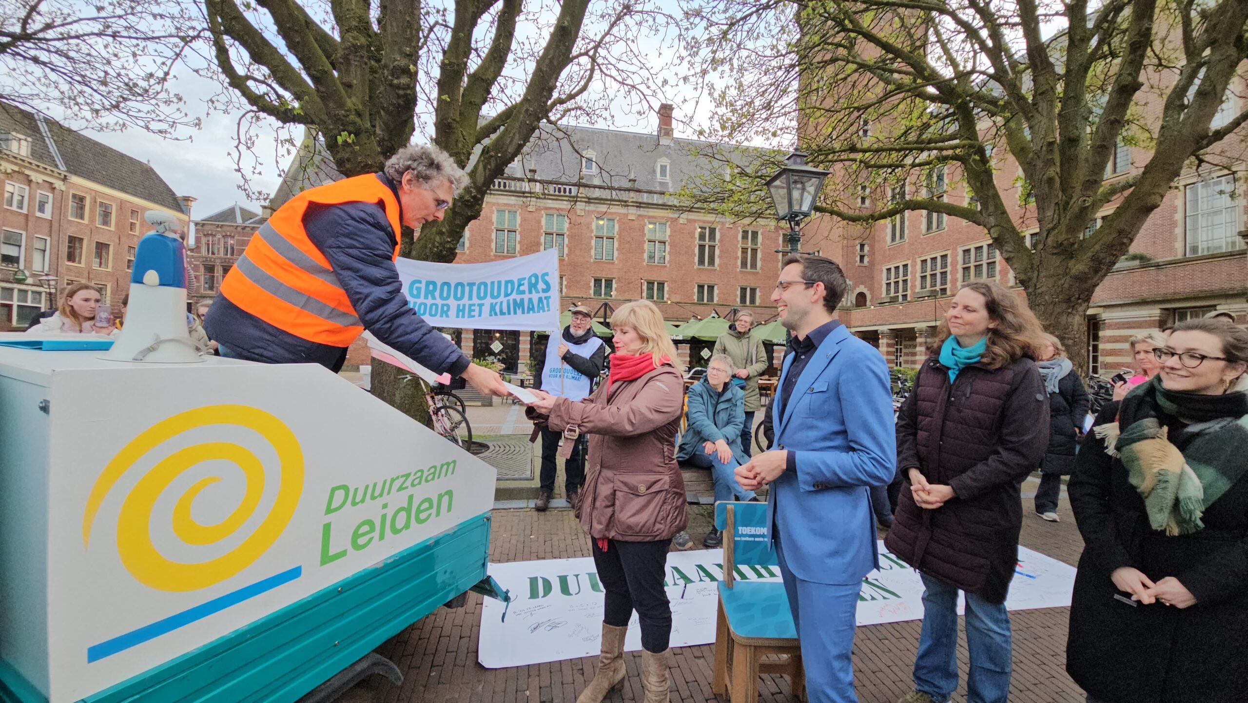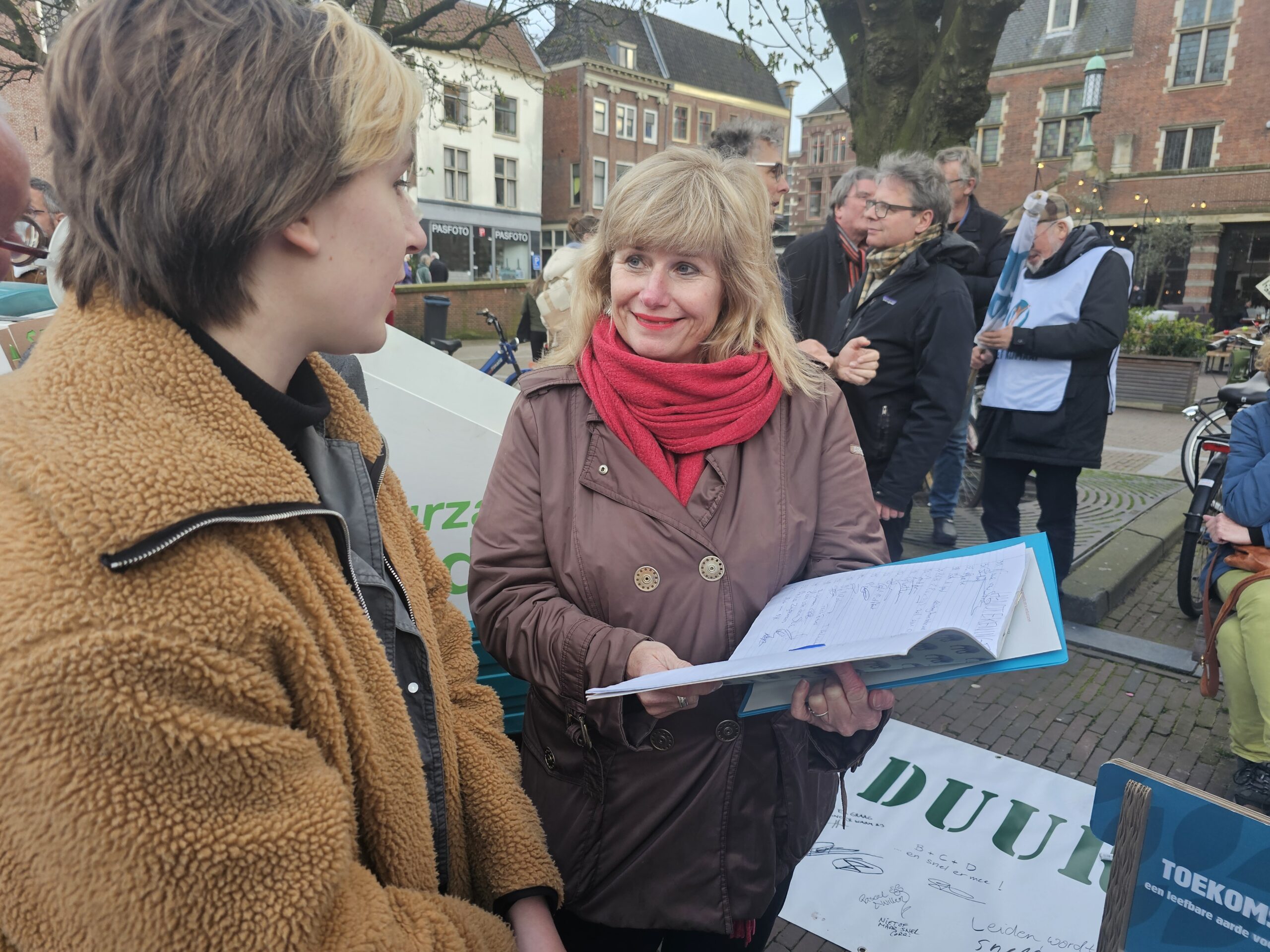 De GroenLinks-wethouders Yvonne van Delft (energie) en Ashley North (klimaat) namen de open brief van Leiden Sneller Duurzaam in ontvangst met daarin een oproep om een duurzaamheidscentrum in het leven te roepen.