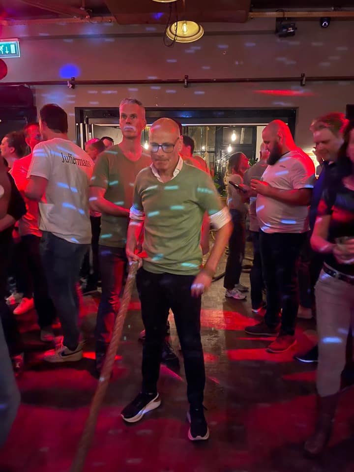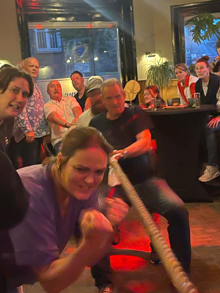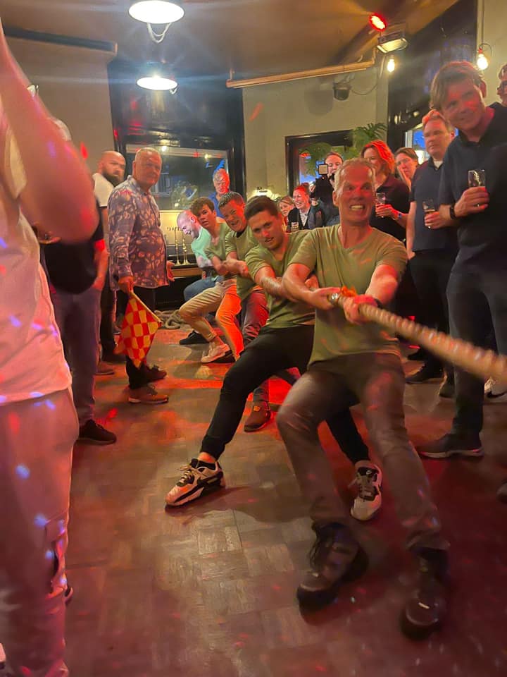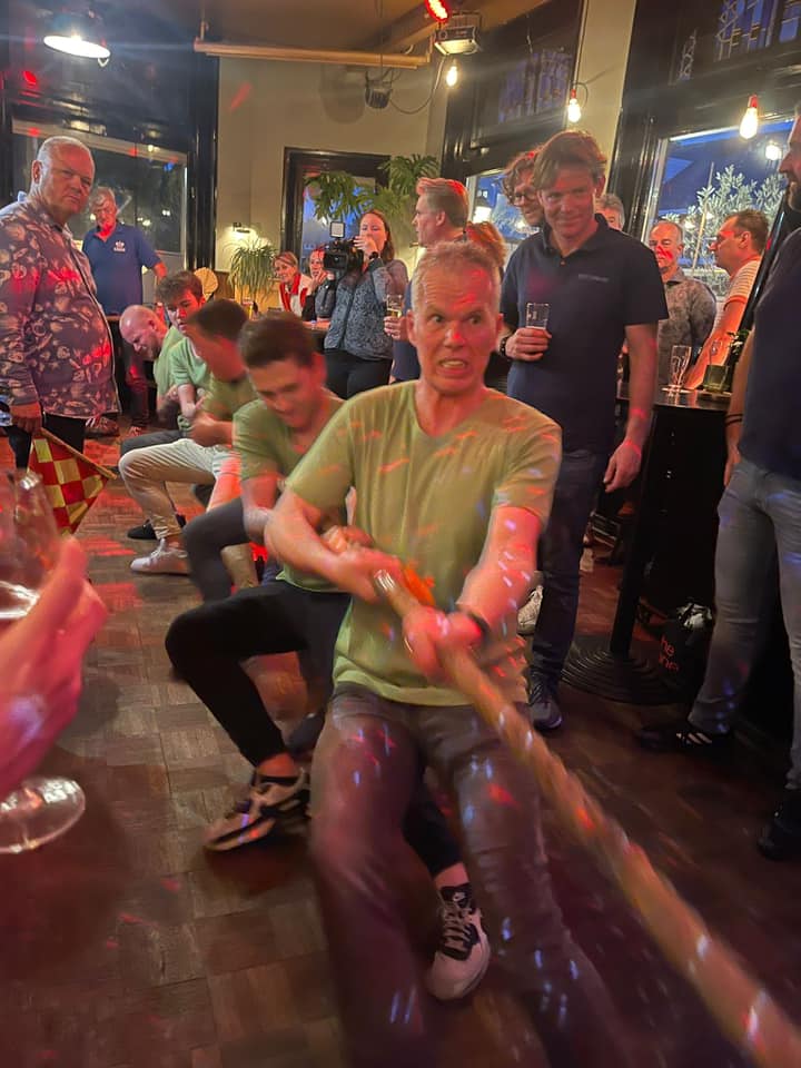Teams van collega’s en vrienden gingen afgelopen zaterdagavond de strijd met elkaar aan tijdens een touwtrekwedstrijd op een opmerkelijke plek in Oegstgeest – midden in café De Gouwe. Henk Heemskerk, samen met Herman Hoogervorst de organisator van het evenement, zegt al jaren bezig te zijn met touwtrekken. “We zijn door heel Nederland getrokken.”