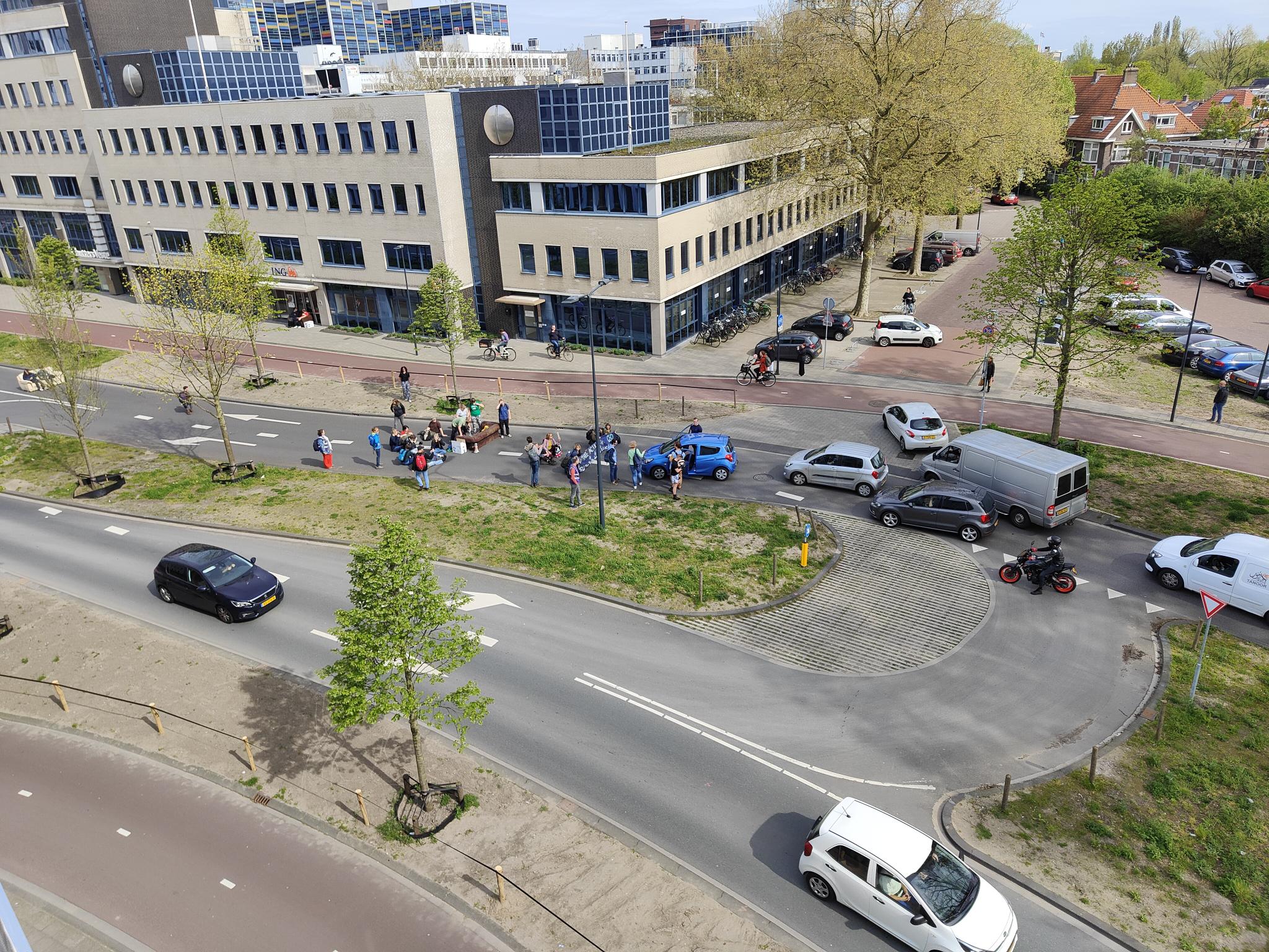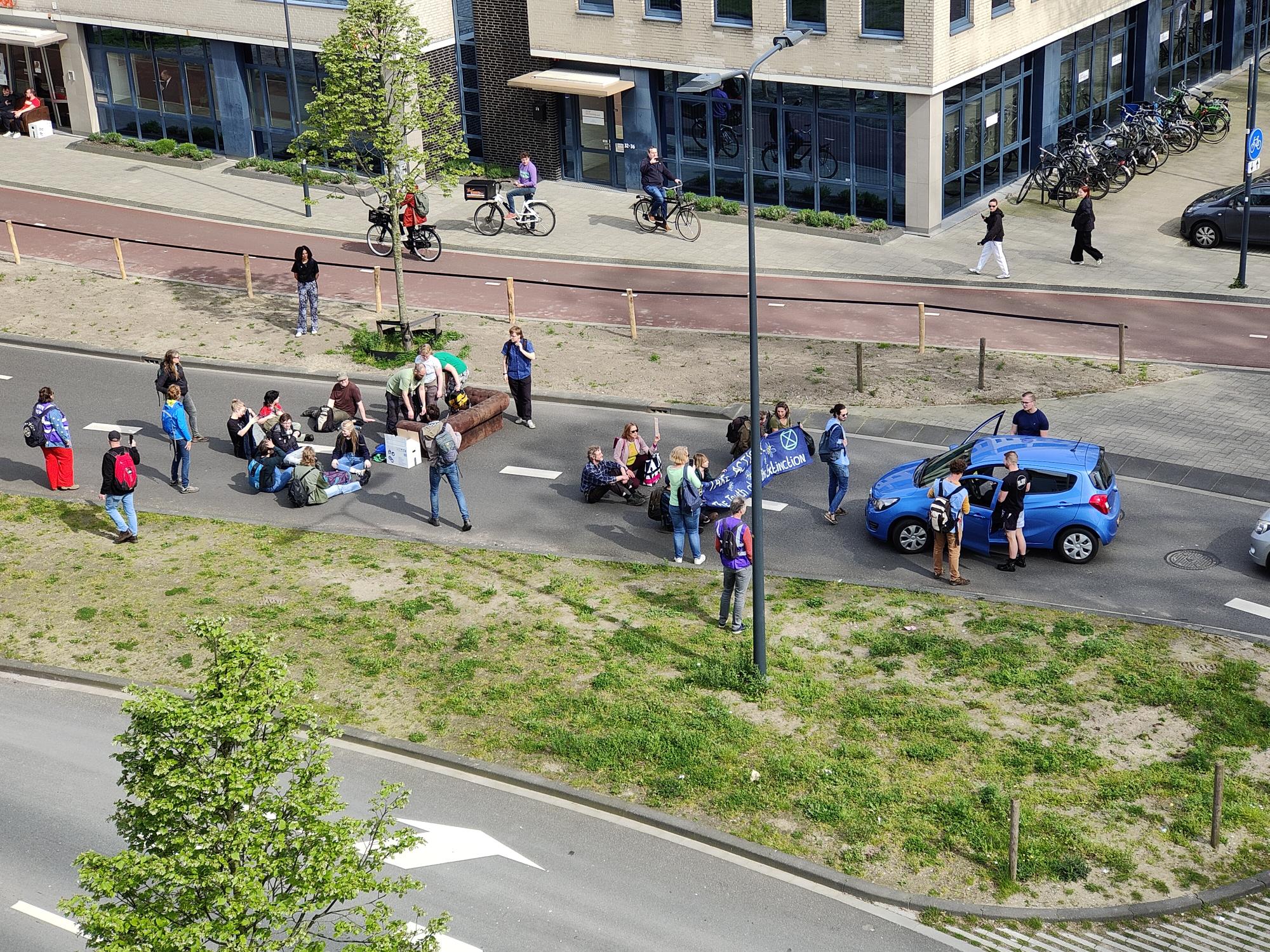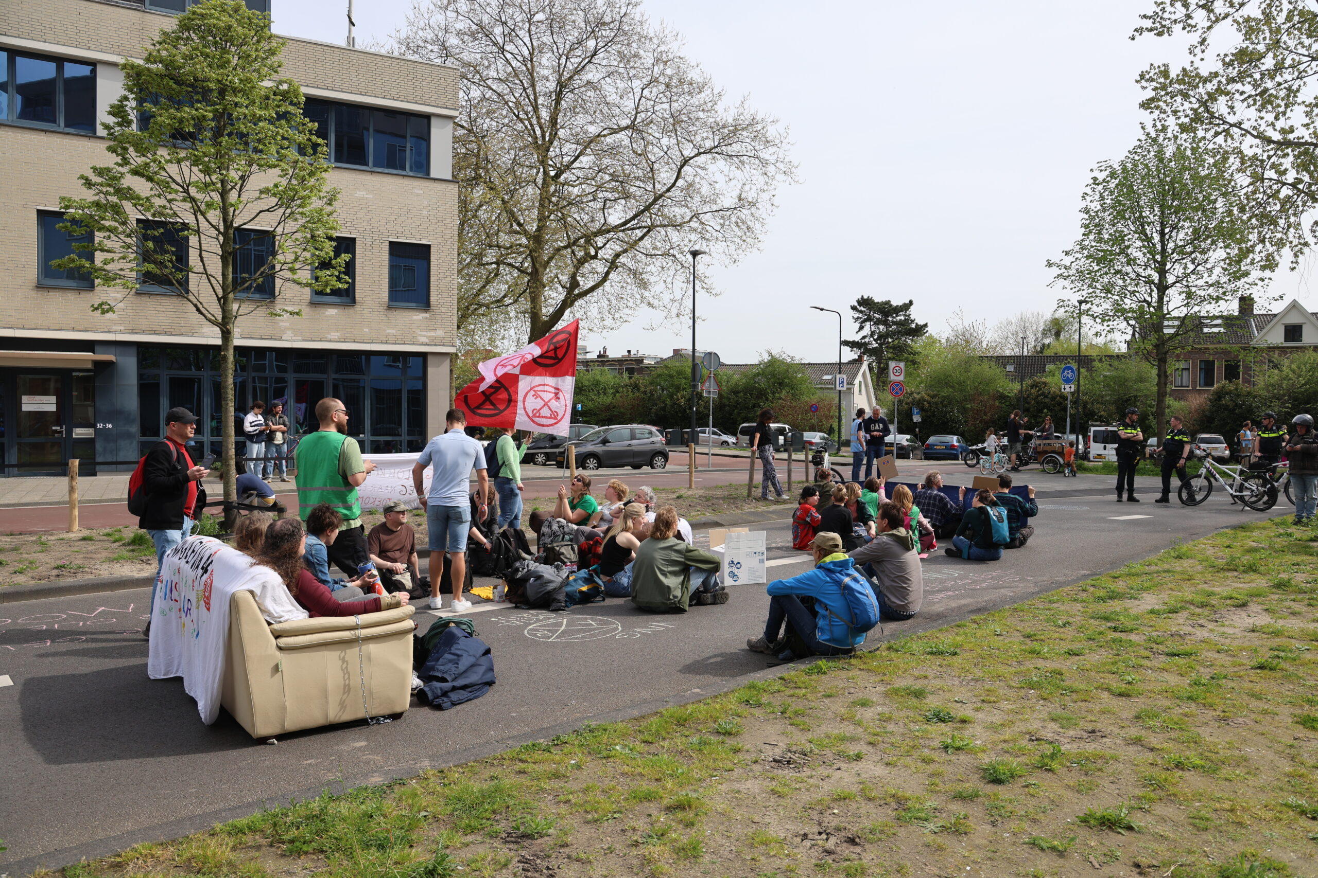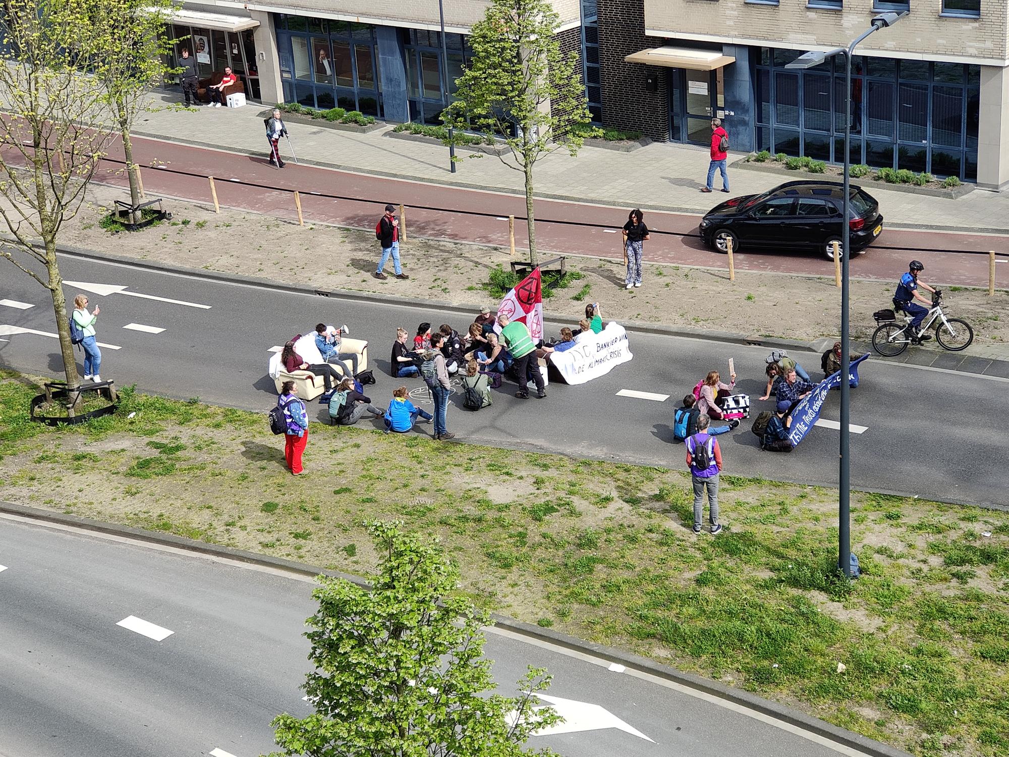 Extinction Rebellion Leiden heeft vanmorgen geprotesteerd bij het ING-kantoor aan het Schuttersveld. Zo’n veertig demonstranten blokkeerden met onder andere bankstellen de weg voor het verkeer. Ook lijmde een deel van de ‘Leidse Rebellen’ zich vast aan het wegdek.