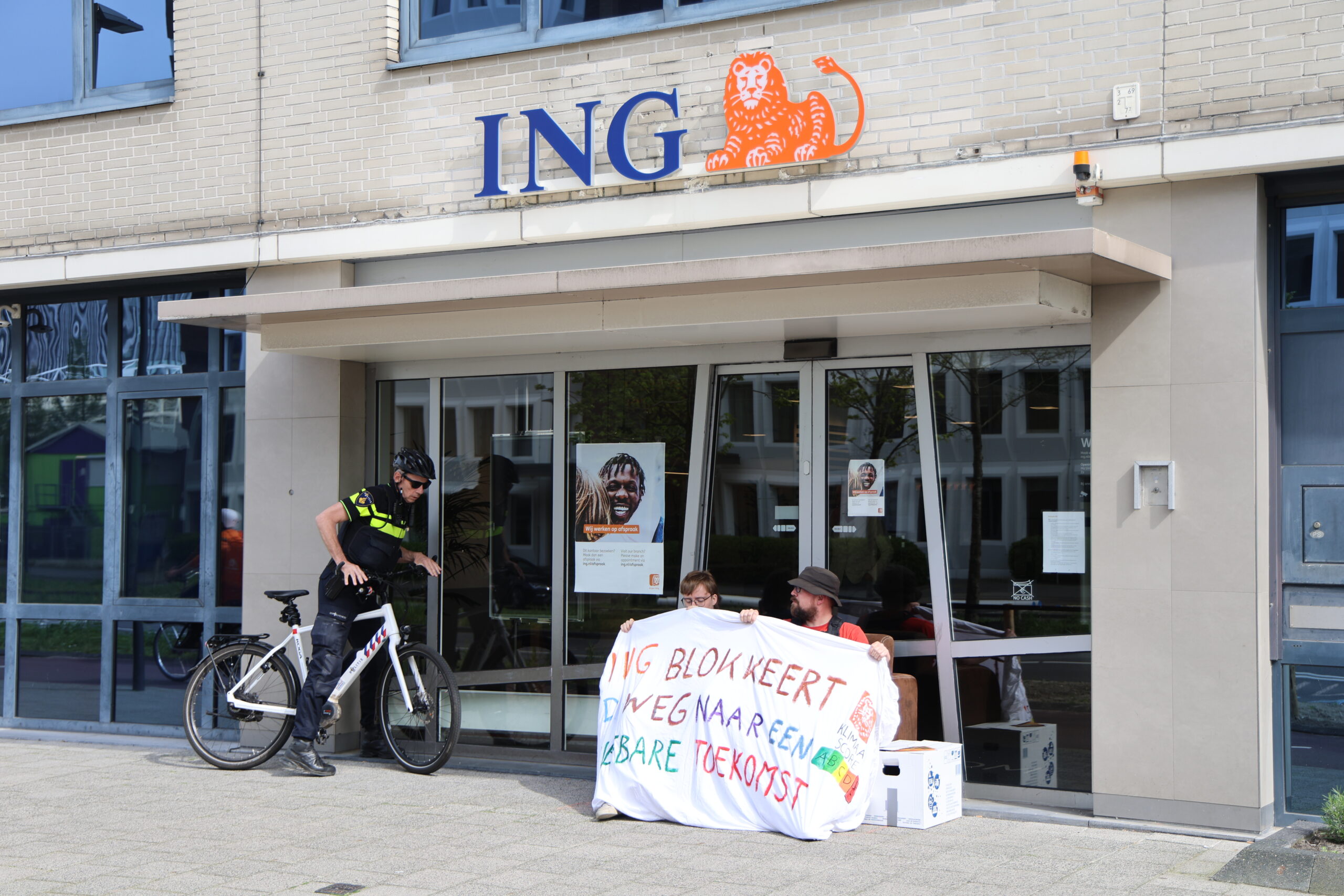 Met de demonstratie protesteerde XR Leiden tegen wat ze de ‘aanhoudende greenwashing-campagnes en het sponsoren van de fossiele industrie’ noemen. “We gaan niet weg vóór ING zijn rampzalige beleid aanpast en excuses maakt voor de schade die het al heeft aangericht door steun te geven aan gas en olie.”