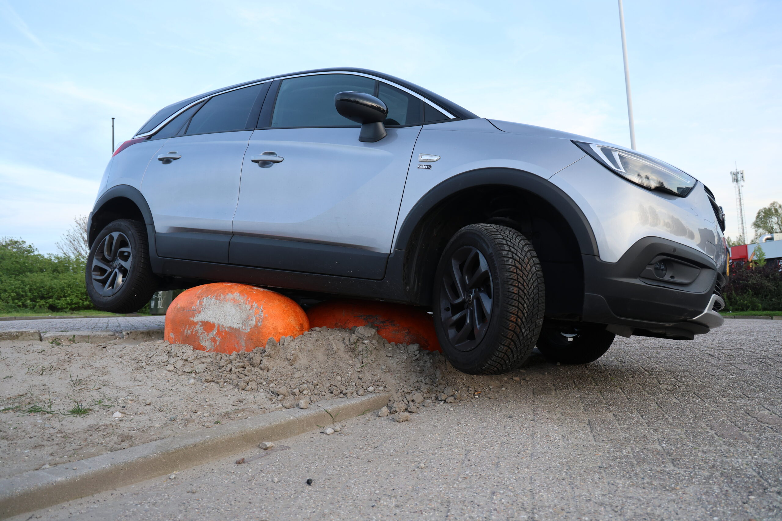 Een automobiliste heeft zaterdagavond haar auto vastgereden op een ‘varkensrug’ op het parkeerterrein aan de Persant Snoepweg in Leiderdorp. De vrouw heeft de bocht bij de op- en afrit van het terrein vermoedelijk te krap genomen, en kwam bovenop de betonblokken terecht. De auto raakte bij het ongeluk beschadigd, de bestuurder kwam met de schrik vrij.