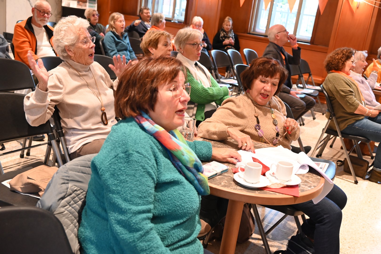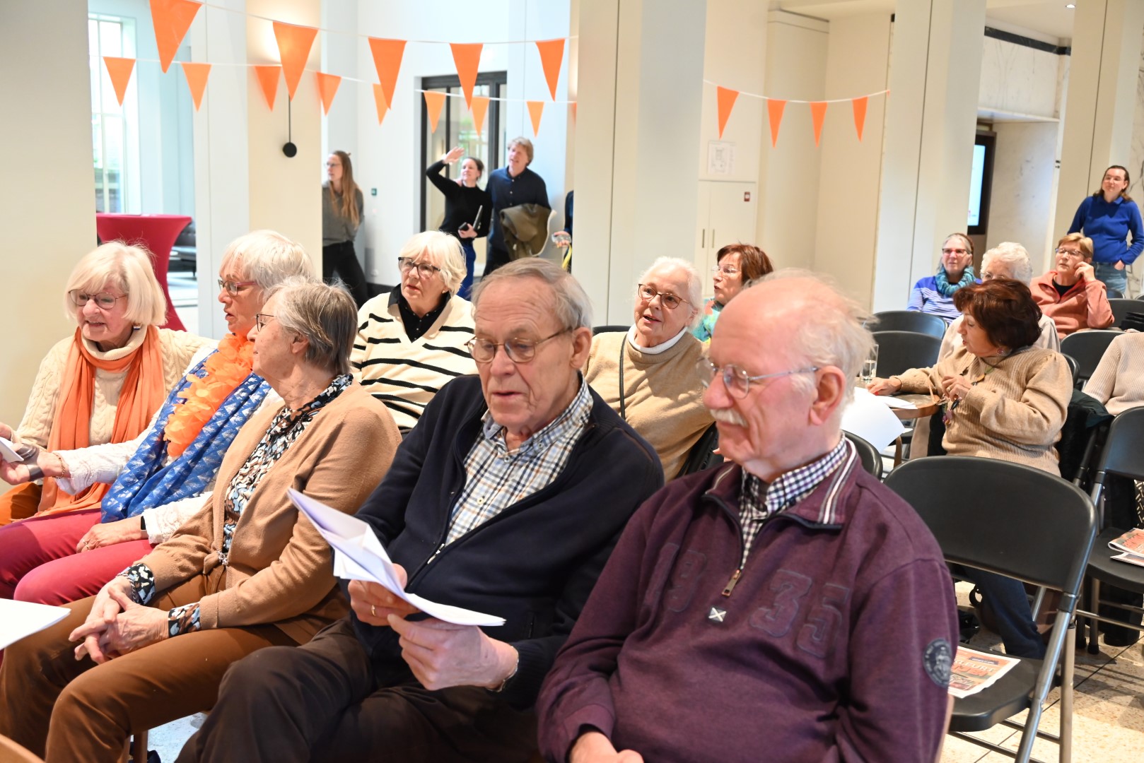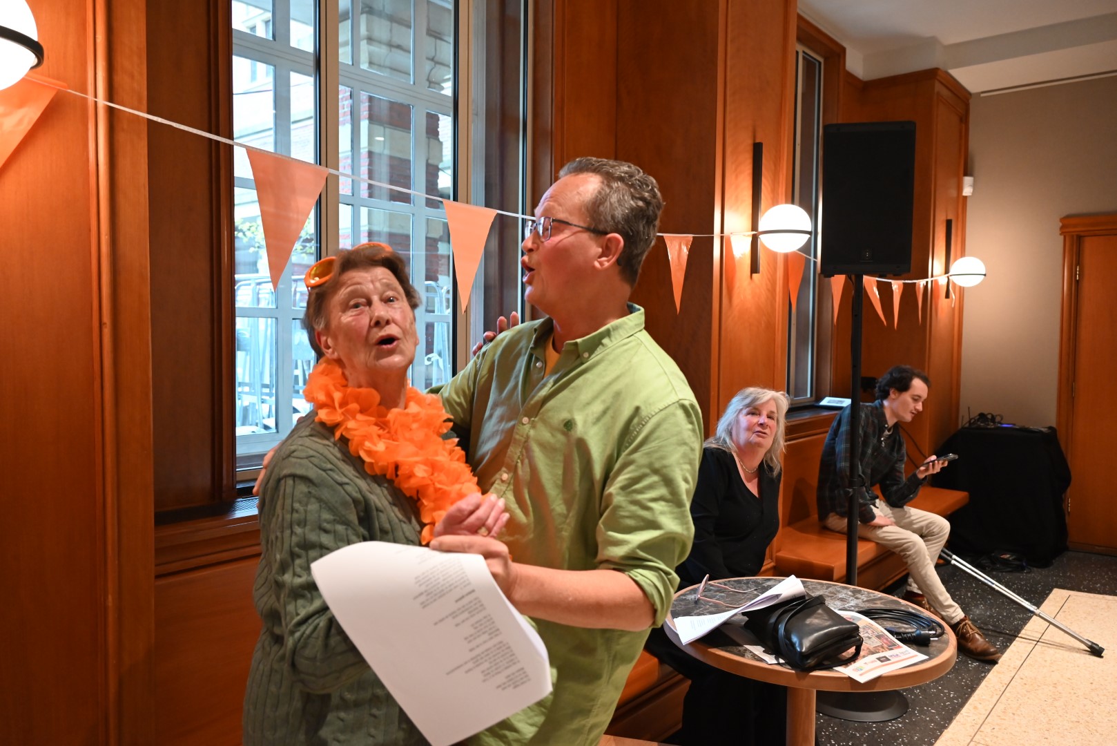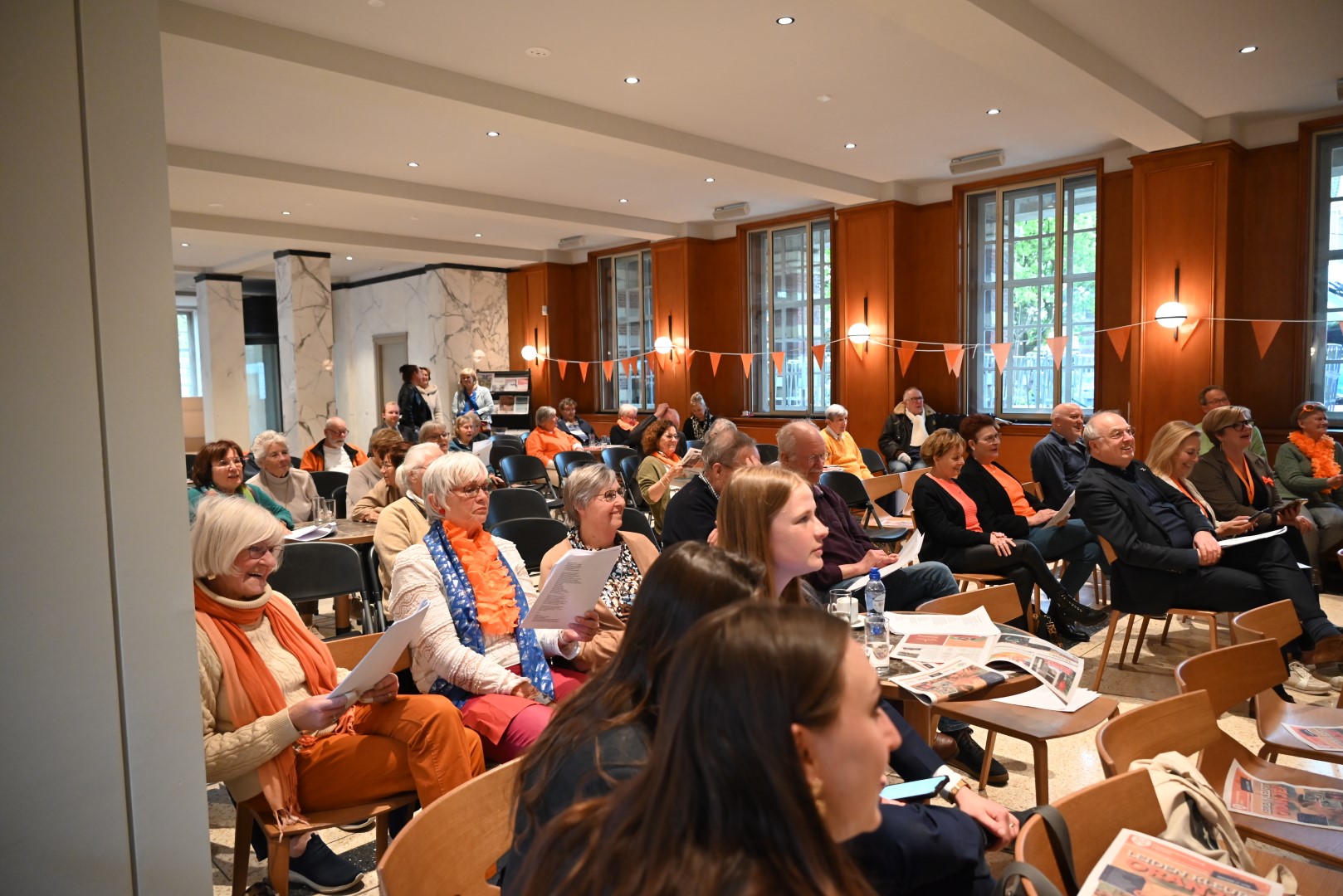 De Oranje Vereniging in Leiden hield donderdagmiddag voor de eerste keer een Meezingspektakel voor ouderen in de foyer van het stadhuis van Leiden. Tussen 14.00 en 16.00 uur waren alle zestigplussers van Leiden uitgenodigd mee te doen met dit gratis meezingfeest.