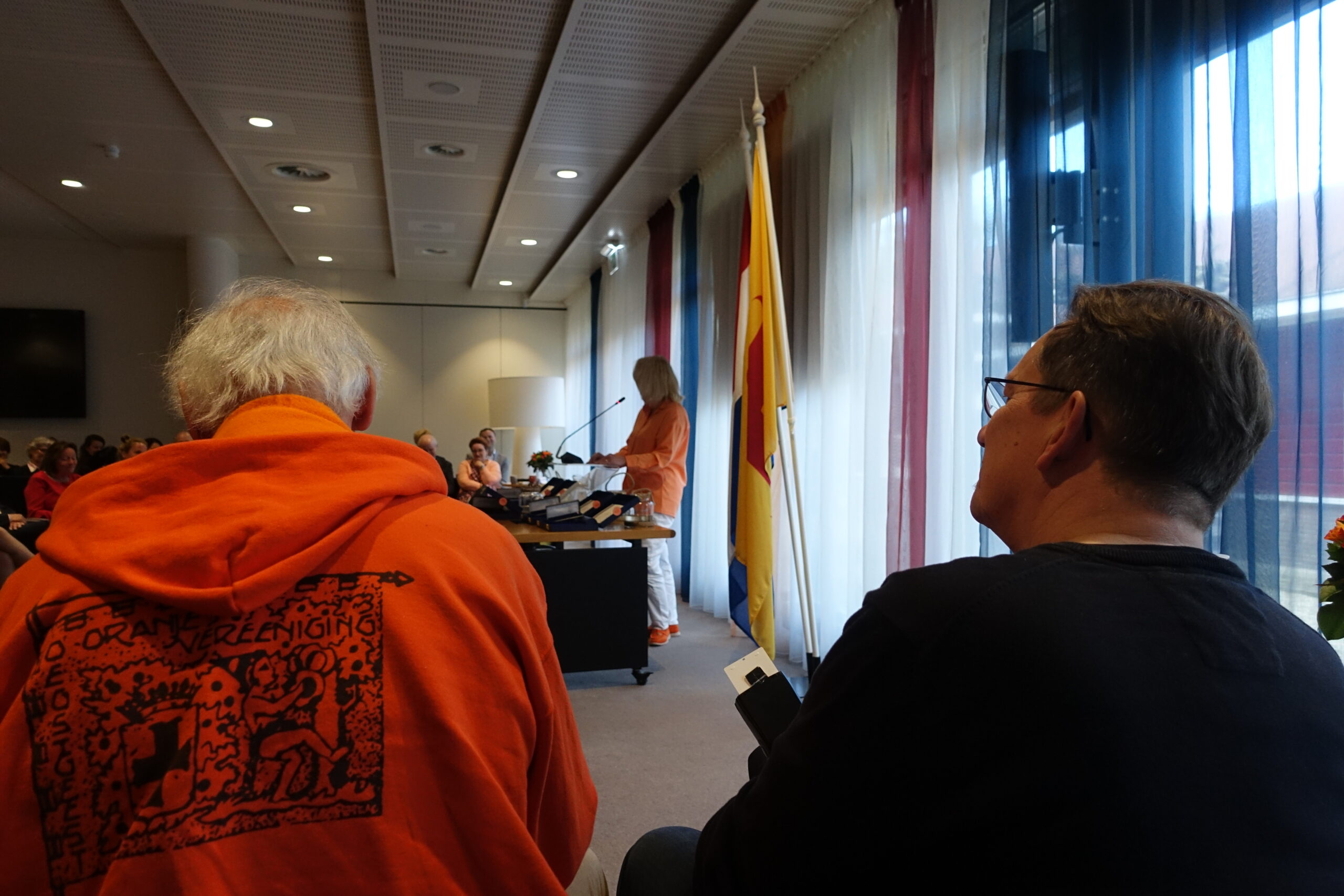 De ceremonie vond plaats in de raadszaal van het gemeentehuis van Oegstgeest. Deze zaal zat afgeladen vol met familie, vrienden en collega’s van de gedecoreerden. Hier werden de, tot vanmorgen bijna allemaal onwetende, gedecoreerden een voor een toegesproken door burgemeester Jaensch. Na afloop richtte ook voorzitter van de Oranjevereniging Oegstgeest Linda van der Zon zich tot de aanwezigen. Van haar kregen de gedecoreerden ook nog een oranje sjaal en een uitnodiging voor een ontbijt bij FC Oegstgeest op de ochtend van Koningsdag.