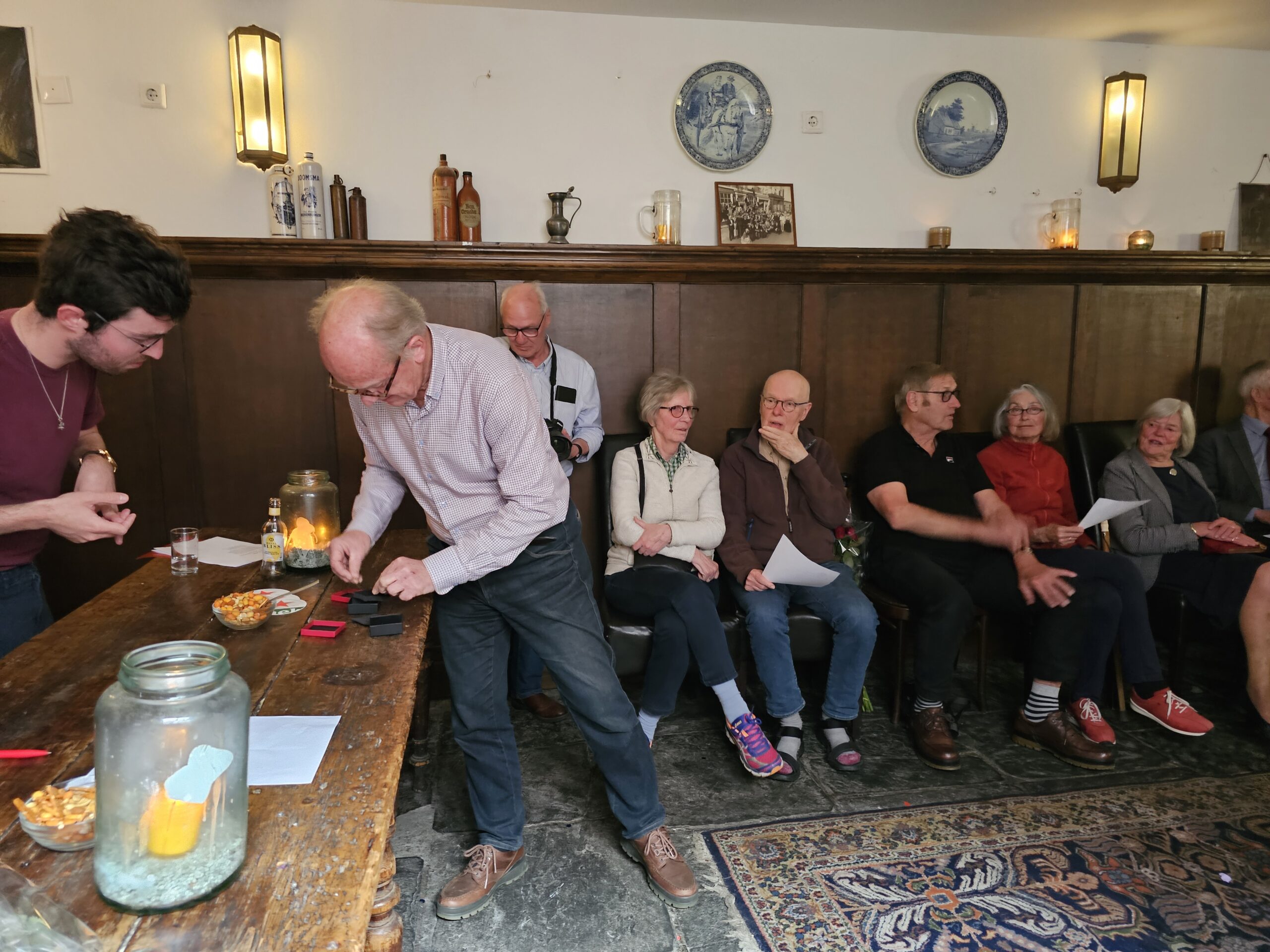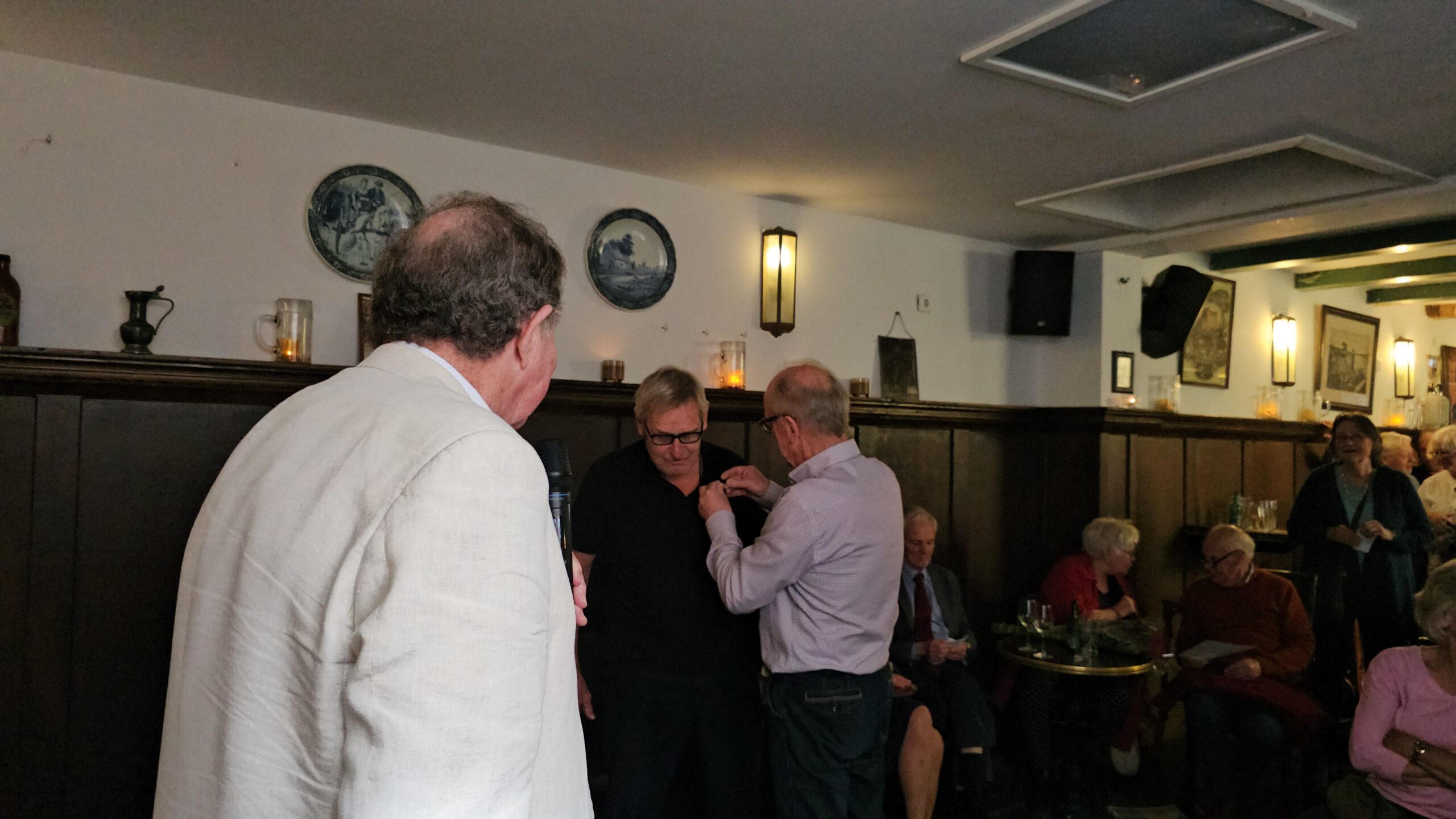 Onder de aanwezigen ook burgemeester Peter van der Velden die een aantal trouwe leden een PvdA-insigne opspeldde. Zilver voor 25 jaar lidmaatschap en goud voor een enkeling die al een halve eeuw contributie betalen.