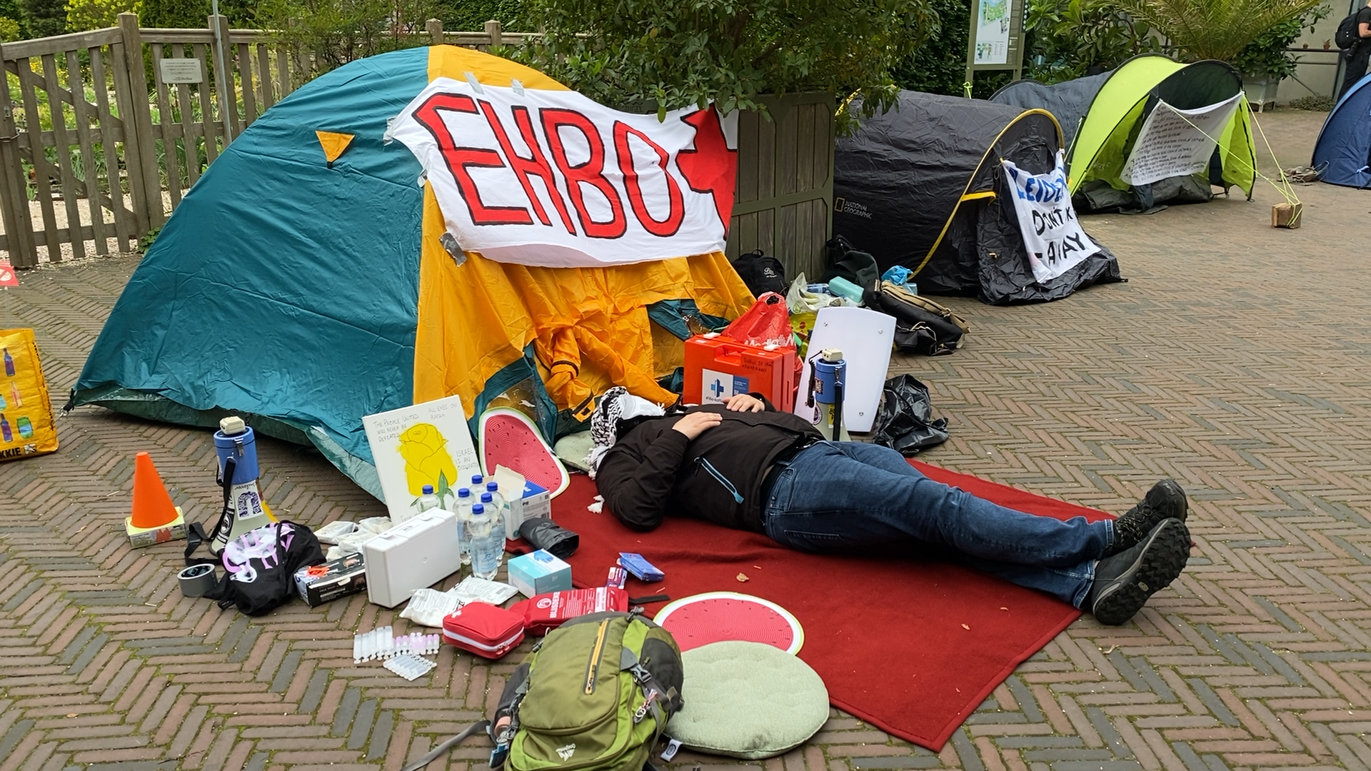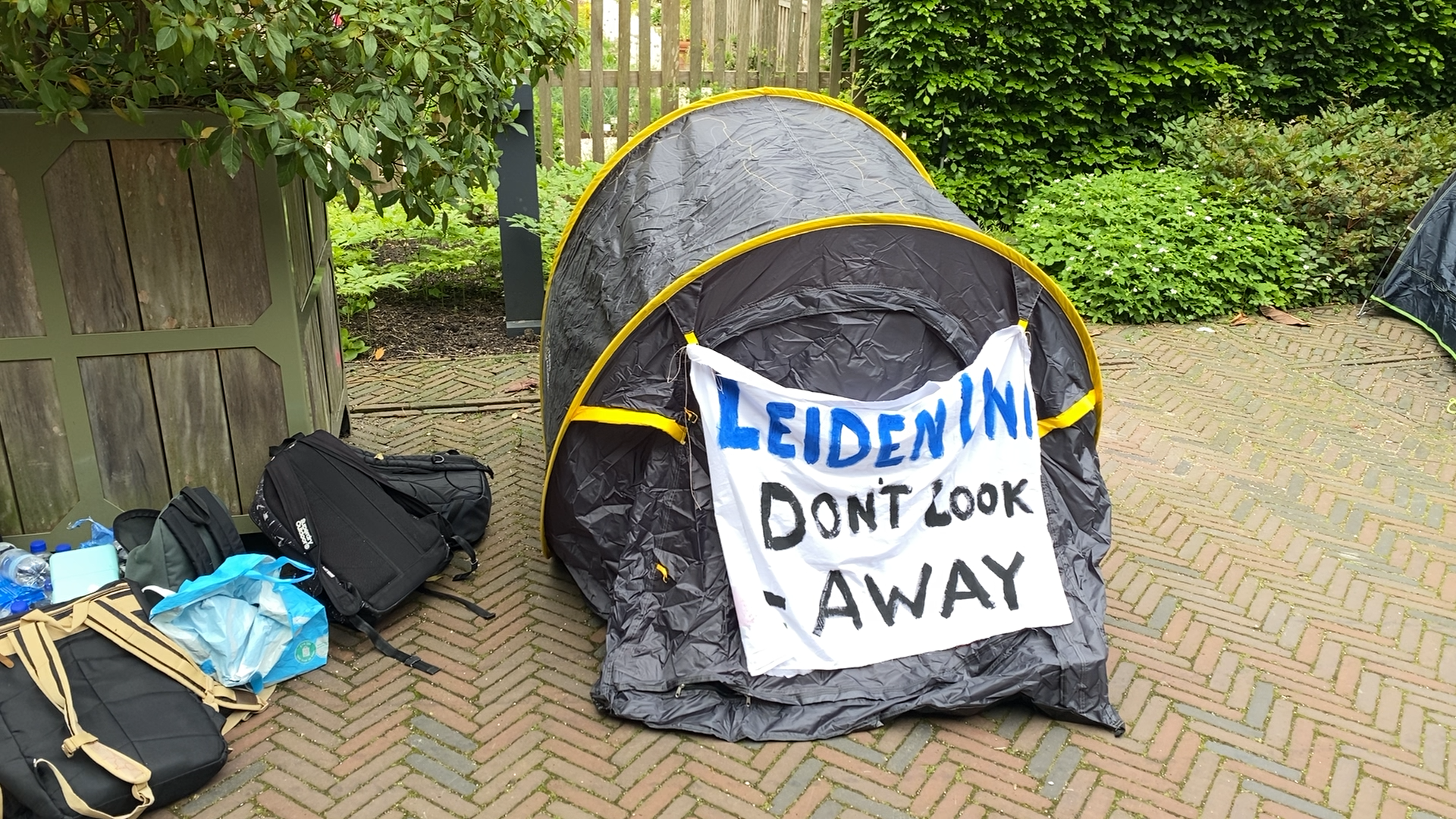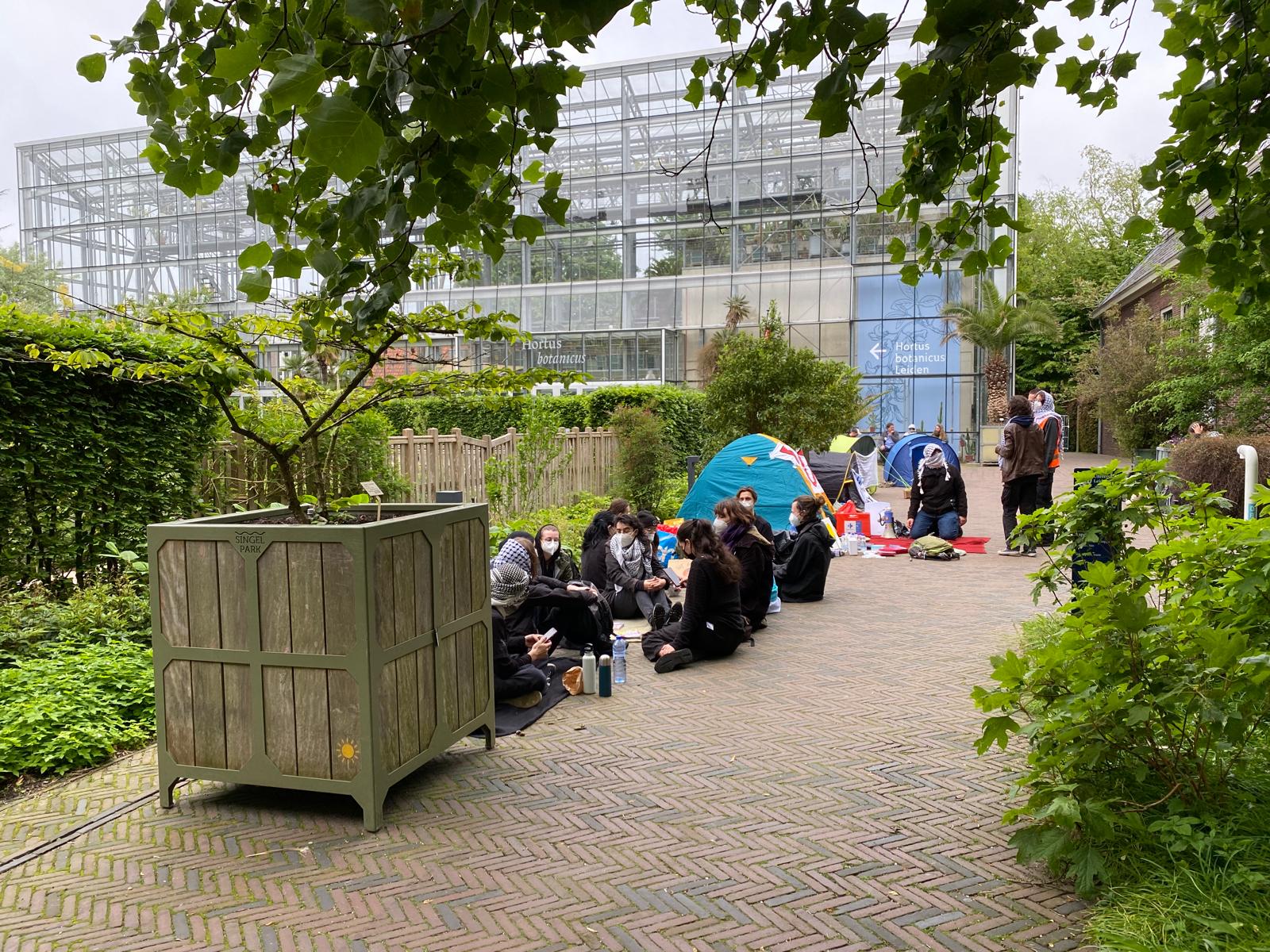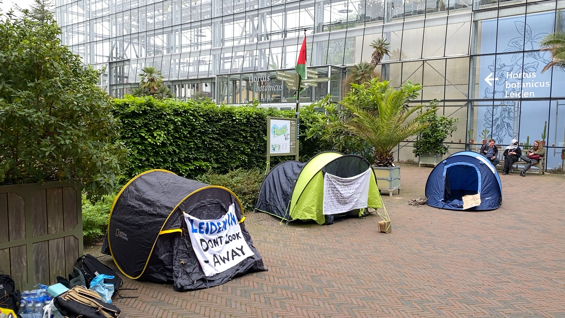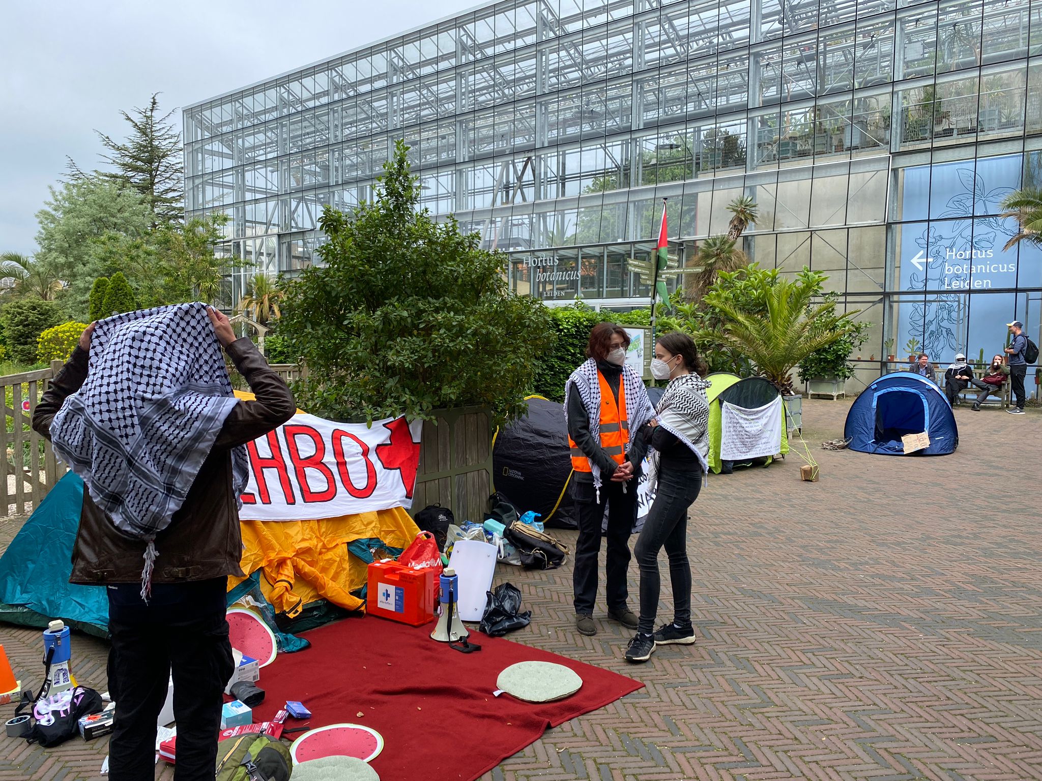 Na de bezetting van het Haagse Wijnhaven-gebouw van donderdag voeren activisten van Students for Palestine vrijdagochtend actie in de Leidse Hortus Botanicus. Enkele tientallen demonstranten hebben tenten opgezet en spandoeken opgehangen. De groep noemt zich ‘Leiden Student Encampment’