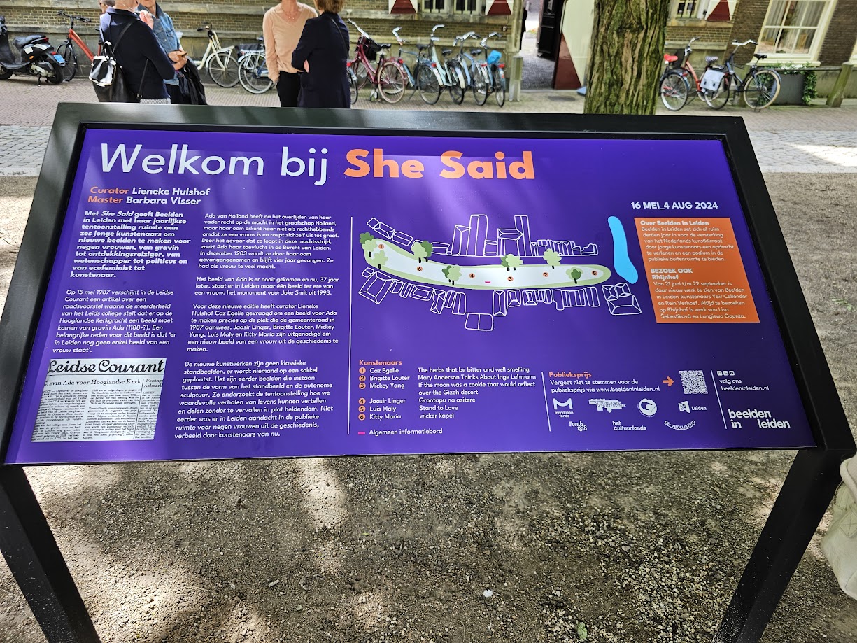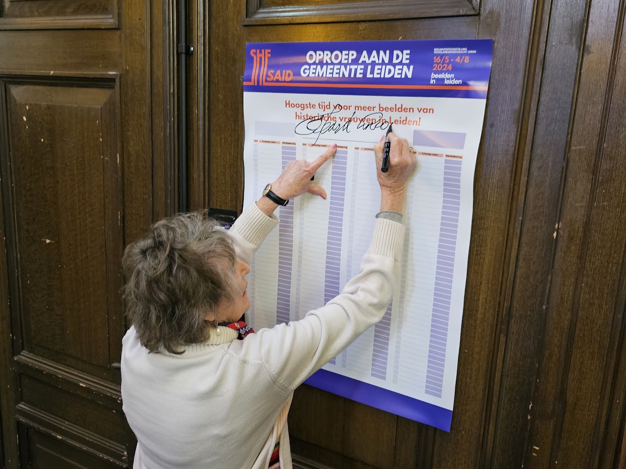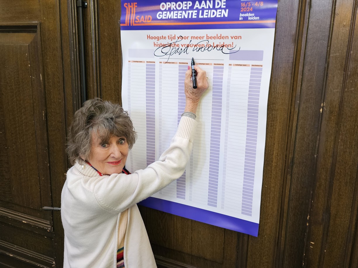 De opening van ‘She Said‘ werd afgesloten met het tekenen van een oproep aan de gemeente Leiden voor meer vrouwelijke beeltenissen in de stad. Hedy d’Ancona zette als eerste haar handtekening. Cultuurwethouder Yvonne van Delft vindt de oproep sympathiek, maar gaf direct al aan dat er binnen haar cultuurportefeuille geen geld voor beschikbaar is.