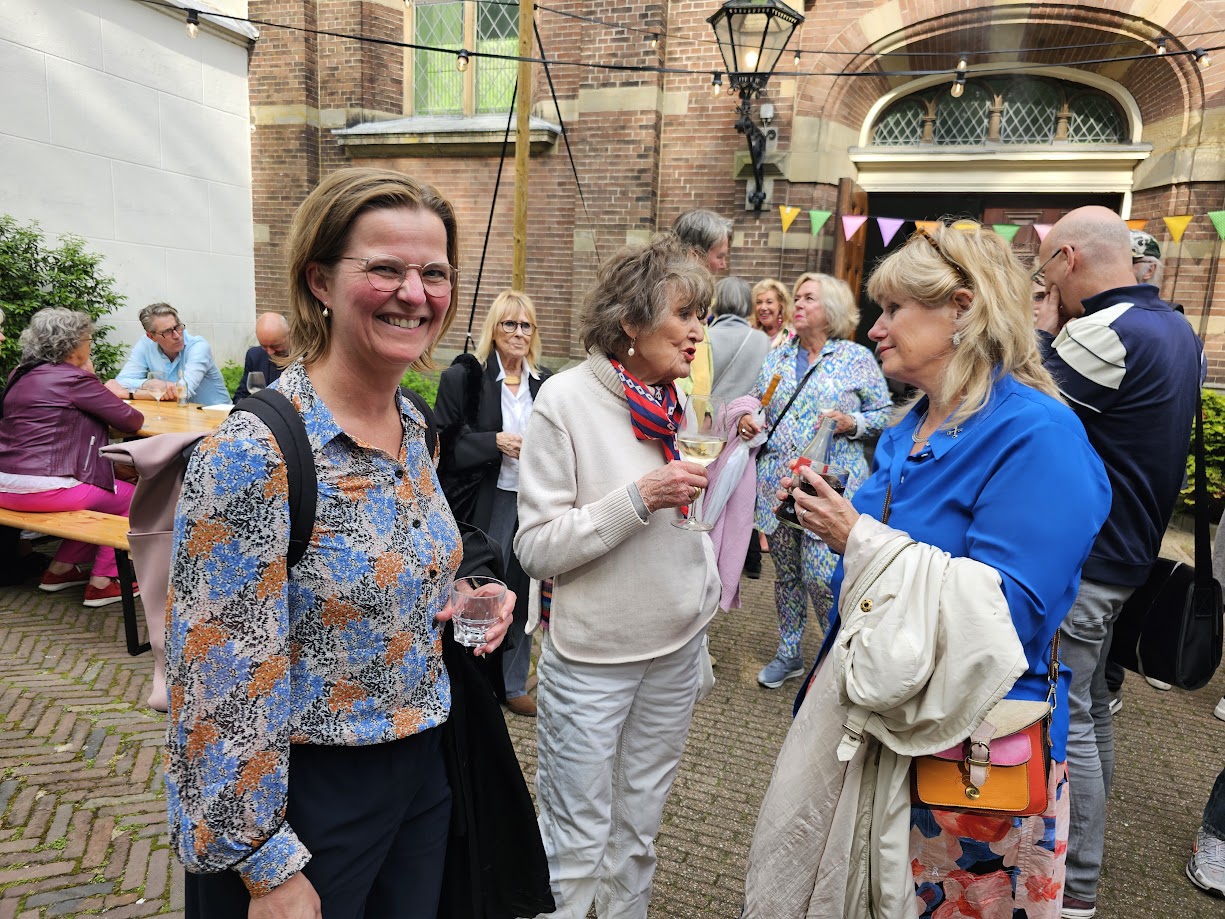 Hedy d’Ancona, cultuurwethouder Yvonne van Delft en voorzitter Henriëtte van der Linden van Beelden in Leiden bij de opening van de expositie.