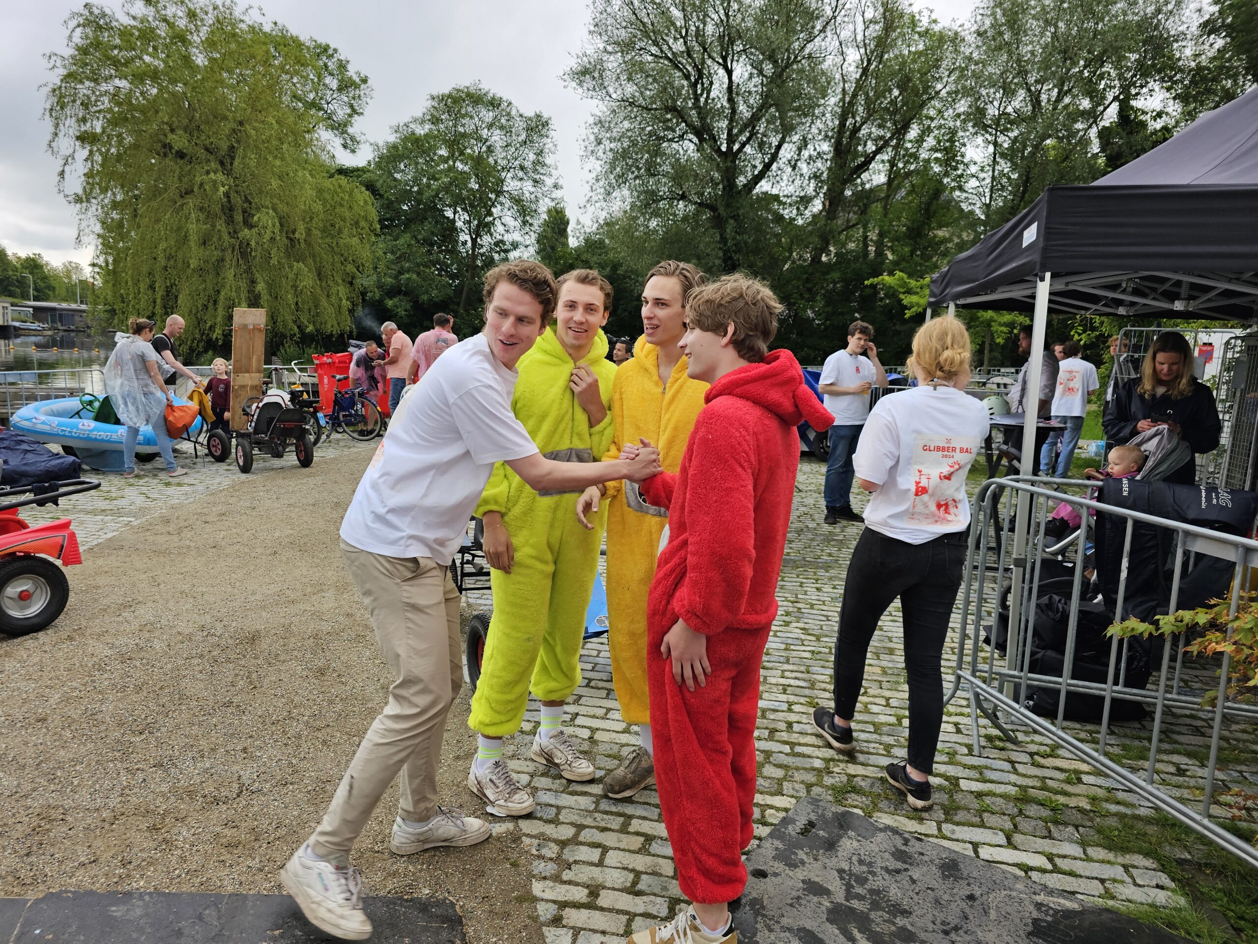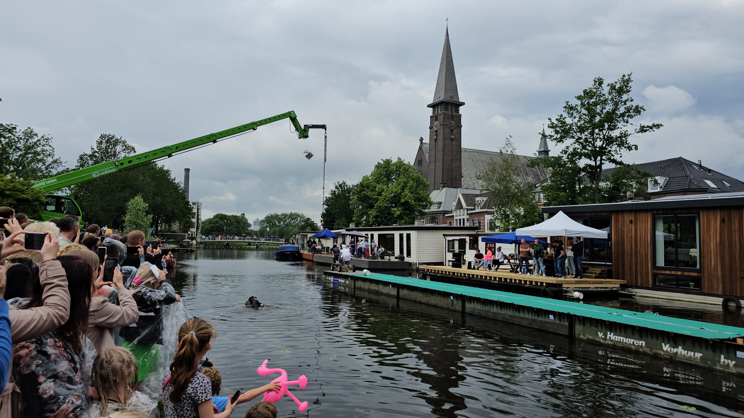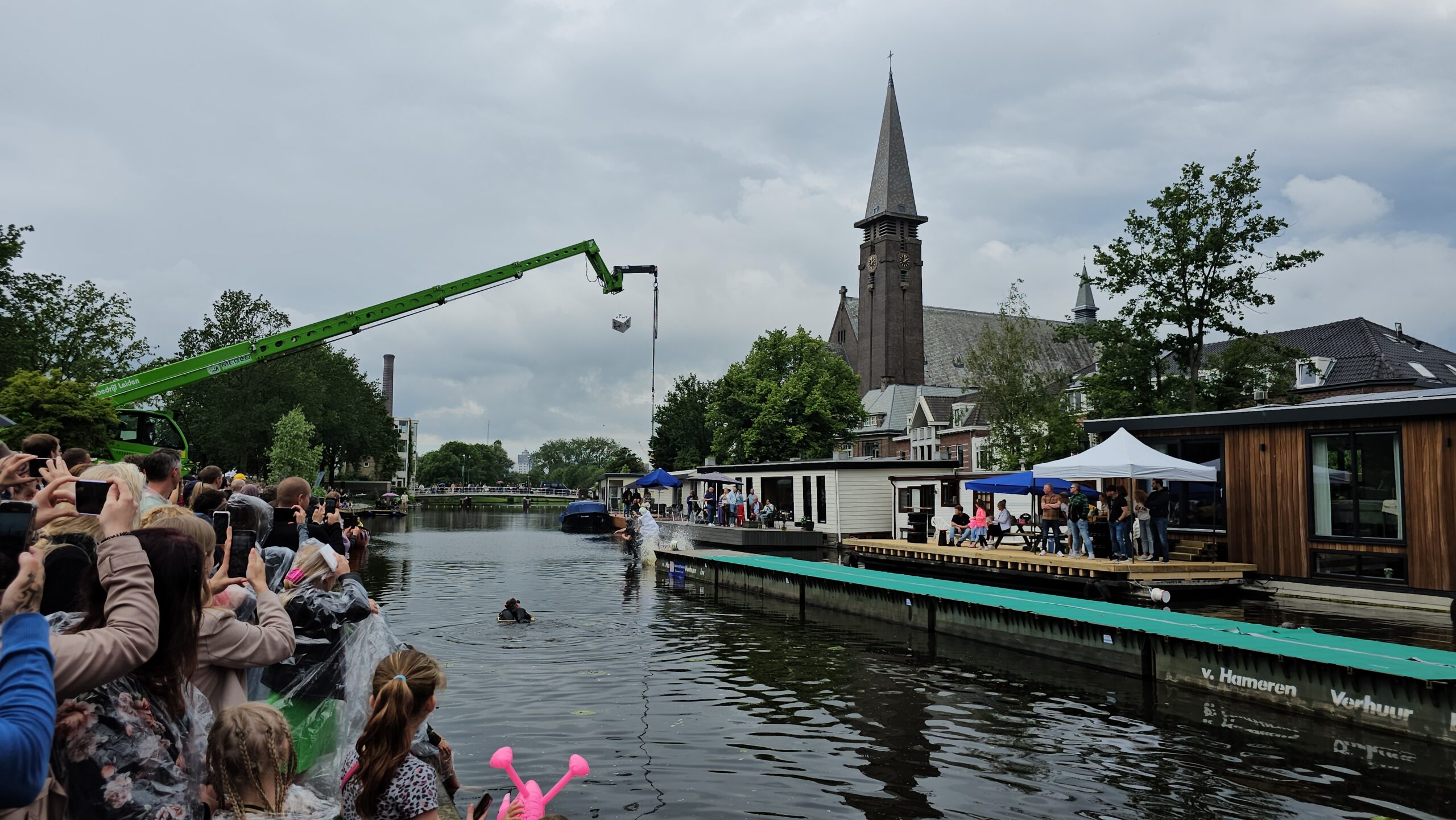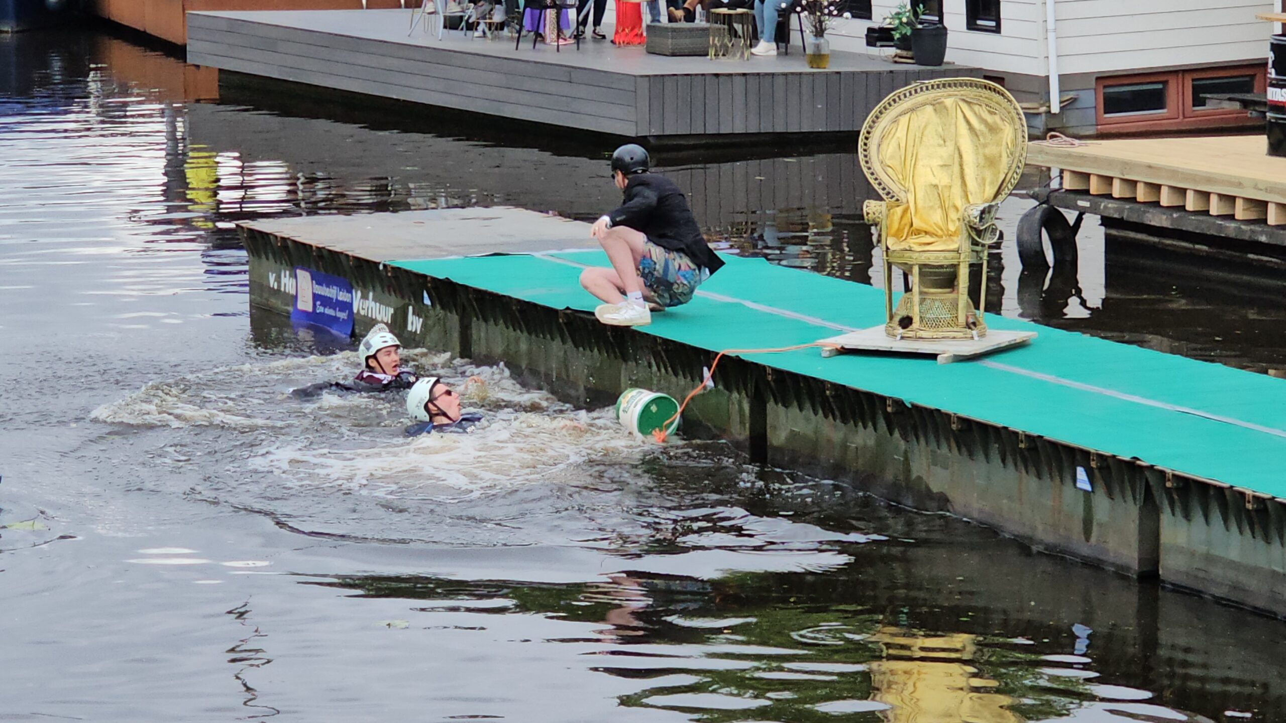 Twee mannen belanden meteen in het water. De derde staat beduusd op en besluit dat hij zich niet laat kennen. Hij rent naar de finish en met een grote sprong lukt het om de bel alsnog aan te tikken. “Toen we in het water lagen, dacht ik al: dat was te verwachten”, lacht Dustin na afloop. “We hebben het geprobeerd, maar helaas. We hebben wel de hardste smakker… daar is ook een prijs voor. Daar gaan we voor.”
