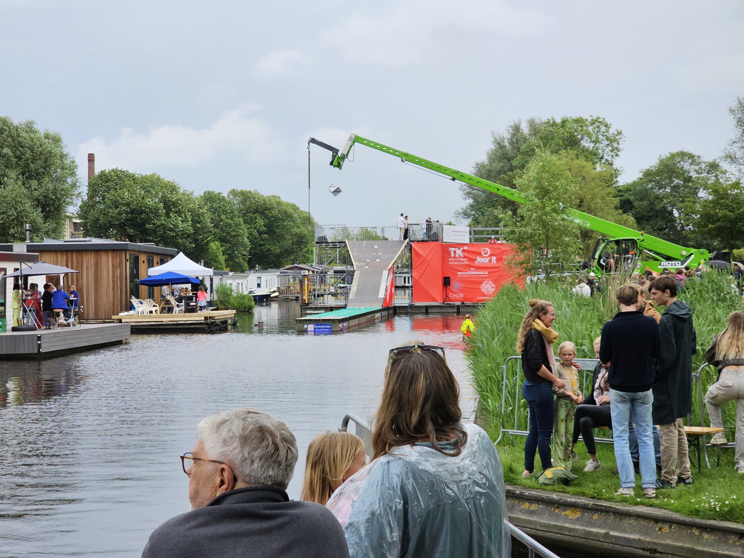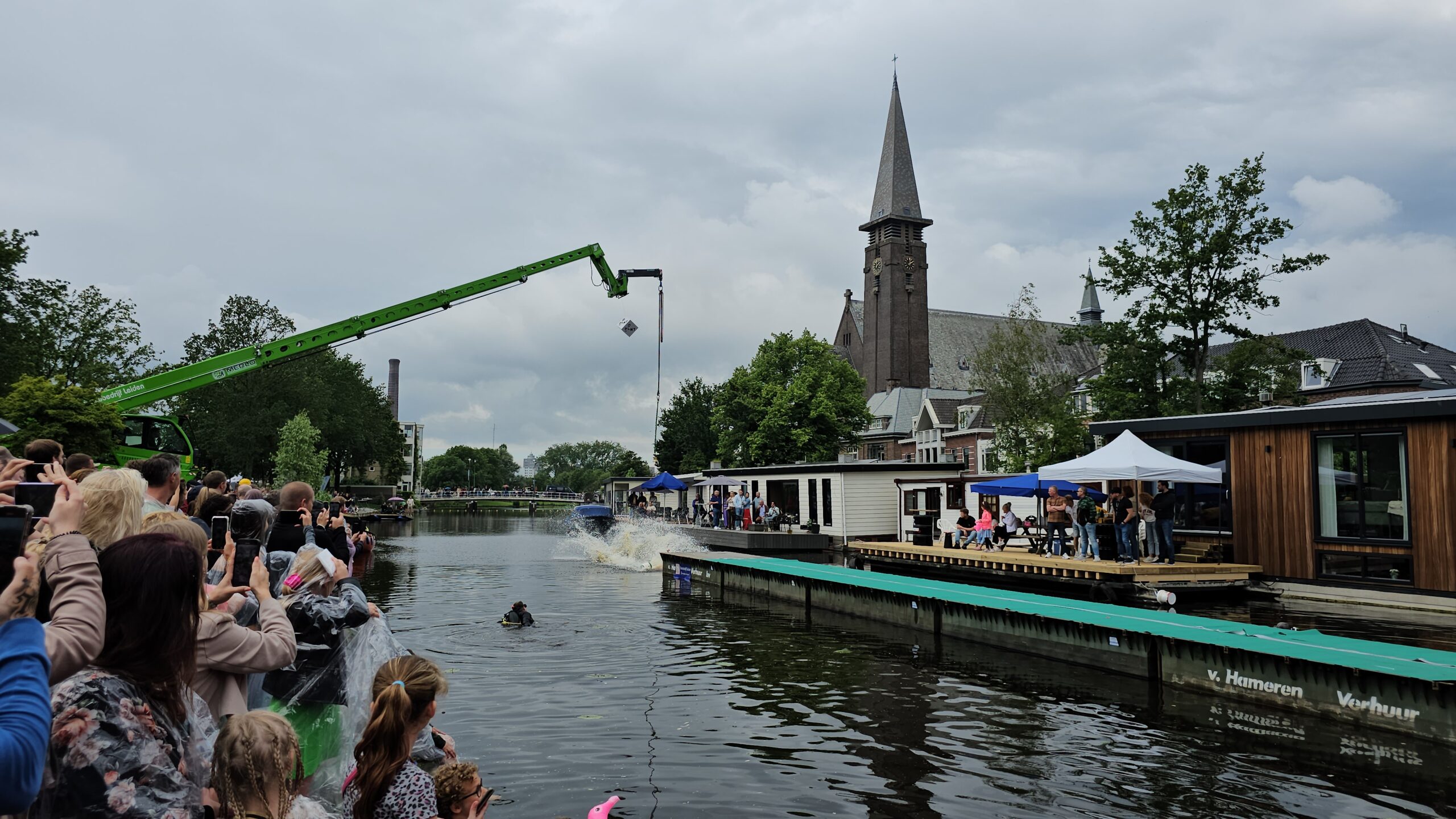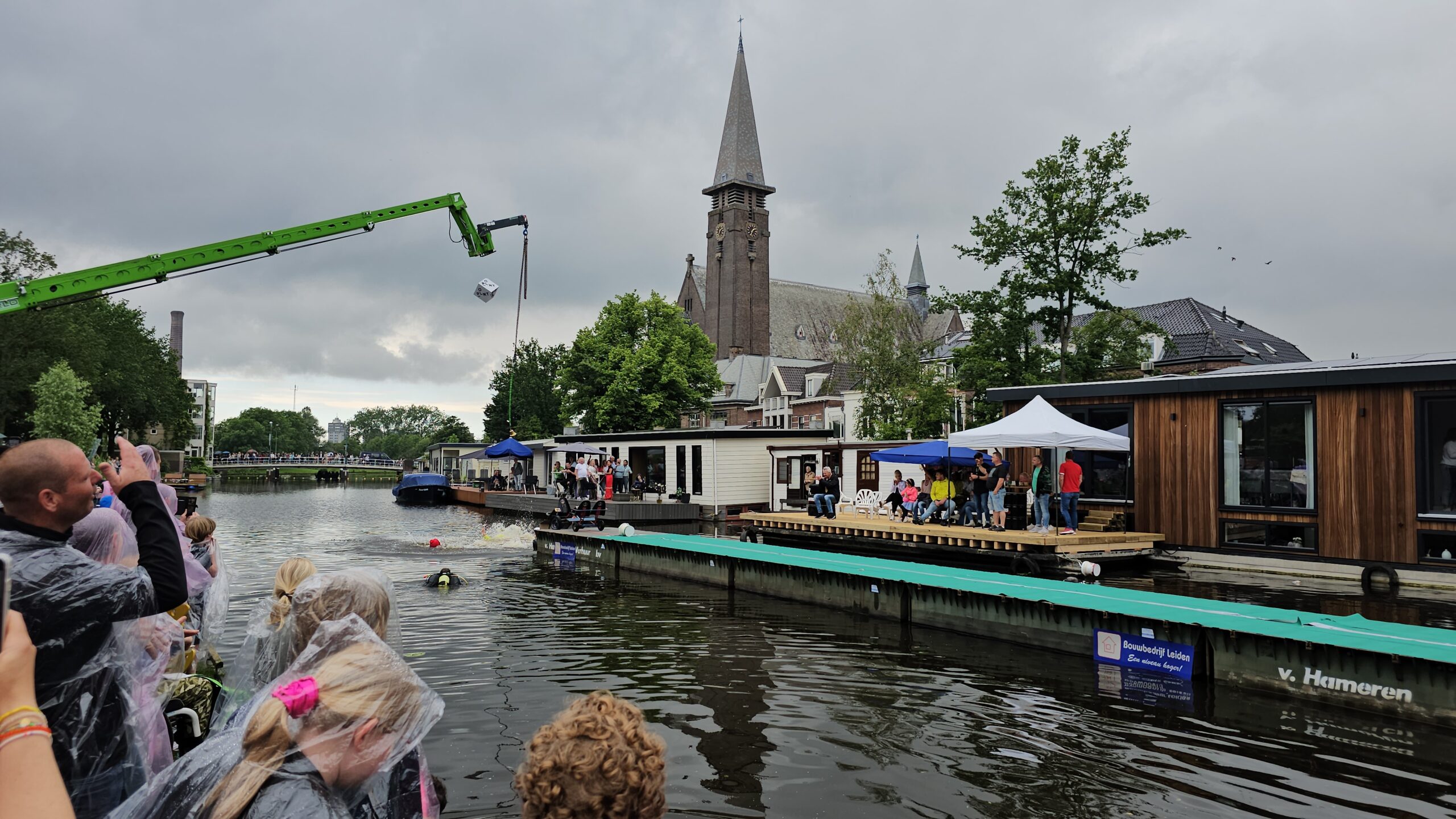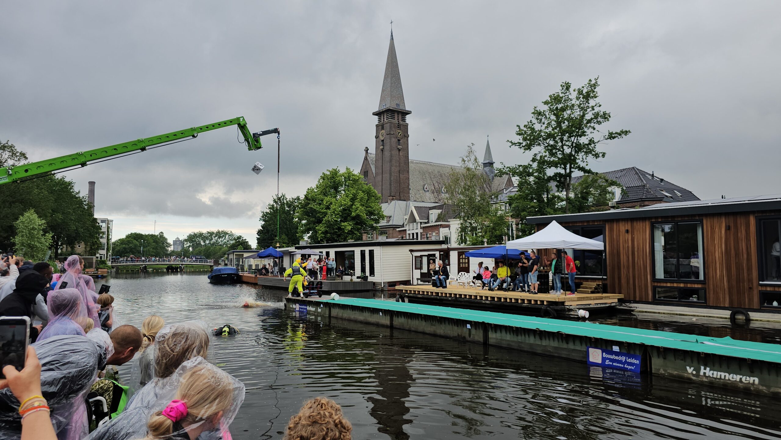 Twee mannen belanden meteen in het water. De derde staat beduusd op en besluit dat hij zich niet laat kennen. Hij rent naar de finish en met een grote sprong lukt het om de bel alsnog aan te tikken. “Toen we in het water lagen, dacht ik al: dat was te verwachten”, lacht Dustin na afloop. “We hebben het geprobeerd, maar helaas. We hebben wel de hardste smakker… daar is ook een prijs voor. Daar gaan we voor.”