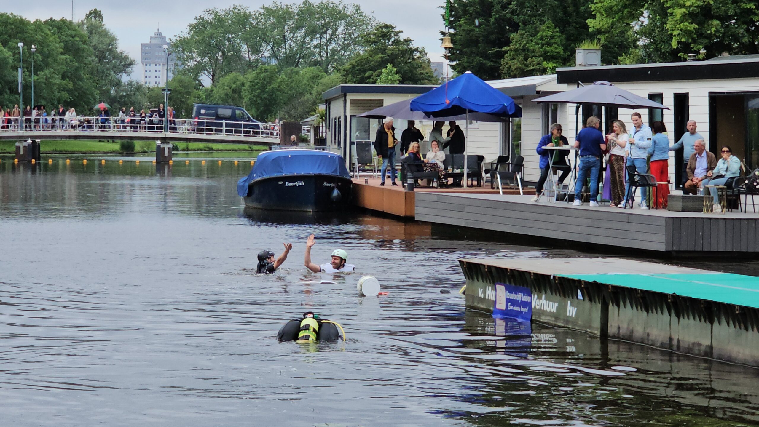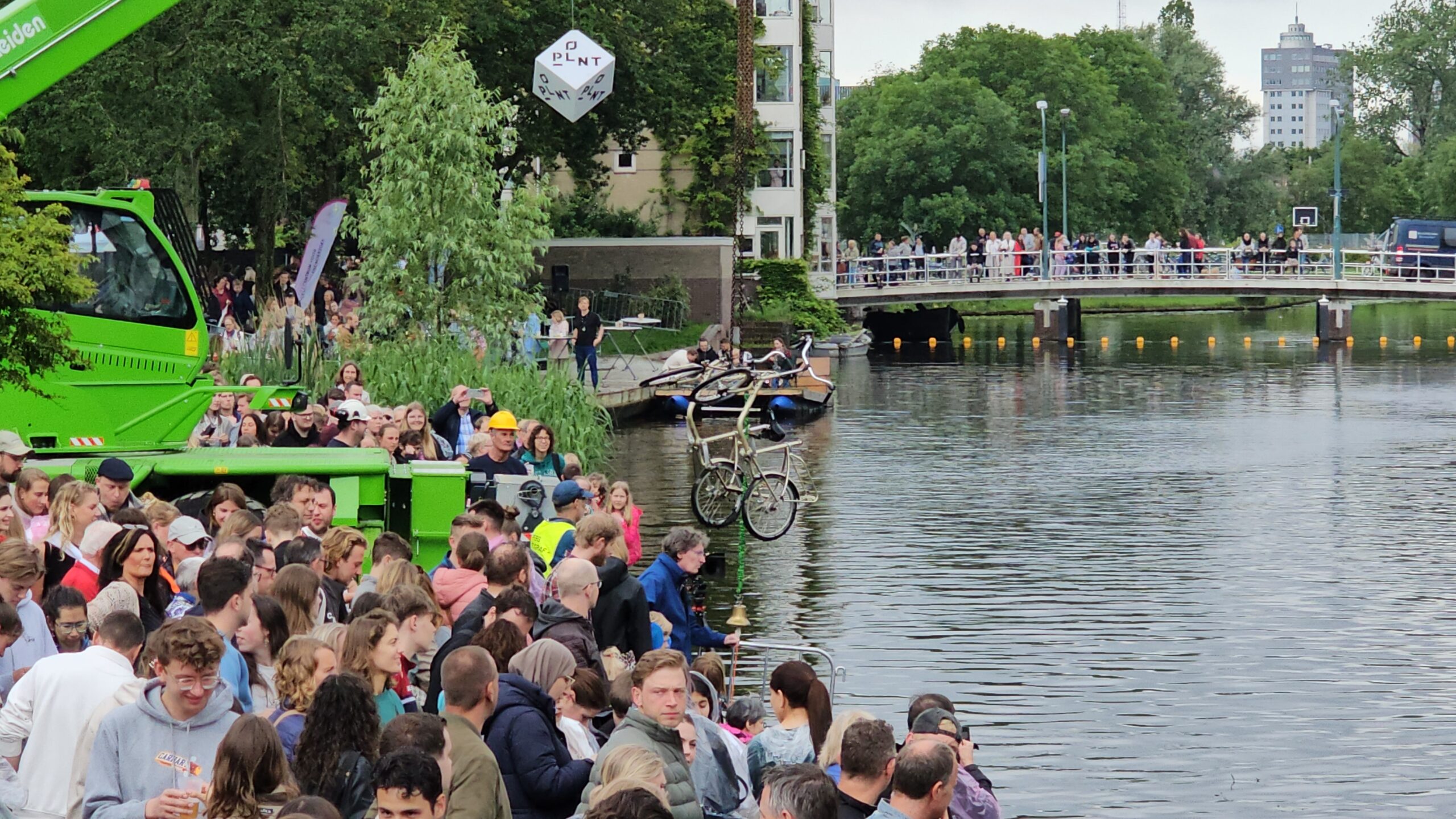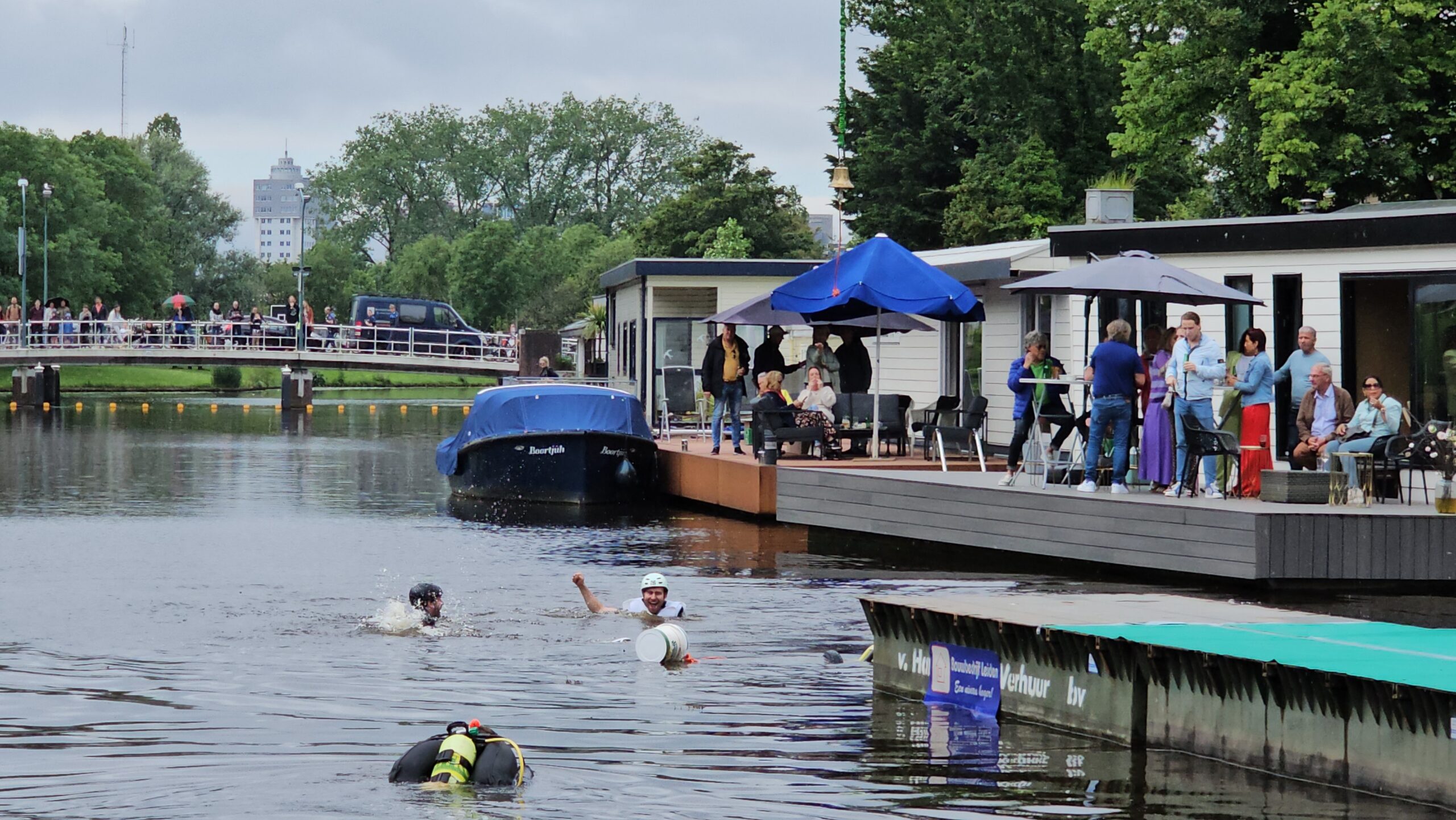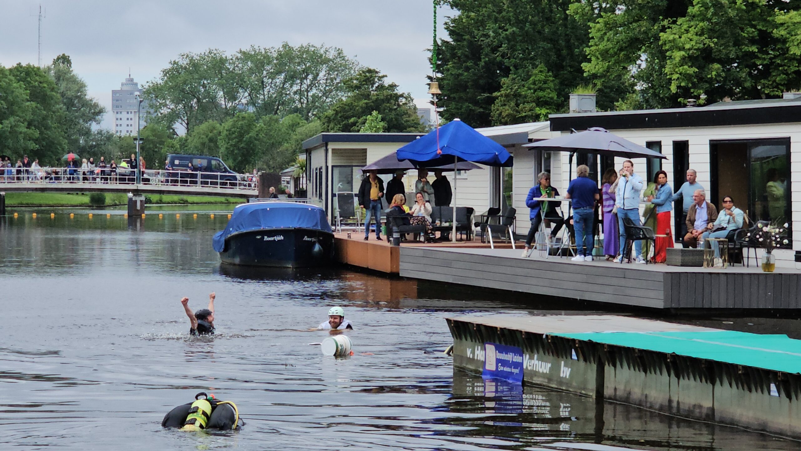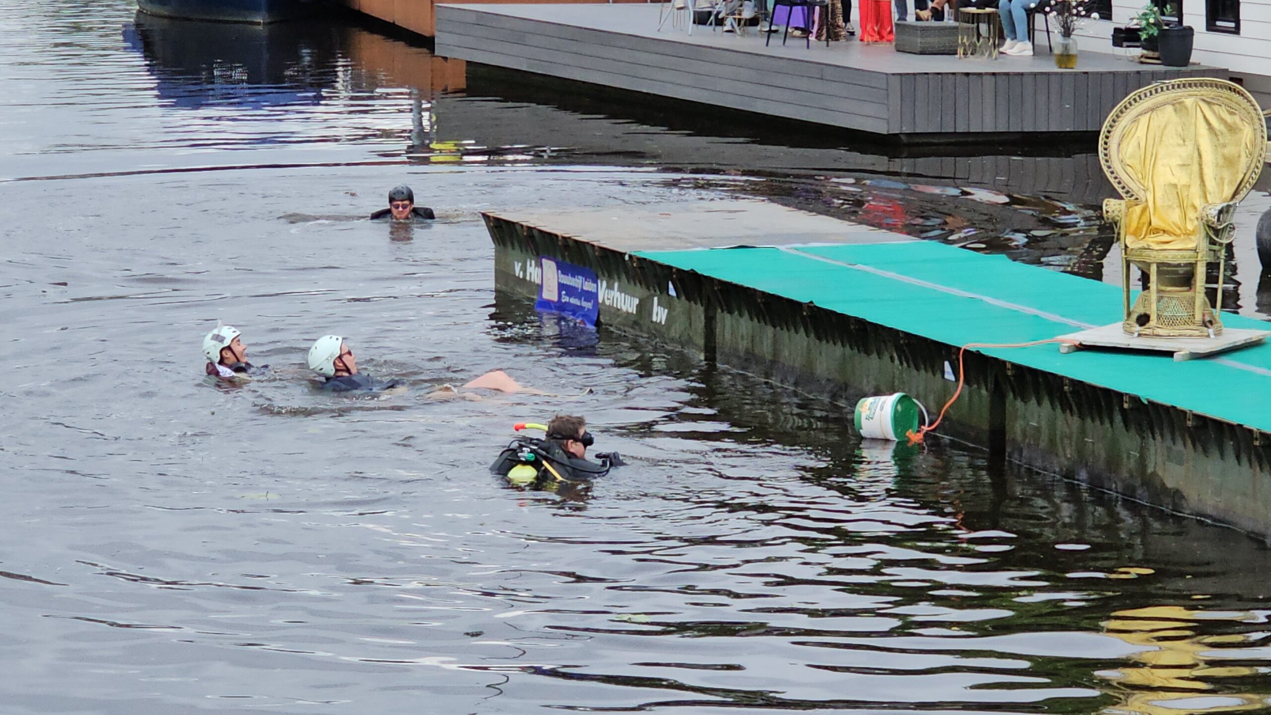 Twee mannen belanden meteen in het water. De derde staat beduusd op en besluit dat hij zich niet laat kennen. Hij rent naar de finish en met een grote sprong lukt het om de bel alsnog aan te tikken. “Toen we in het water lagen, dacht ik al: dat was te verwachten”, lacht Dustin na afloop. “We hebben het geprobeerd, maar helaas. We hebben wel de hardste smakker… daar is ook een prijs voor. Daar gaan we voor.”