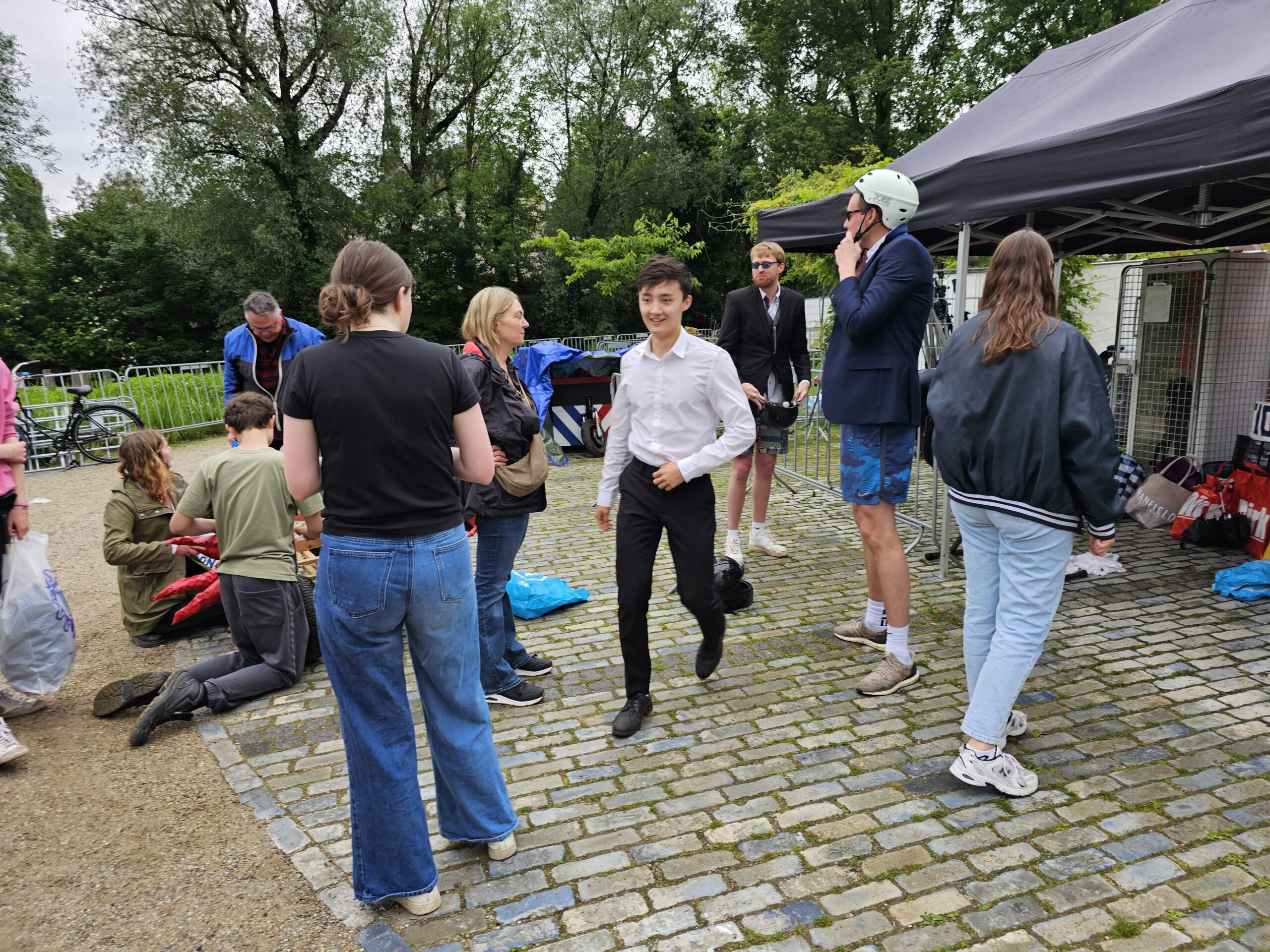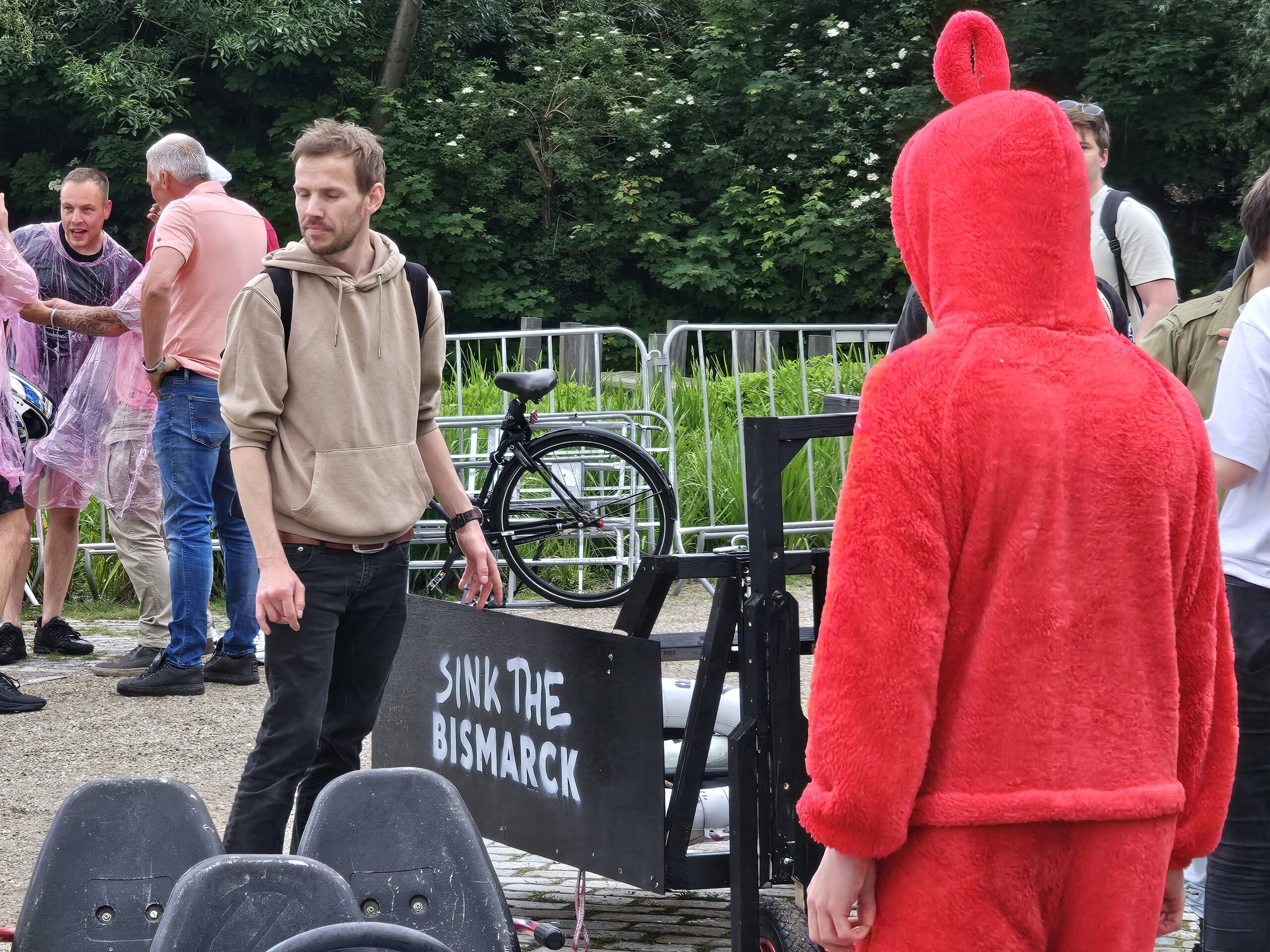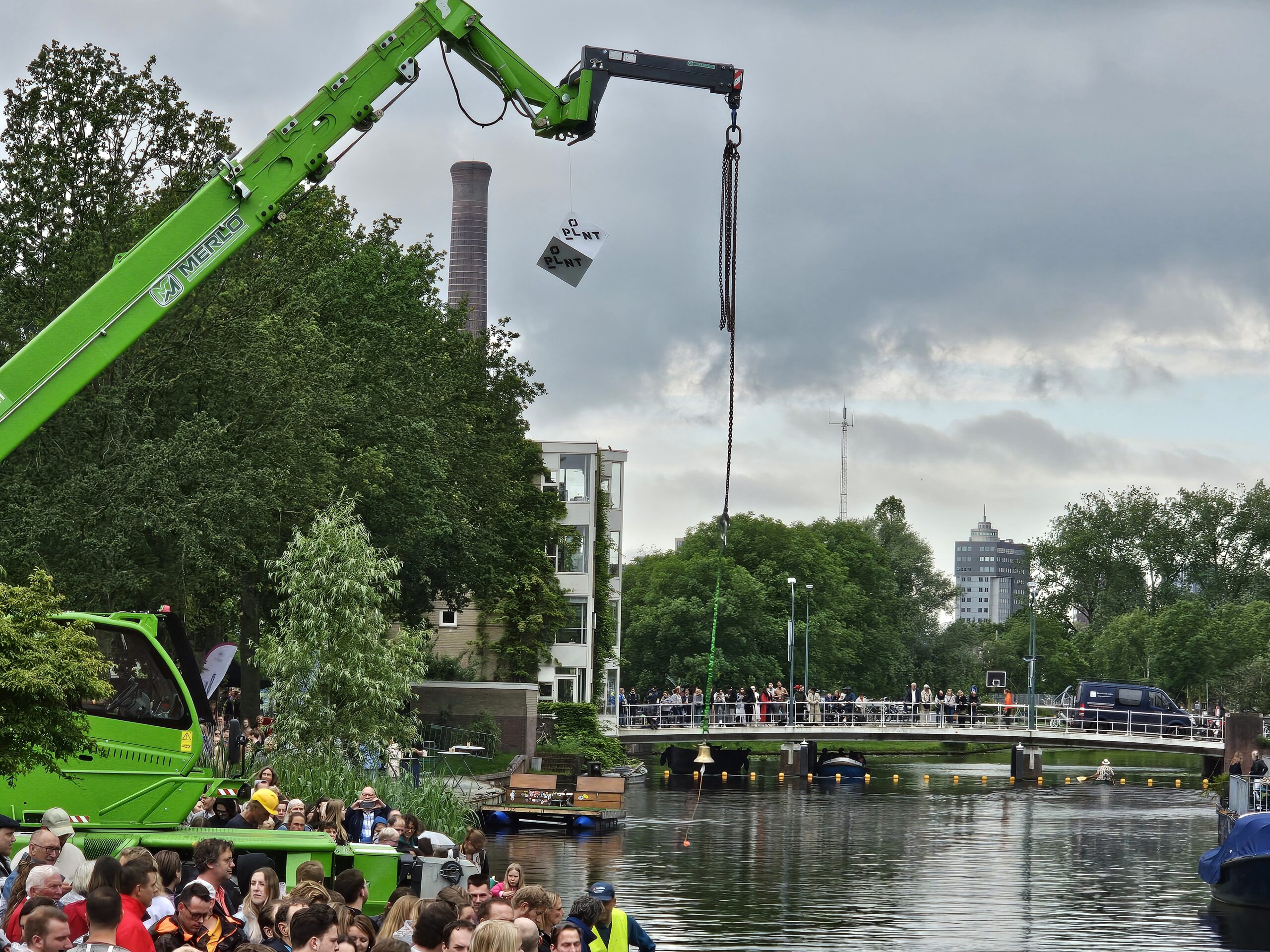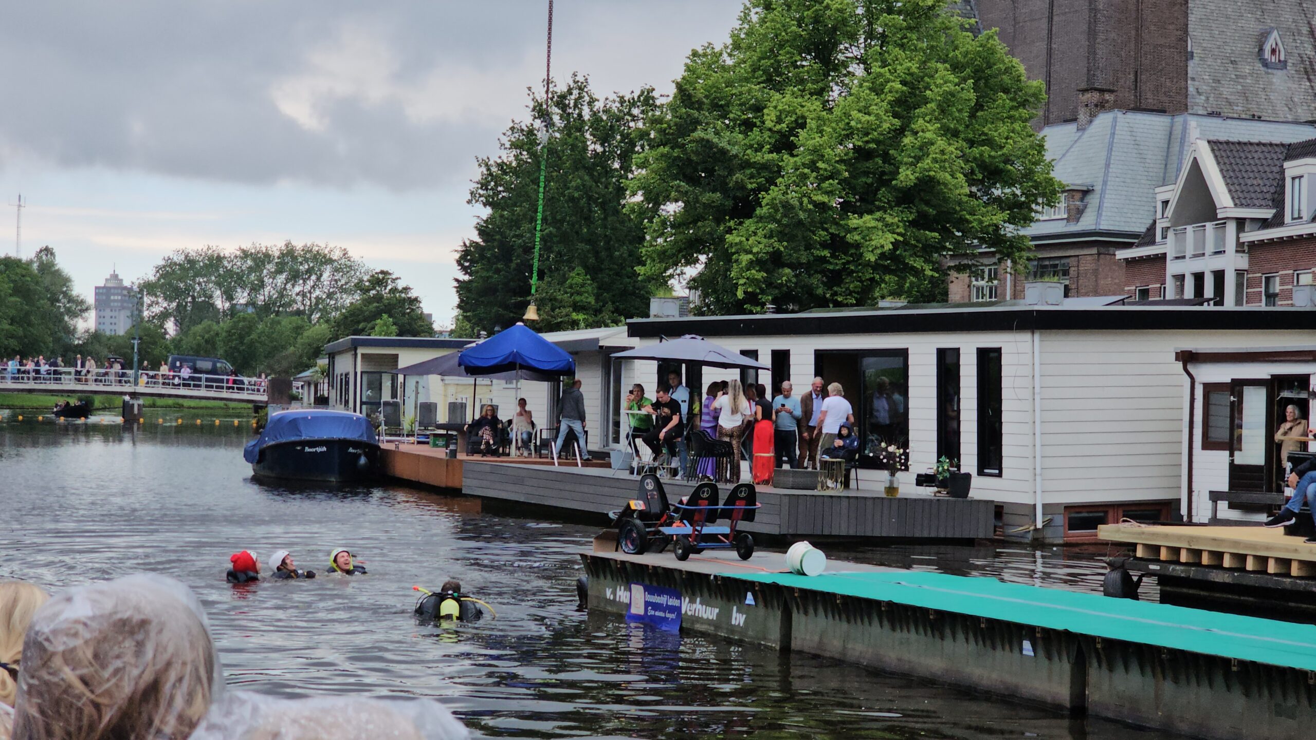 Twee mannen belanden meteen in het water. De derde staat beduusd op en besluit dat hij zich niet laat kennen. Hij rent naar de finish en met een grote sprong lukt het om de bel alsnog aan te tikken. “Toen we in het water lagen, dacht ik al: dat was te verwachten”, lacht Dustin na afloop. “We hebben het geprobeerd, maar helaas. We hebben wel de hardste smakker… daar is ook een prijs voor. Daar gaan we voor.”
