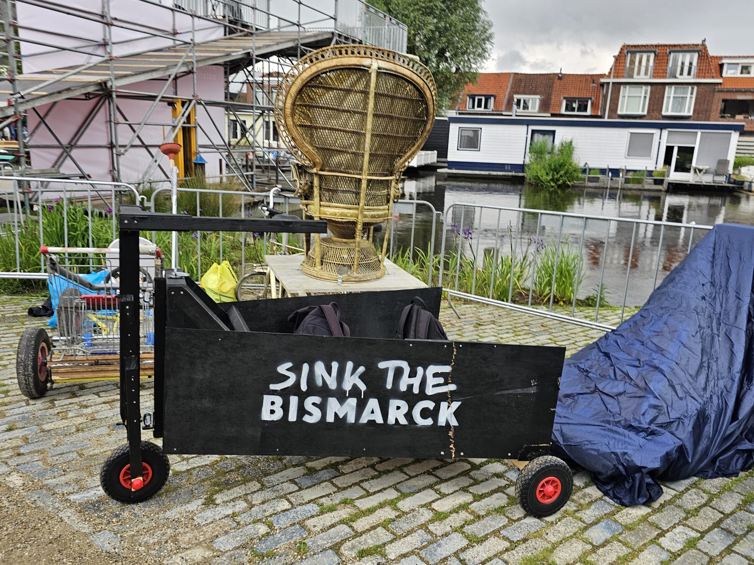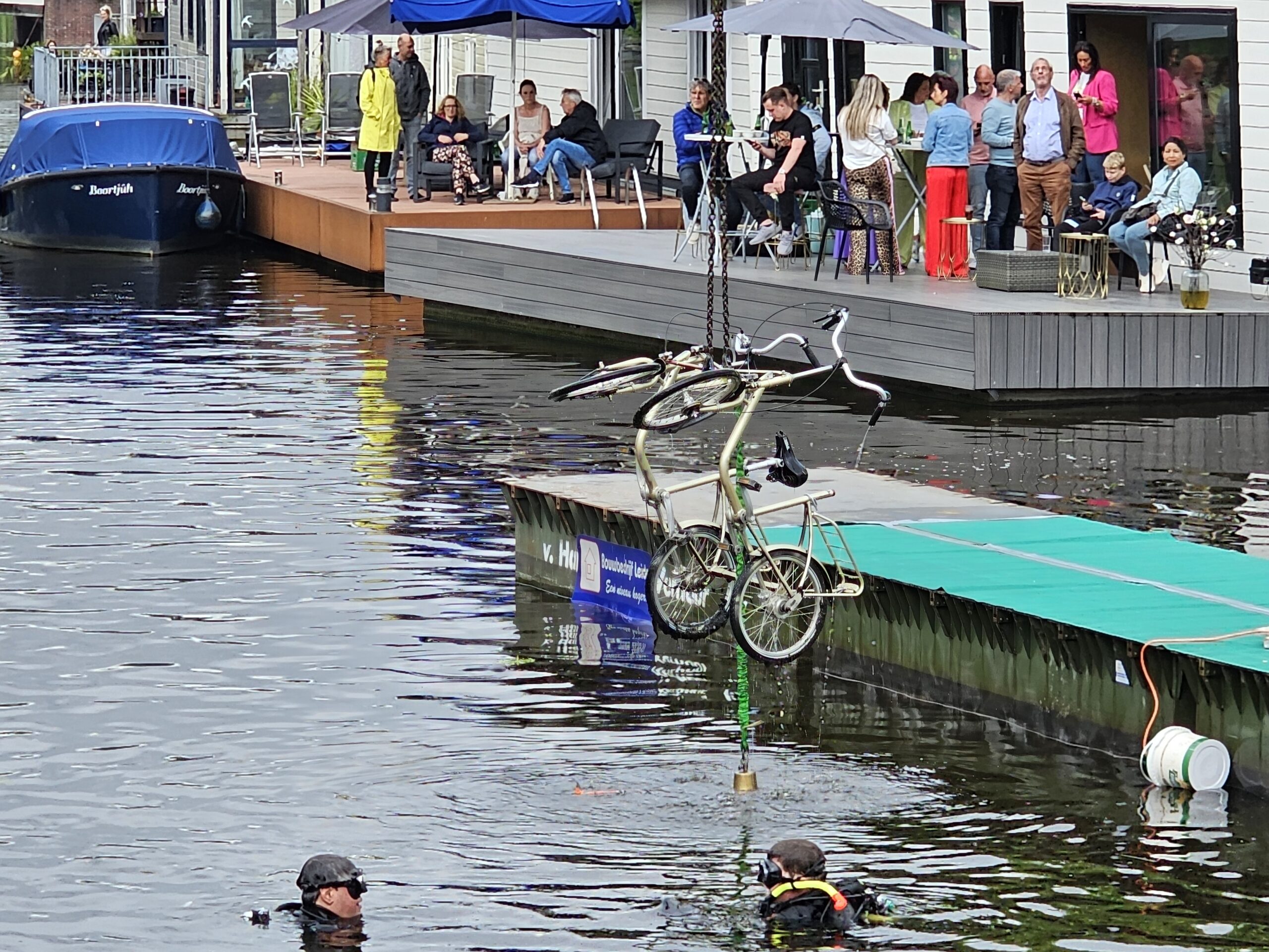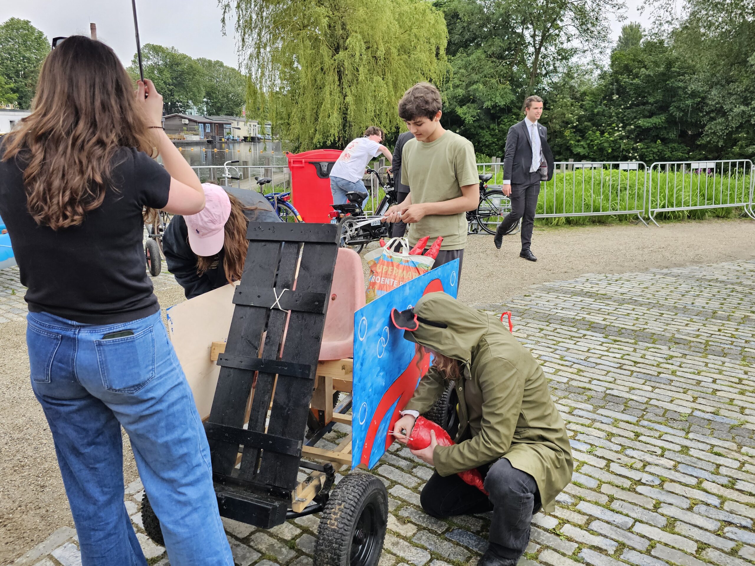 Nadat de drie bovenaan zijn weggeduwd, gaat de afdaling van de schans goed. De wagen rolt eerst nog verder over het rechte deel van de baan, maar raakt al snel uit koers. En met een flinke plons belanden de voorzitters en de wethouder in het water.