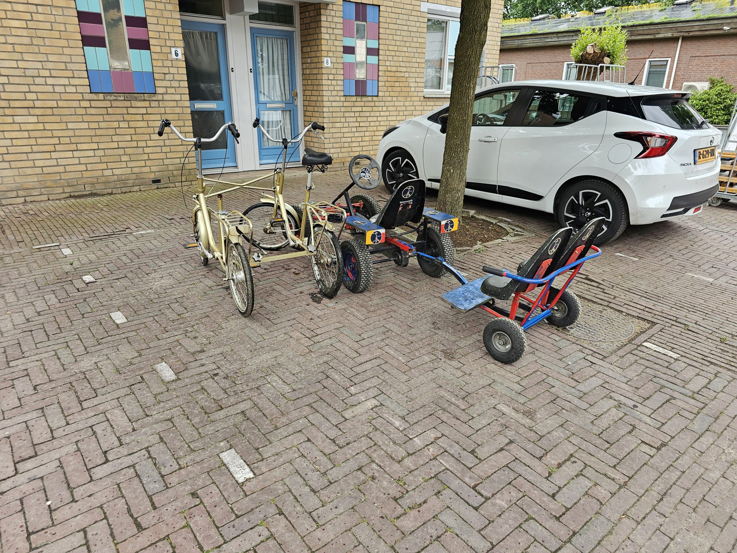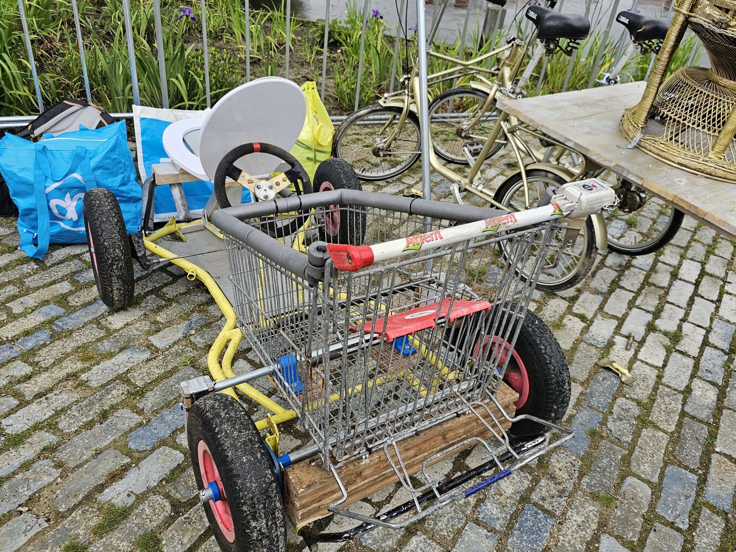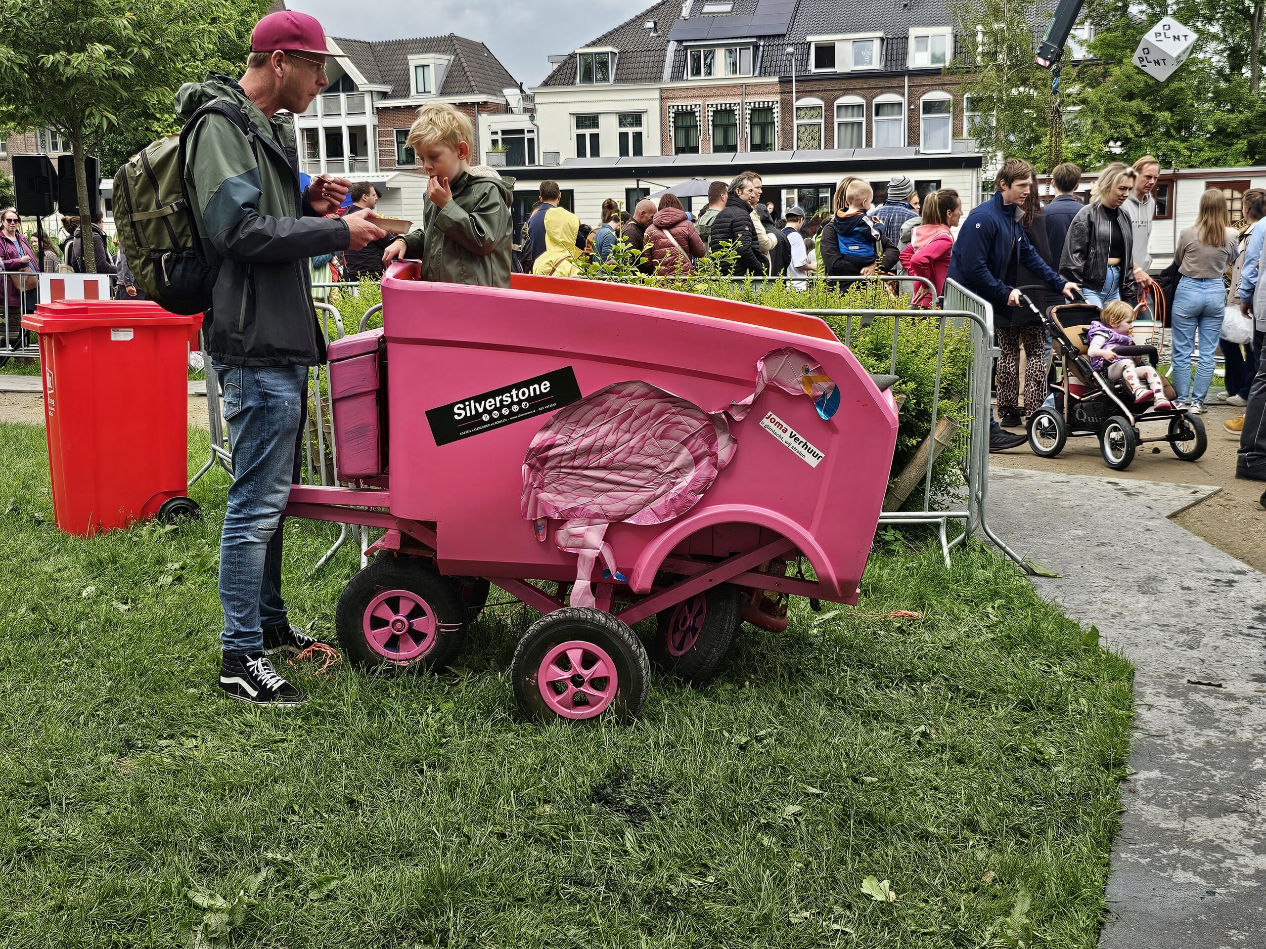 Nadat de drie bovenaan zijn weggeduwd, gaat de afdaling van de schans goed. De wagen rolt eerst nog verder over het rechte deel van de baan, maar raakt al snel uit koers. En met een flinke plons belanden de voorzitters en de wethouder in het water.
