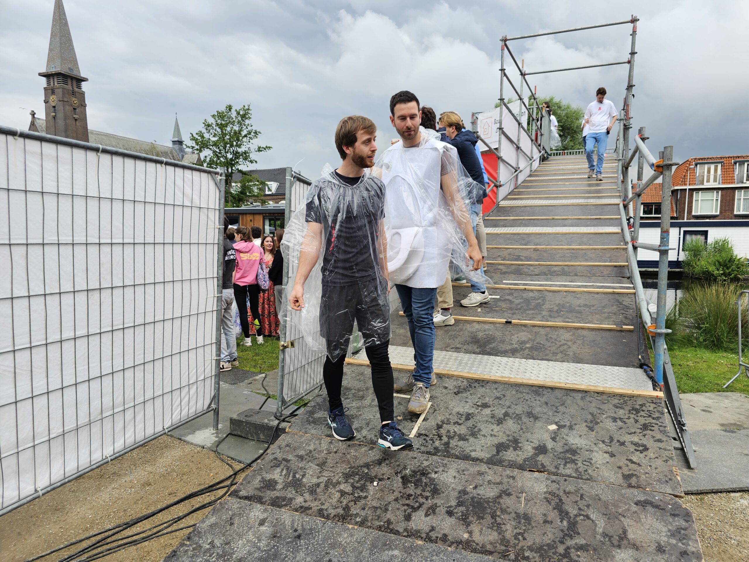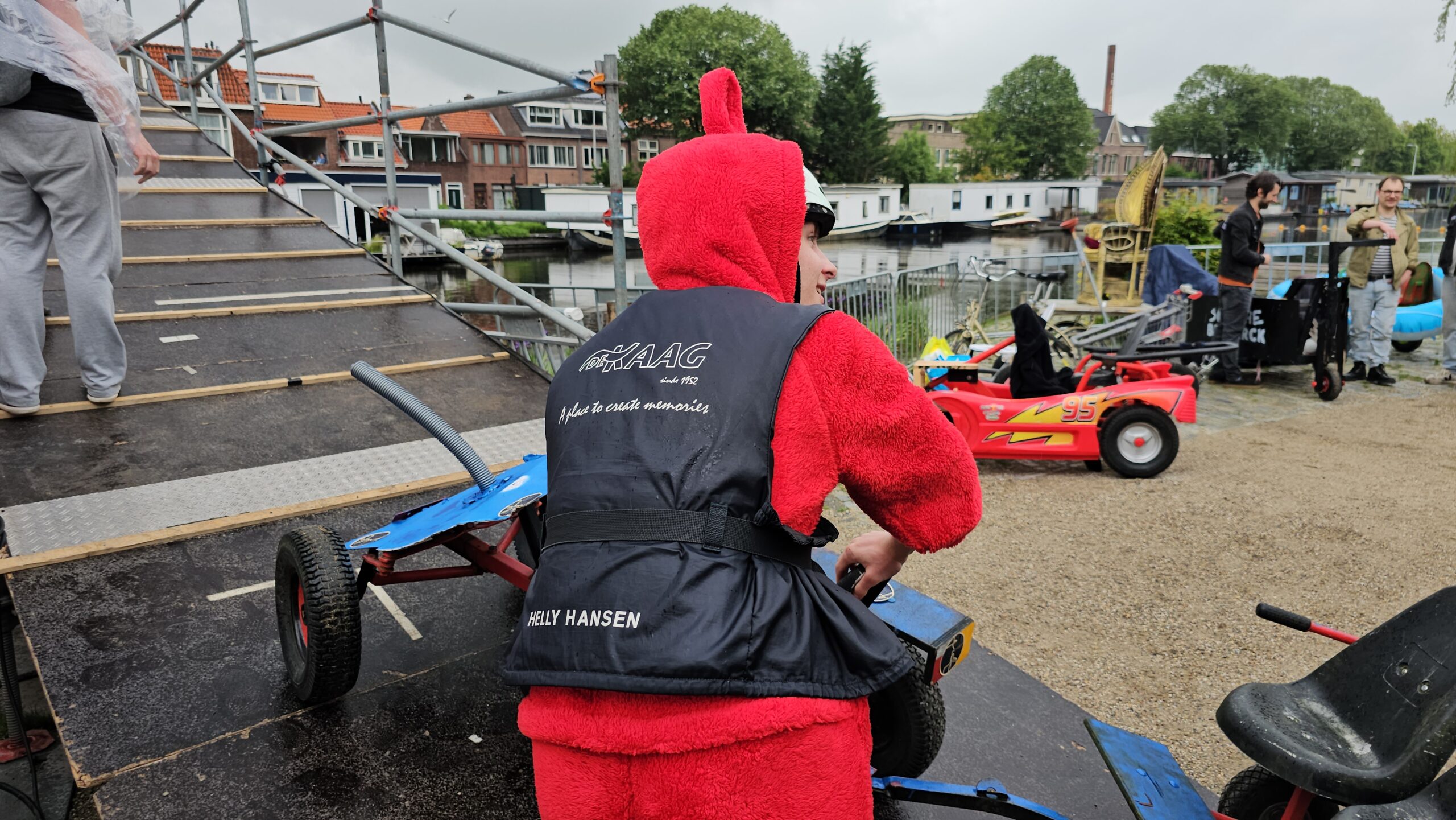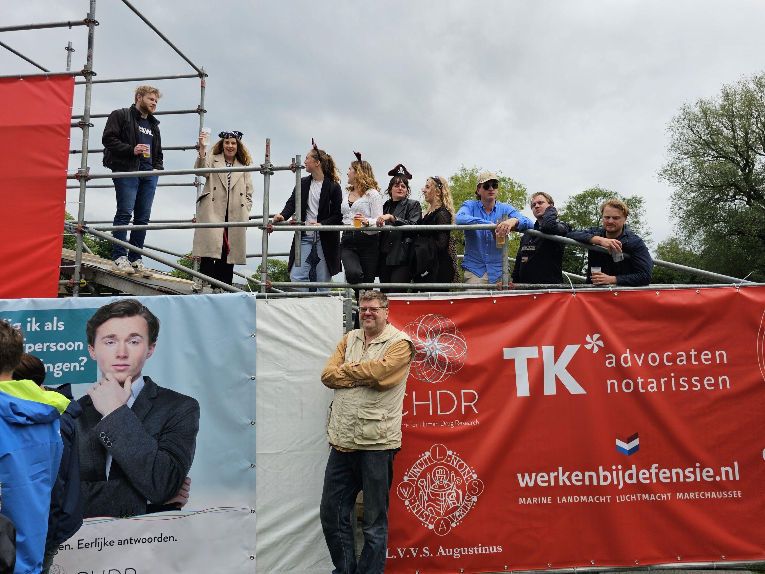 Studentenvereniging Augustinus trekt dit jaar de kar onder het motto ‘Lallen en vallen met glibbers en ballen’. Voorzitter Auke Hofman is er maar wat trots op. “Het is een geweldige baan, door vakmannen in elkaar gezet”, zegt hij terwijl hij bovenaan de schans staat. “Er gaan dertig teams van af, dus ik hoop dat hij het houdt”, lacht hij. “Maar dat moet wel goed komen. Ik denk dat je tussen vijf en tien seconden bezig bent, het gaat echt wel rap naar beneden.”