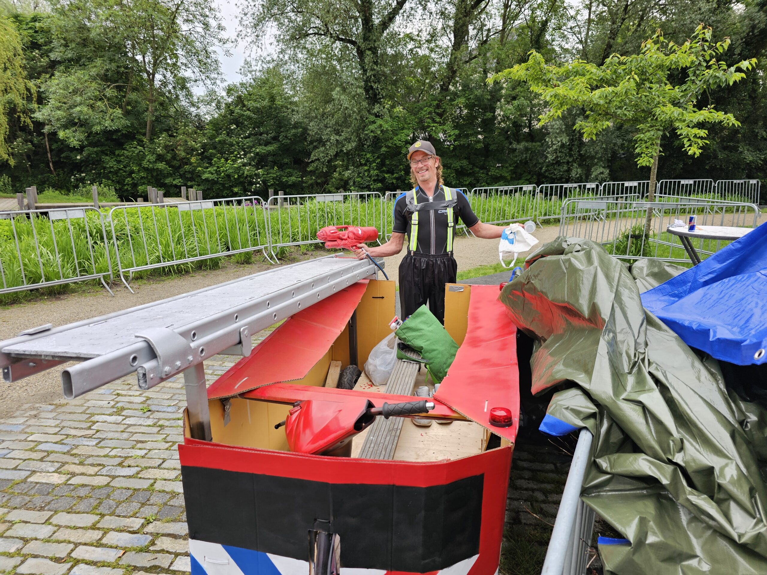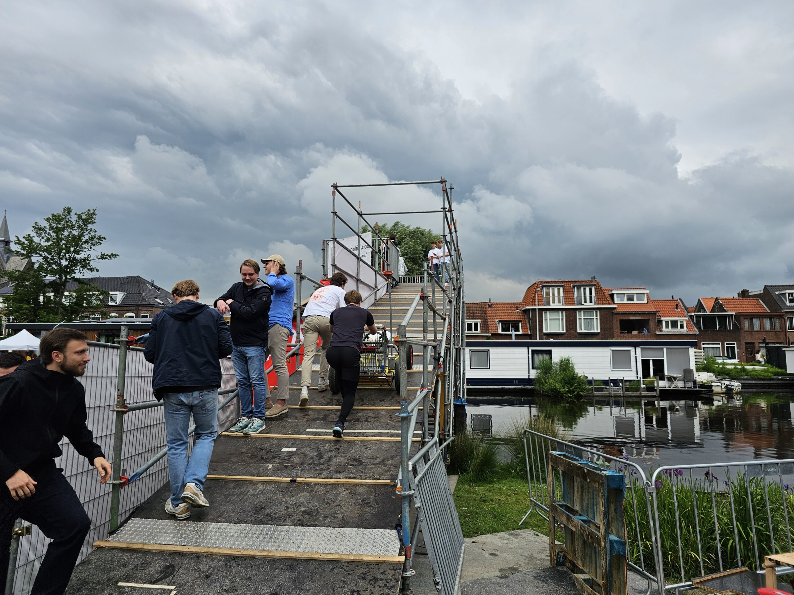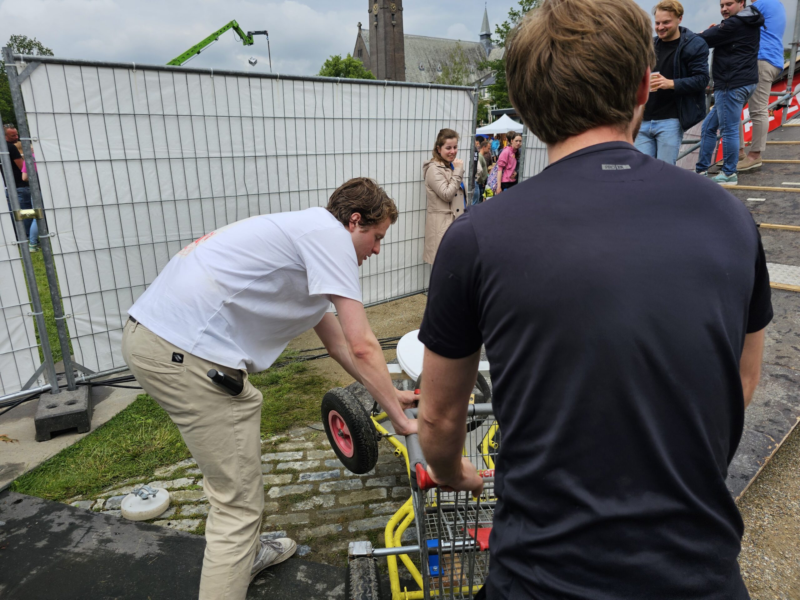 Studentenvereniging Augustinus trekt dit jaar de kar onder het motto ‘Lallen en vallen met glibbers en ballen’. Voorzitter Auke Hofman is er maar wat trots op. “Het is een geweldige baan, door vakmannen in elkaar gezet”, zegt hij terwijl hij bovenaan de schans staat. “Er gaan dertig teams van af, dus ik hoop dat hij het houdt”, lacht hij. “Maar dat moet wel goed komen. Ik denk dat je tussen vijf en tien seconden bezig bent, het gaat echt wel rap naar beneden.”