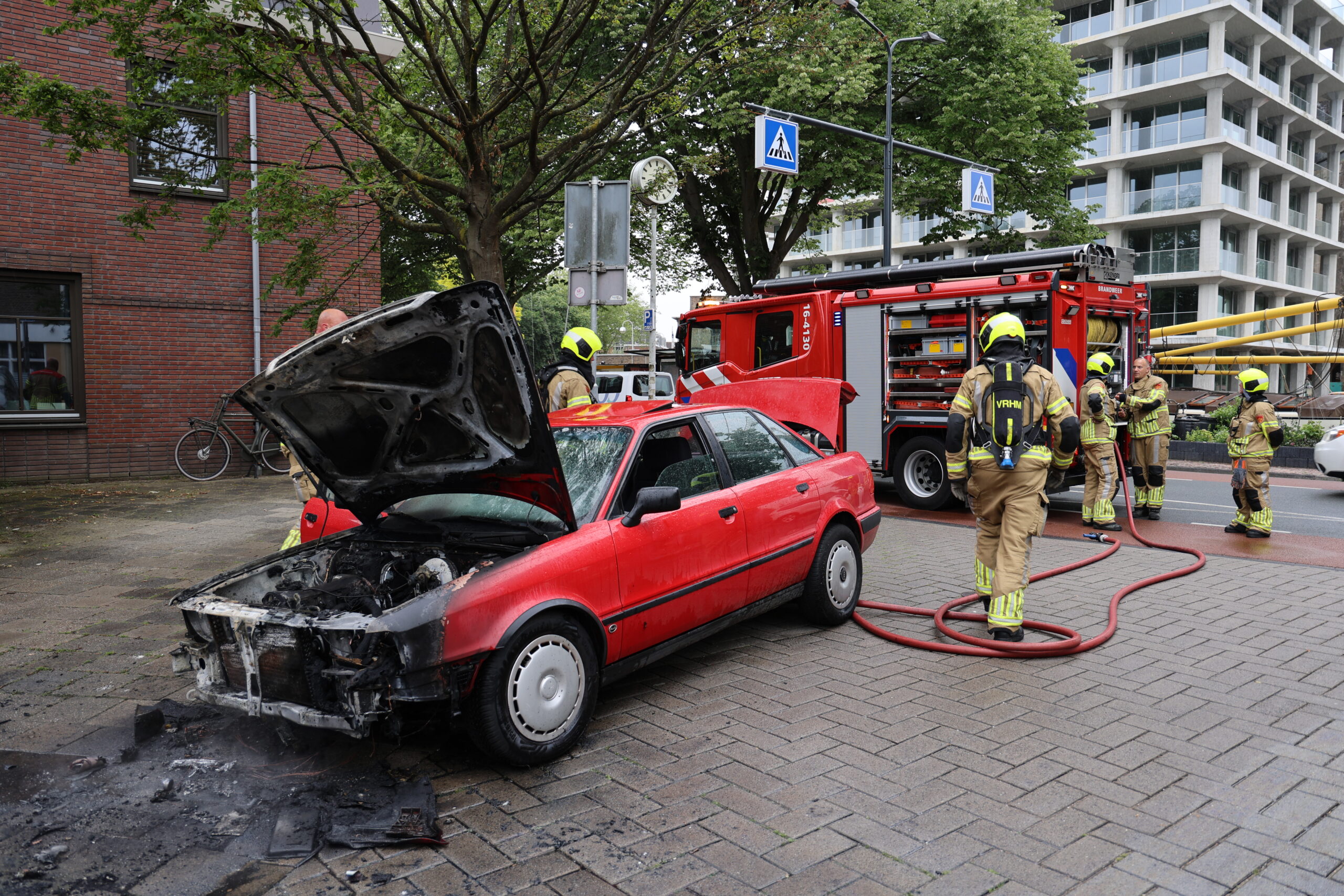 Al enkele seconden later stond het motorcompartiment van het voertuig in lichterlaaie. Een omstander deed met een brandblusser nog een bluspoging, maar de brand was toen al zo hevig dat die poging noodgedwongen werd gestaakt.