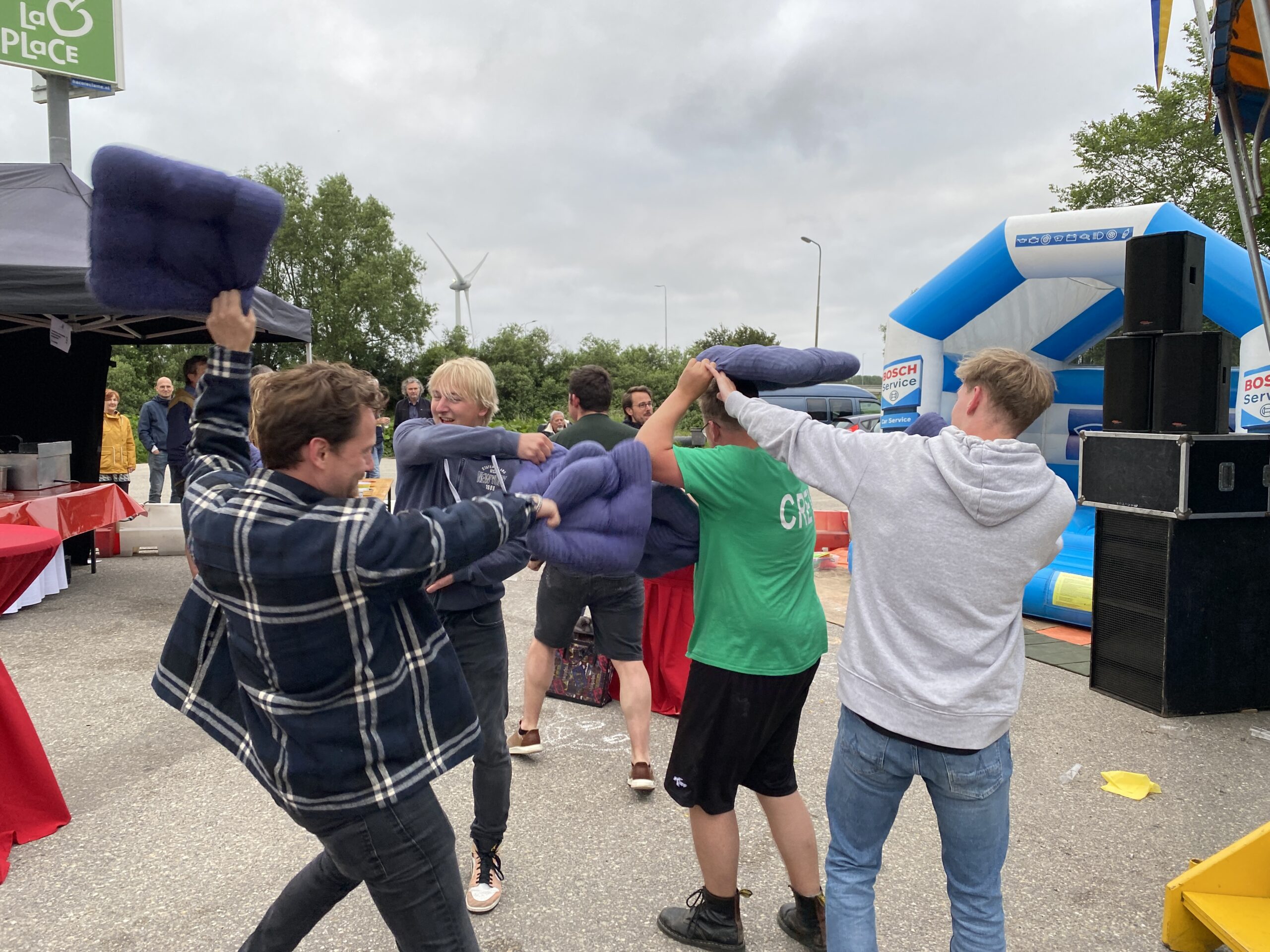 “Dit gebeurt alleen in Zoeterwoude”, vertelt Maarten Mulder. Zijn band trad al eerder op tijdens het festival, maar had dit jaar de eer om het feest af te mogen sluiten. Het enthousiaste publiek pakte de kussen waar eerder op de dag kinderen op zaten bij het springkussen en begonnen een kussengevecht met elkaar. Er zijn geen gewonden gevallen, zo laat de organisatie grappend weten.