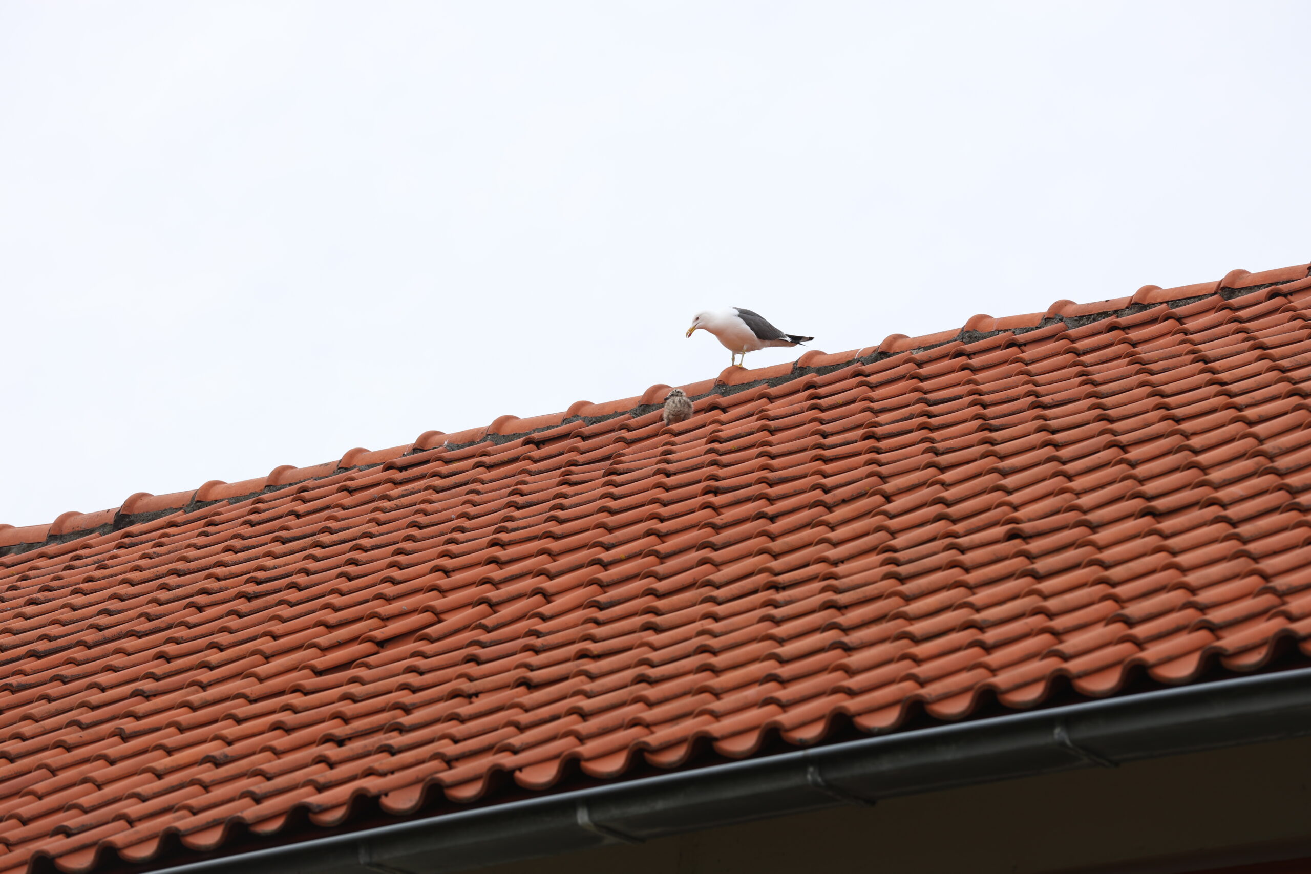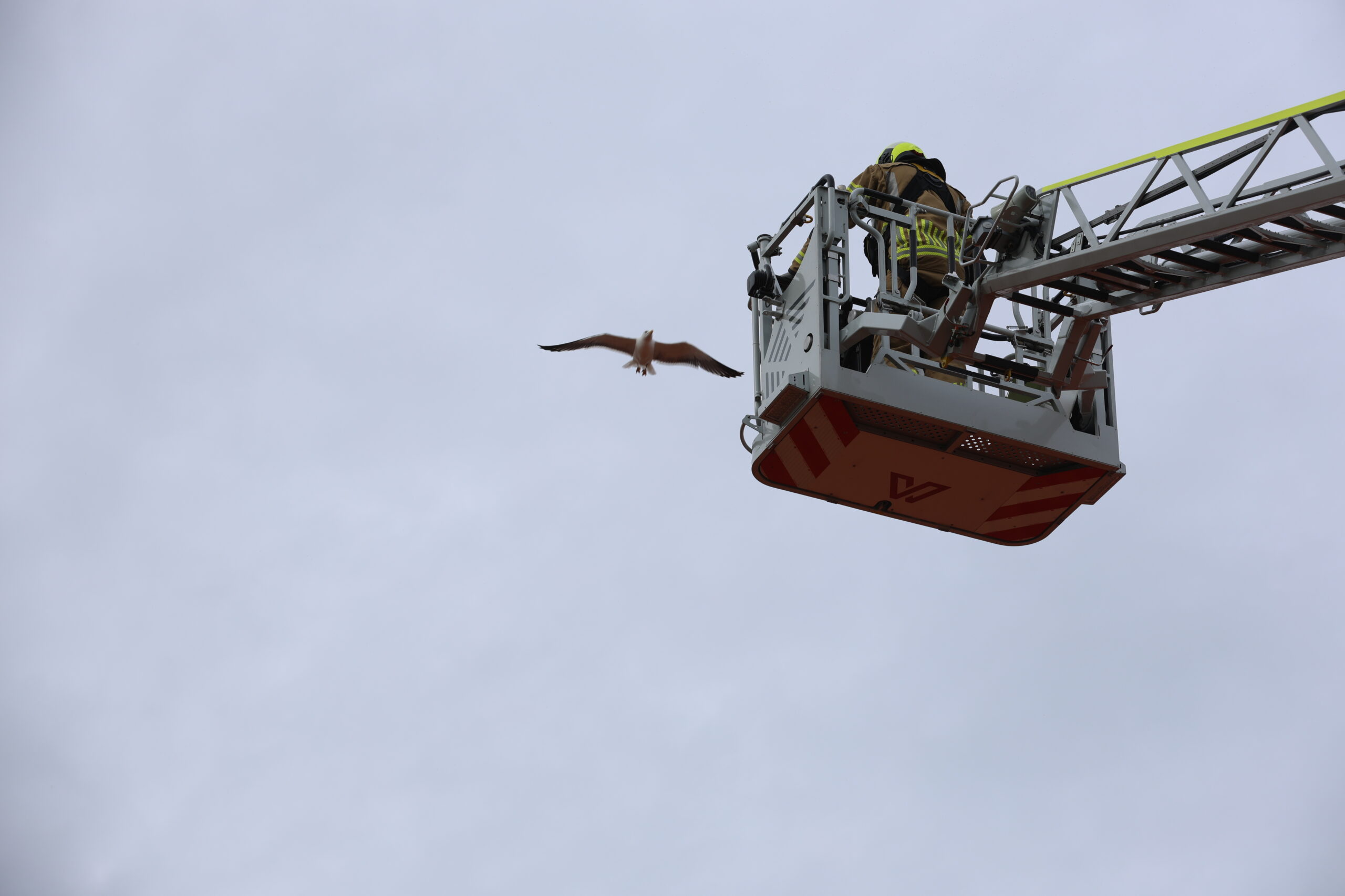 Toen de brandweer met een ladderwagen richting het dak ging, kroop het jonge meeuwtje op eigen kracht naar de punt van het dak en vervolgens aan de andere kant weer naar beneden. Toen kon de brandweer er niet meer bijkomen.