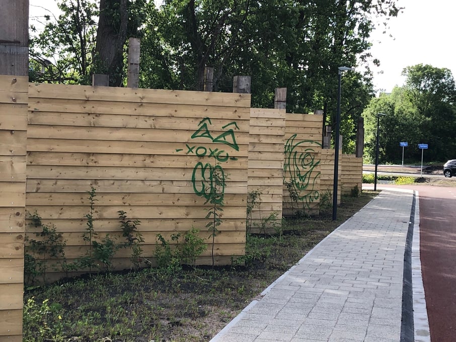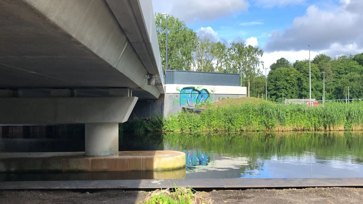 Zowel in het fietstunneltje onder de brug als op het zogenaamde landhoofd en op houten geluidsschermen naar de brug toe is gekliederd.