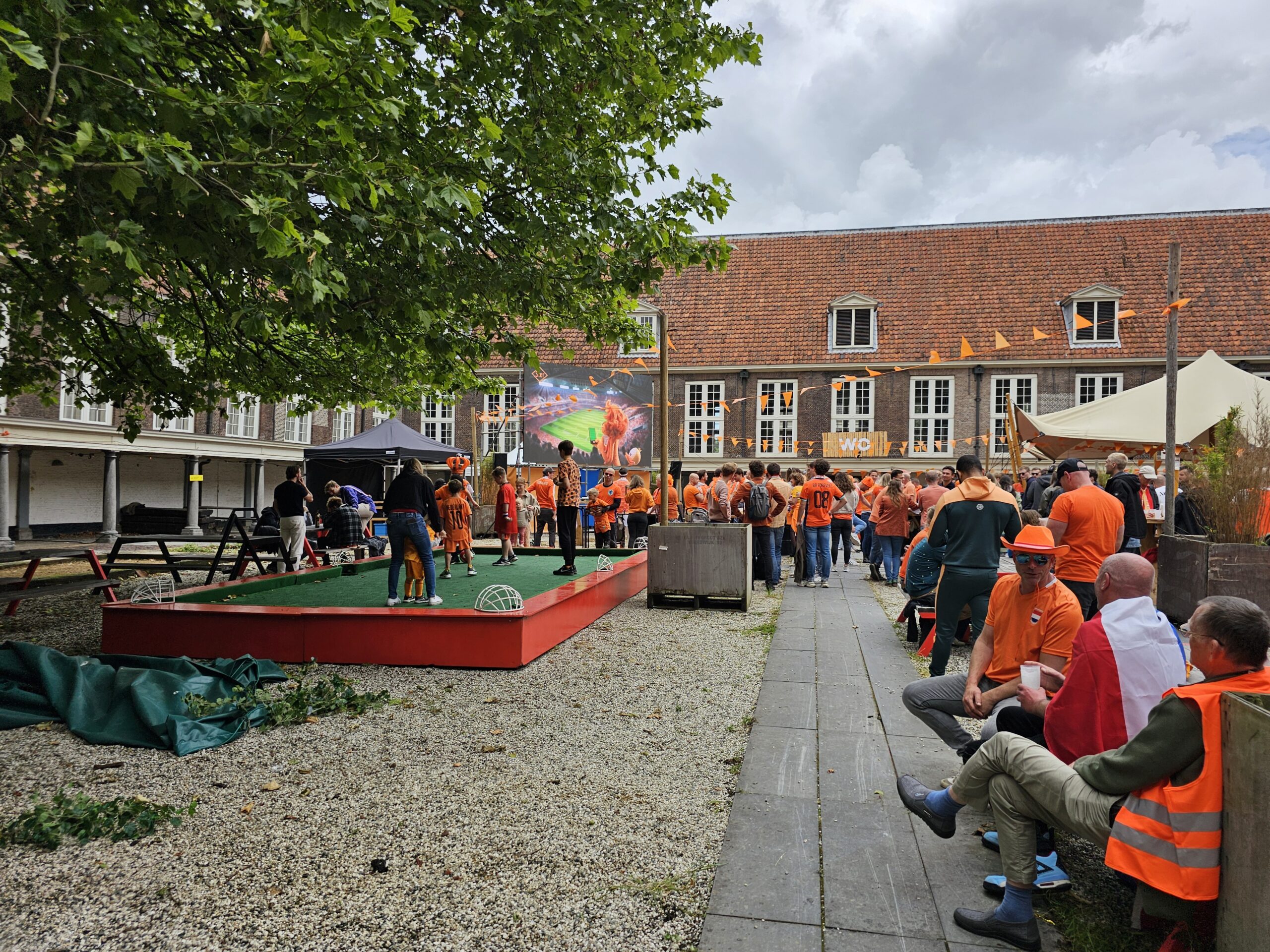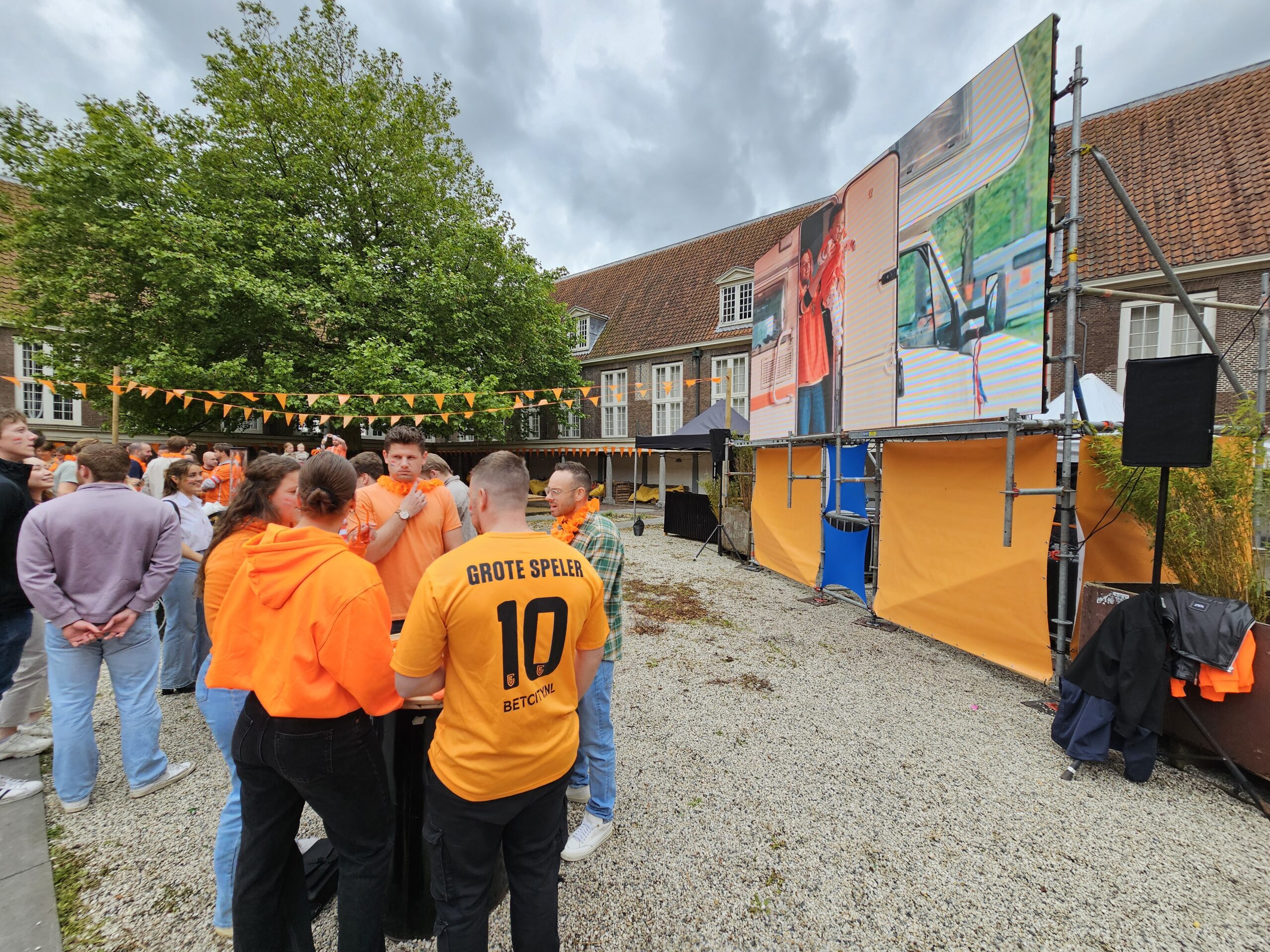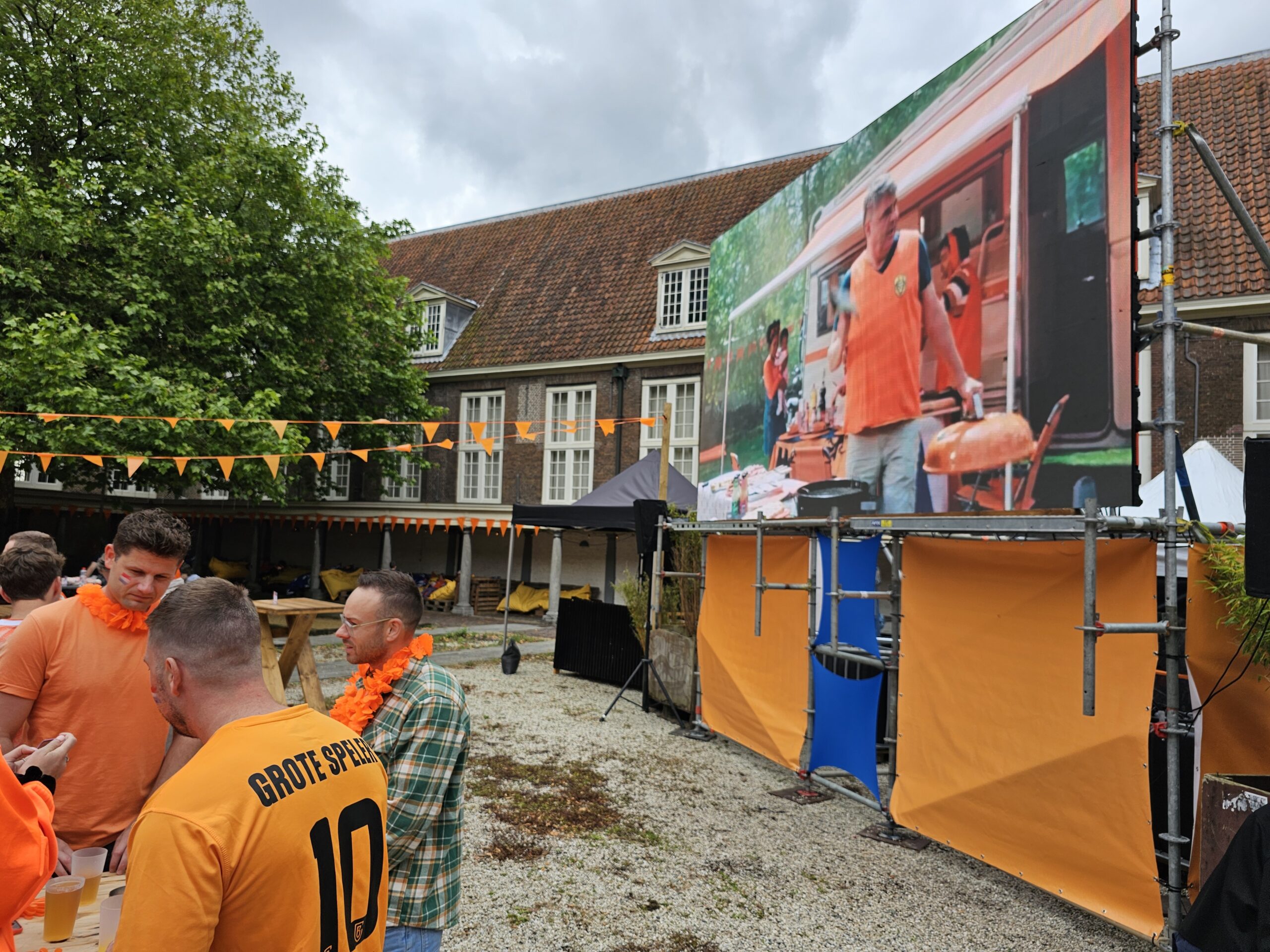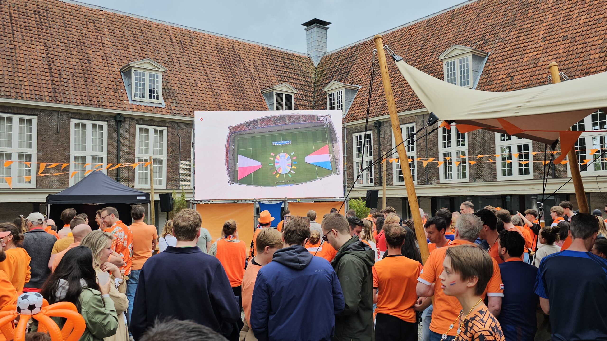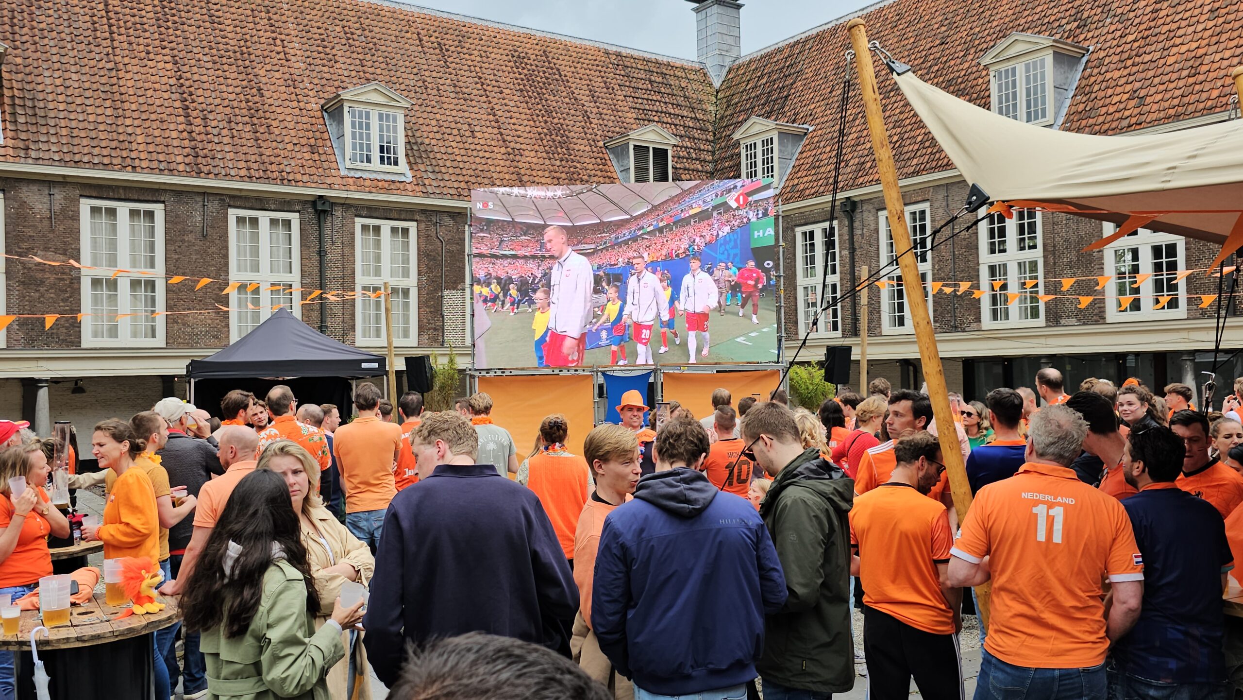 Stond er twee jaar geleden nog een groot scherm in een van de zalen van het Pesthuis, dit keer is de hele binnenplaats gevuld met uitzinnige Oranjefans die al ver voor aanvang van de wedstrijd een goed plekje kwamen opzoeken. Het opgestelde scherm is dit keer echter zo groot dat de wedstrijd vanuit elke hoek van het binnenplein goed te volgen is.