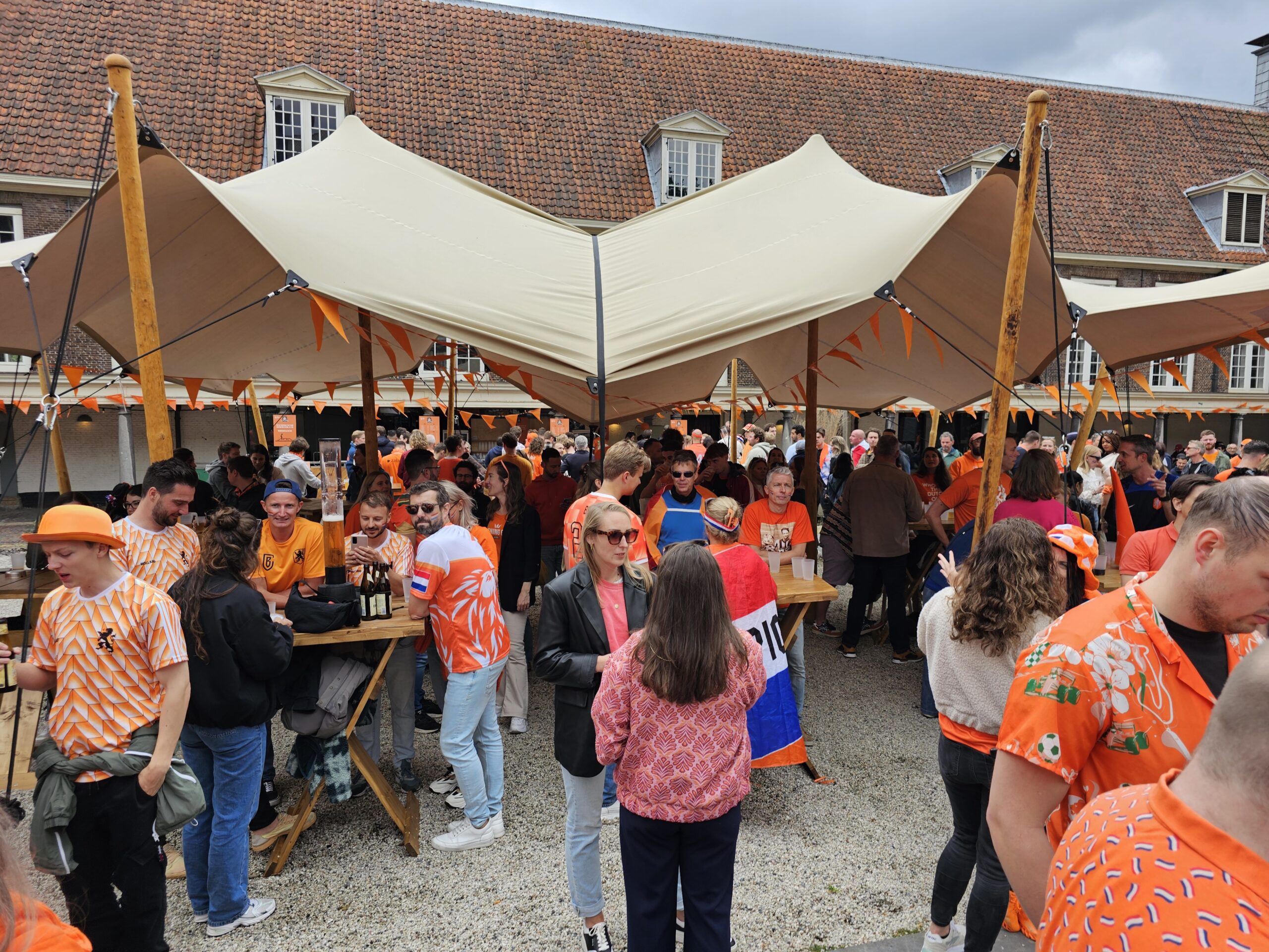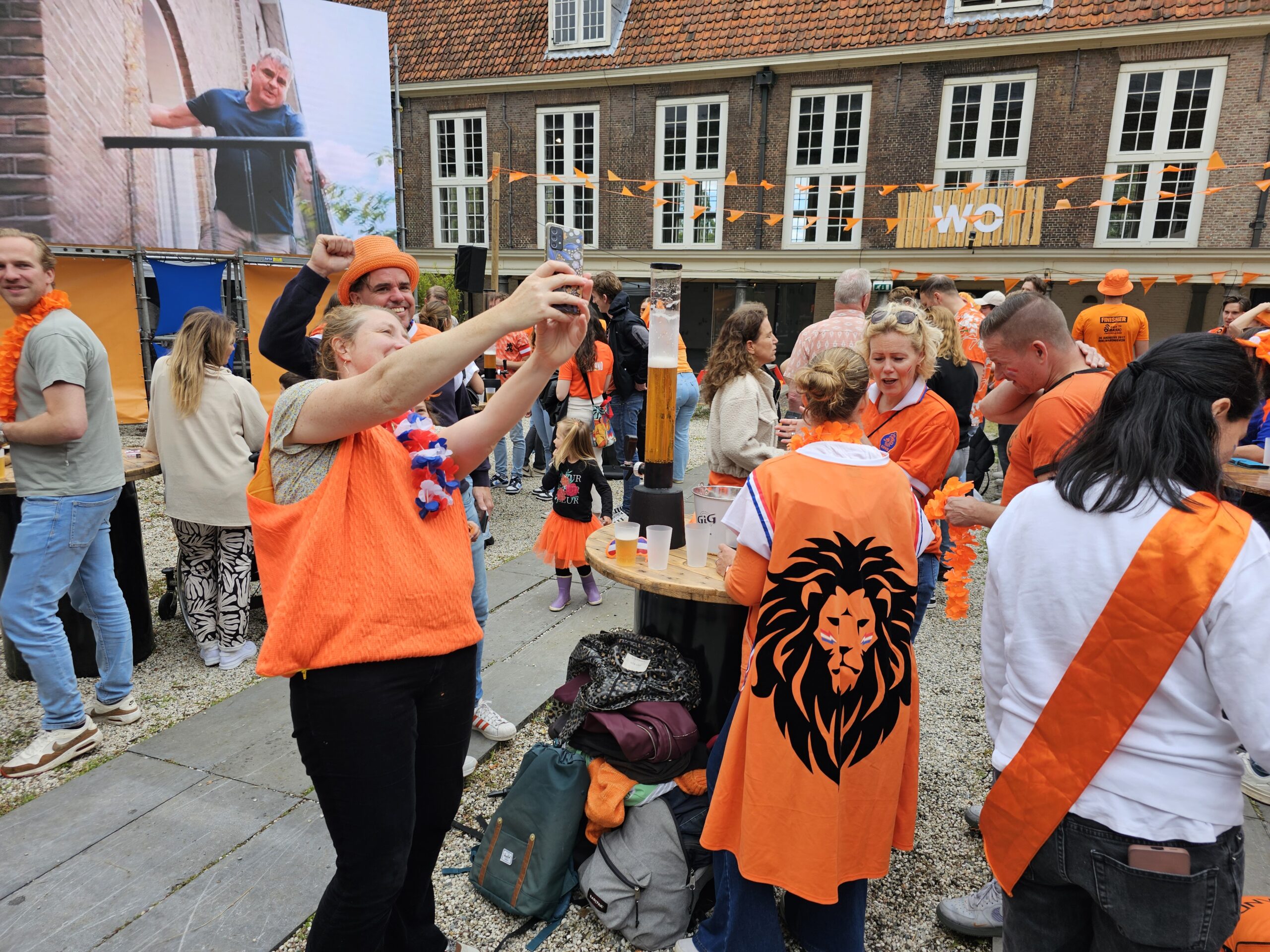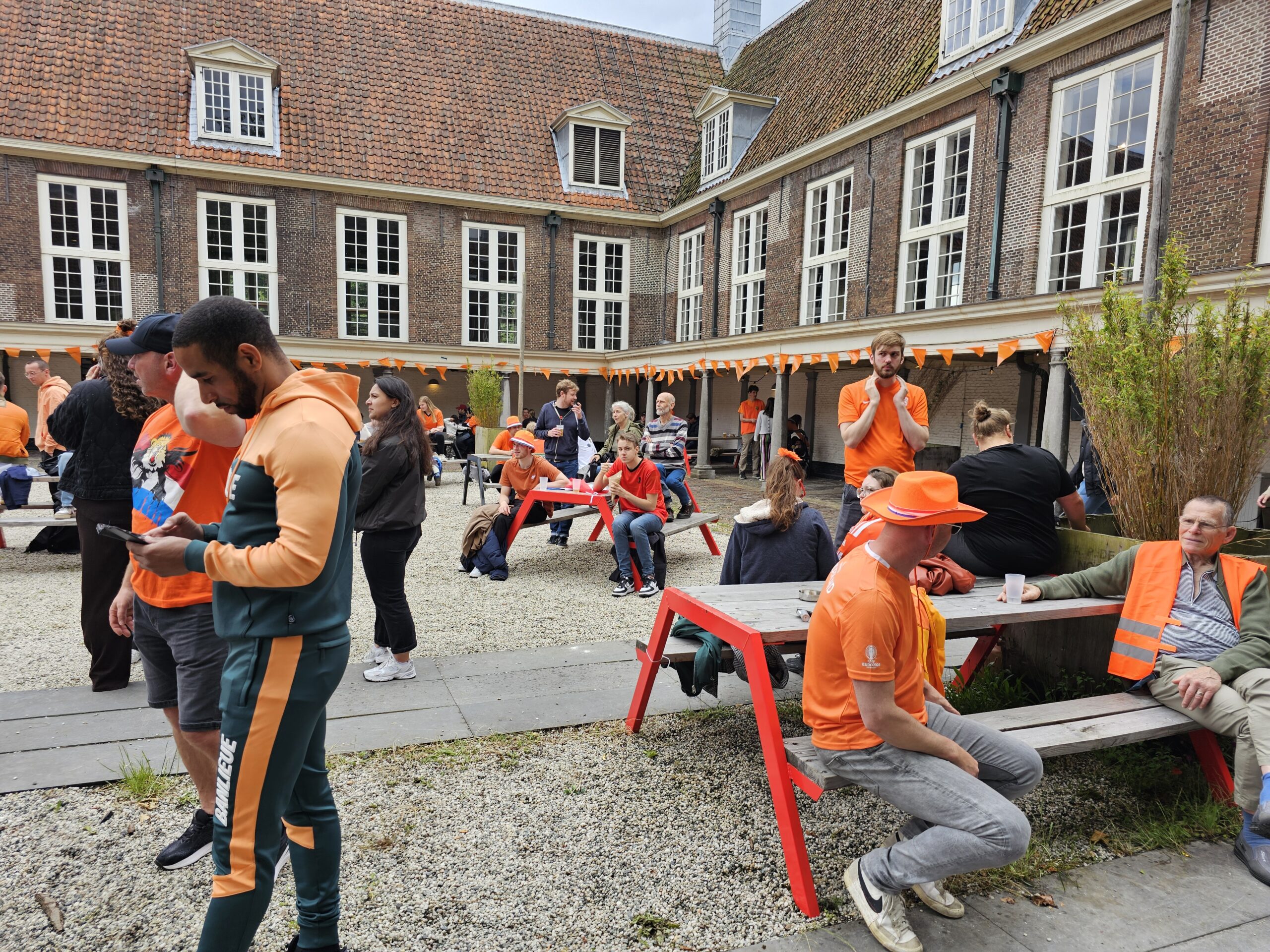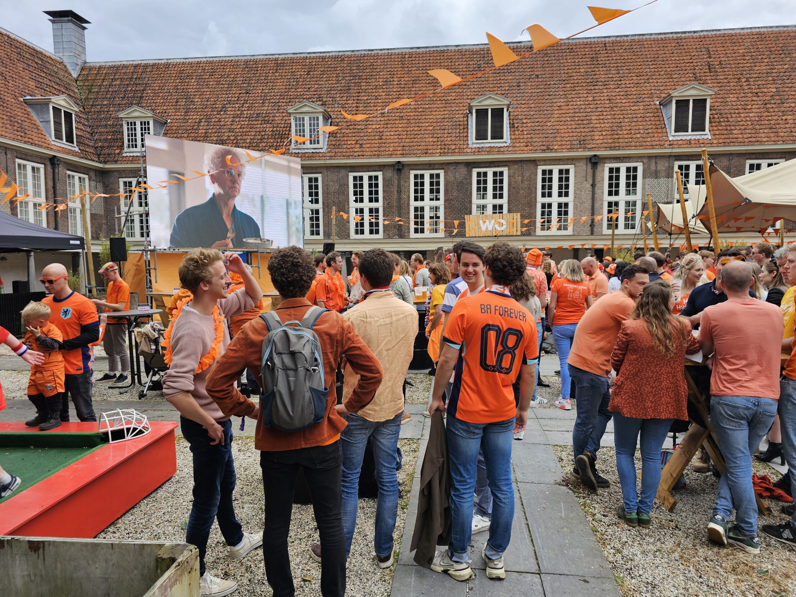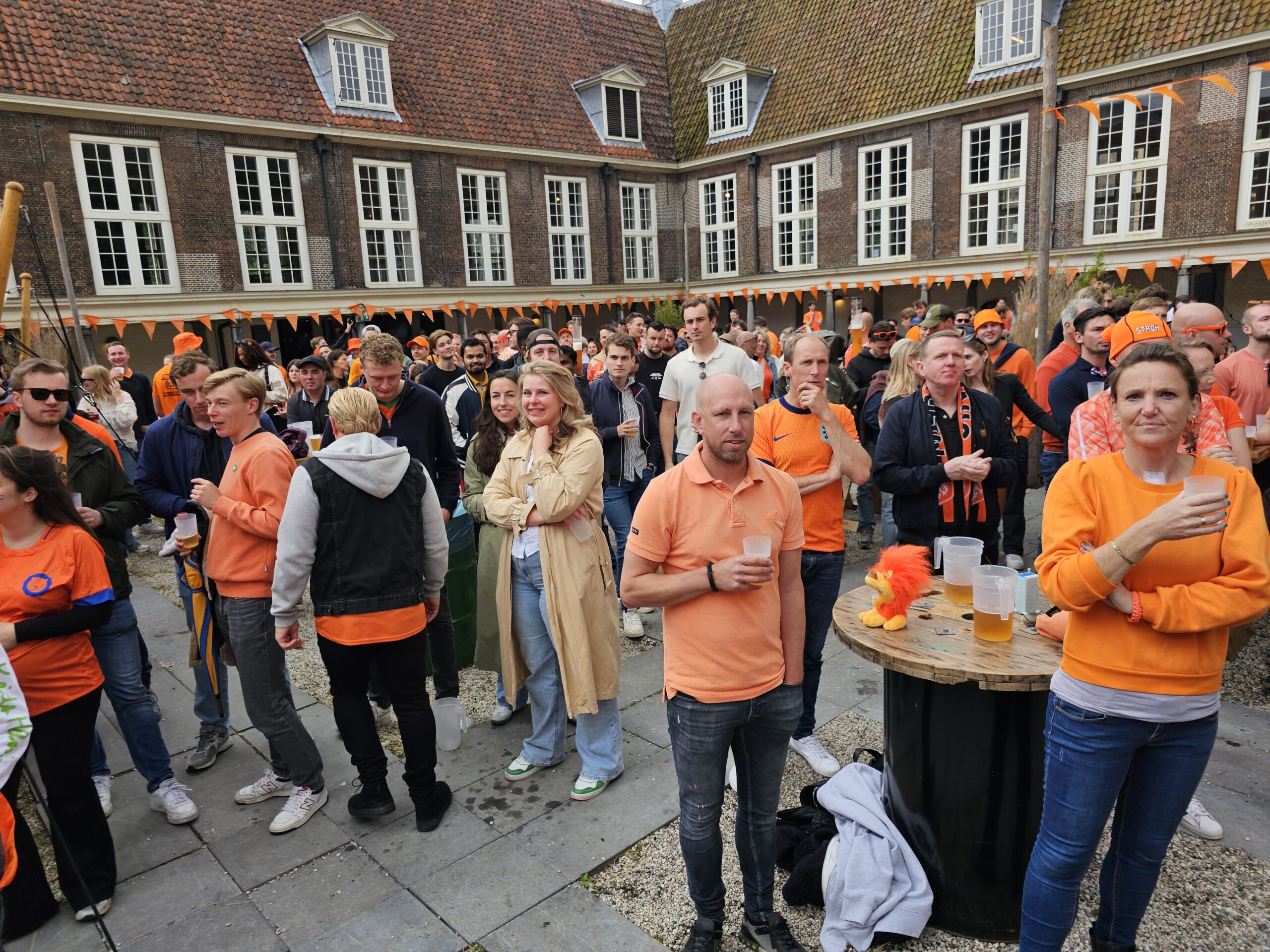 Stond er twee jaar geleden nog een groot scherm in een van de zalen van het Pesthuis, dit keer is de hele binnenplaats gevuld met uitzinnige Oranjefans die al ver voor aanvang van de wedstrijd een goed plekje kwamen opzoeken. Het opgestelde scherm is dit keer echter zo groot dat de wedstrijd vanuit elke hoek van het binnenplein goed te volgen is.