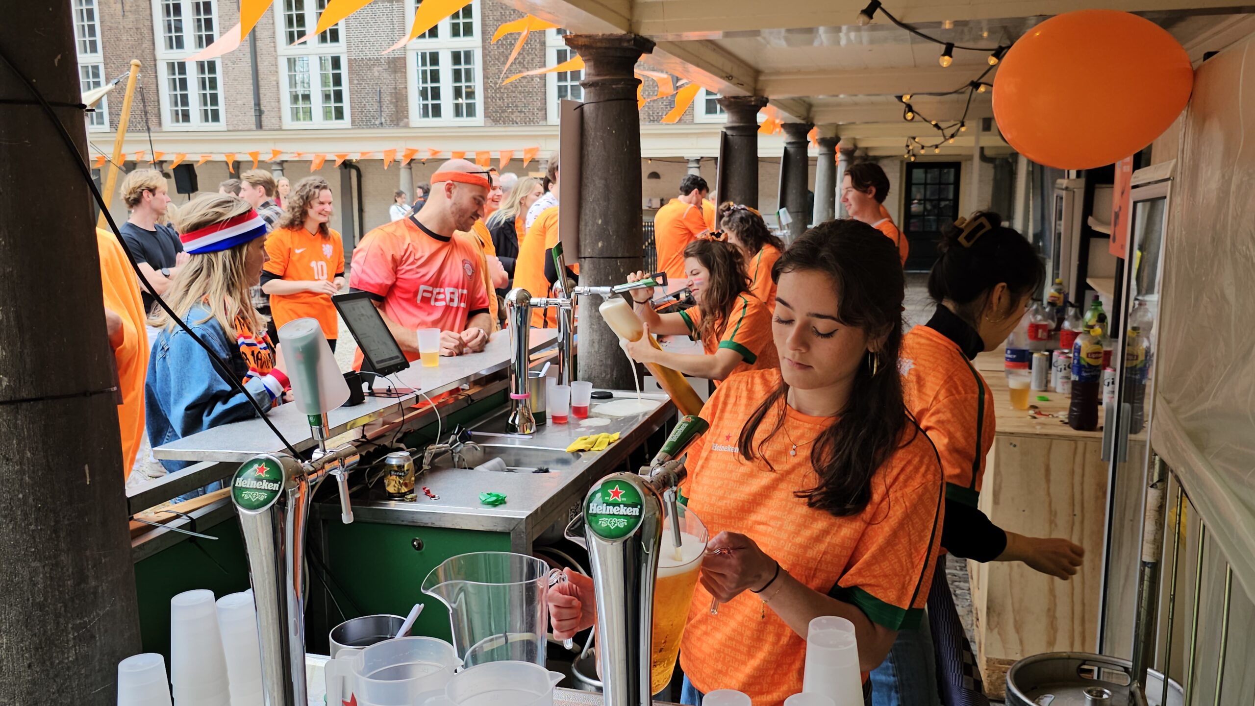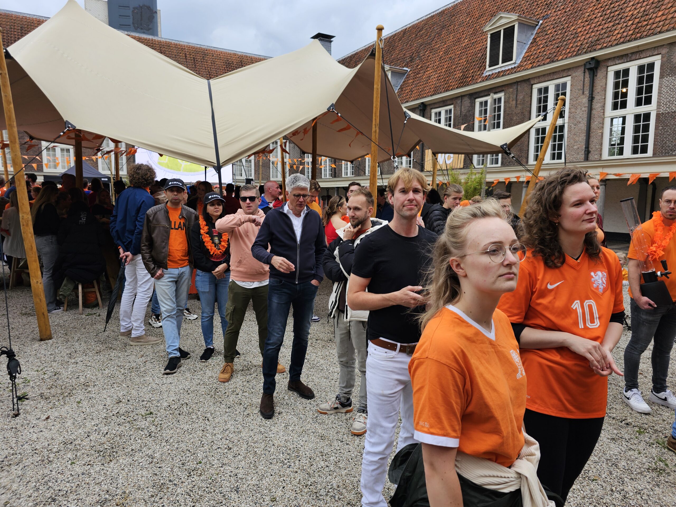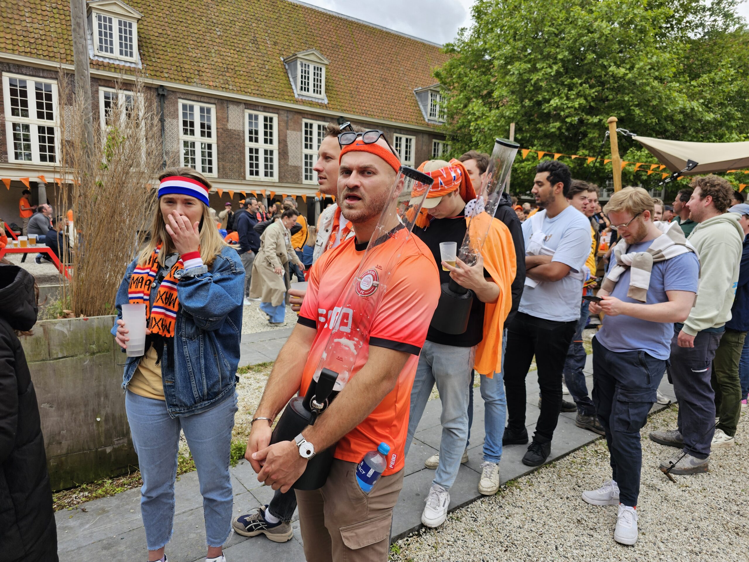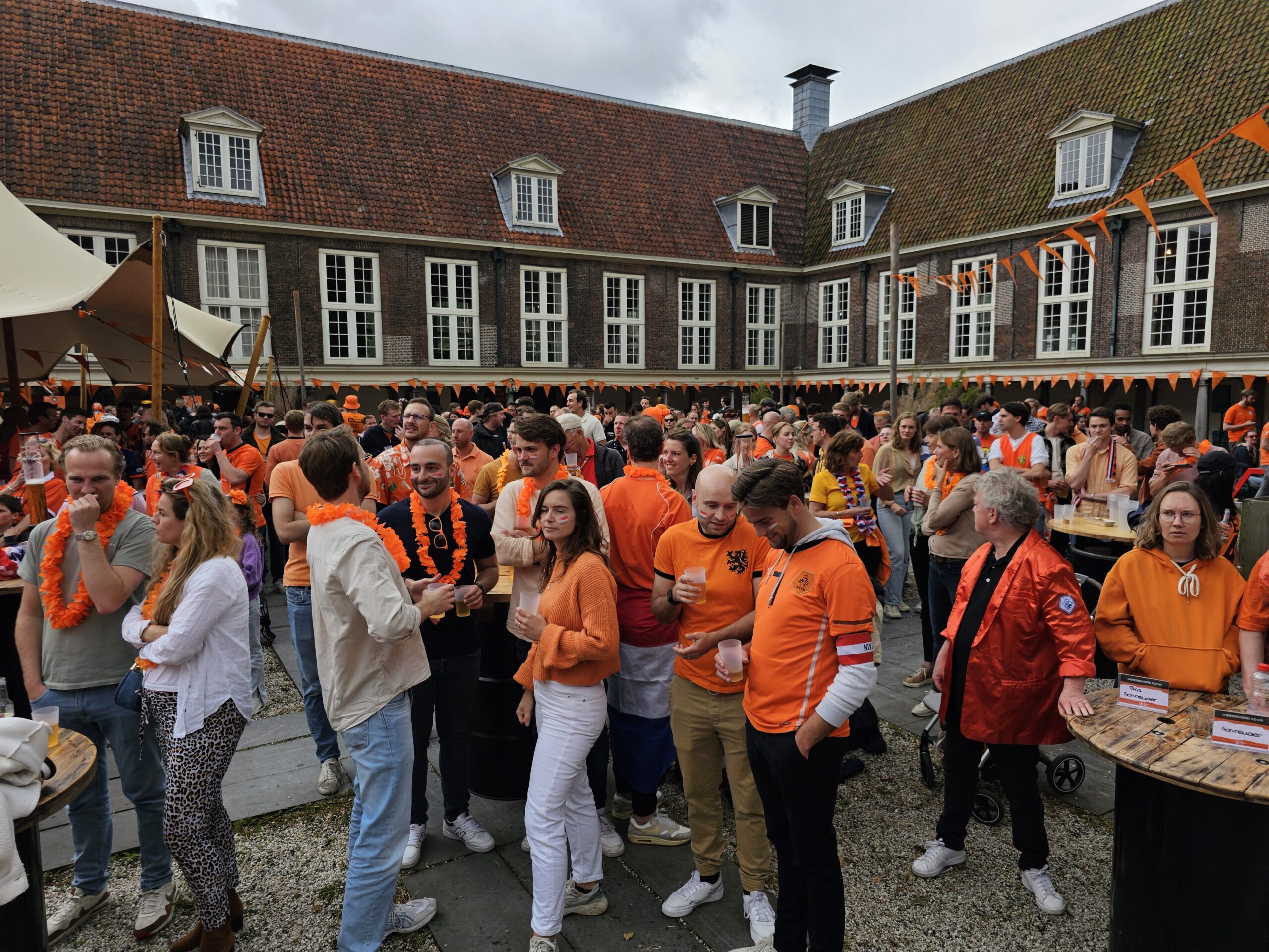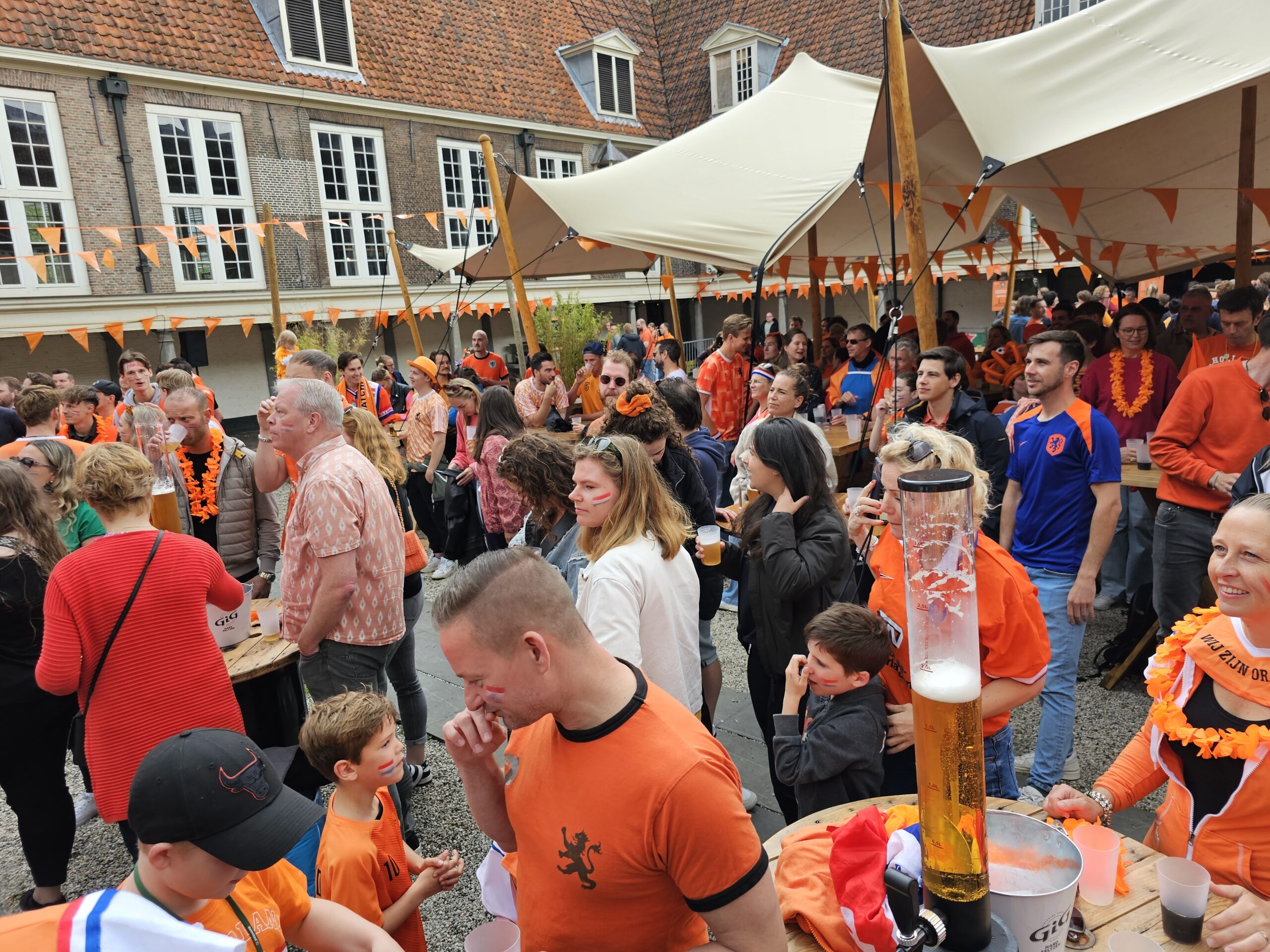 Stond er twee jaar geleden nog een groot scherm in een van de zalen van het Pesthuis, dit keer is de hele binnenplaats gevuld met uitzinnige Oranjefans die al ver voor aanvang van de wedstrijd een goed plekje kwamen opzoeken. Het opgestelde scherm is dit keer echter zo groot dat de wedstrijd vanuit elke hoek van het binnenplein goed te volgen is.