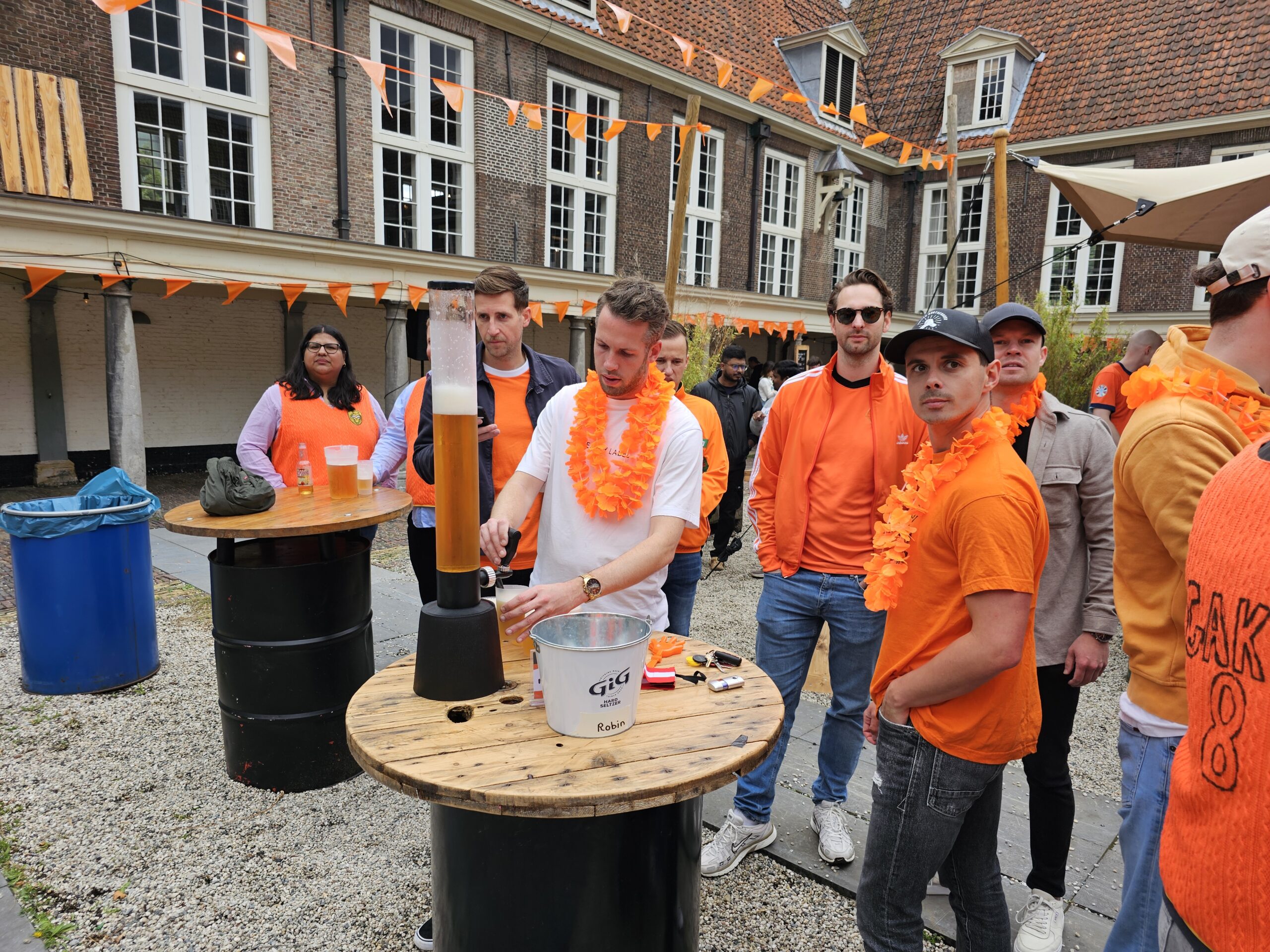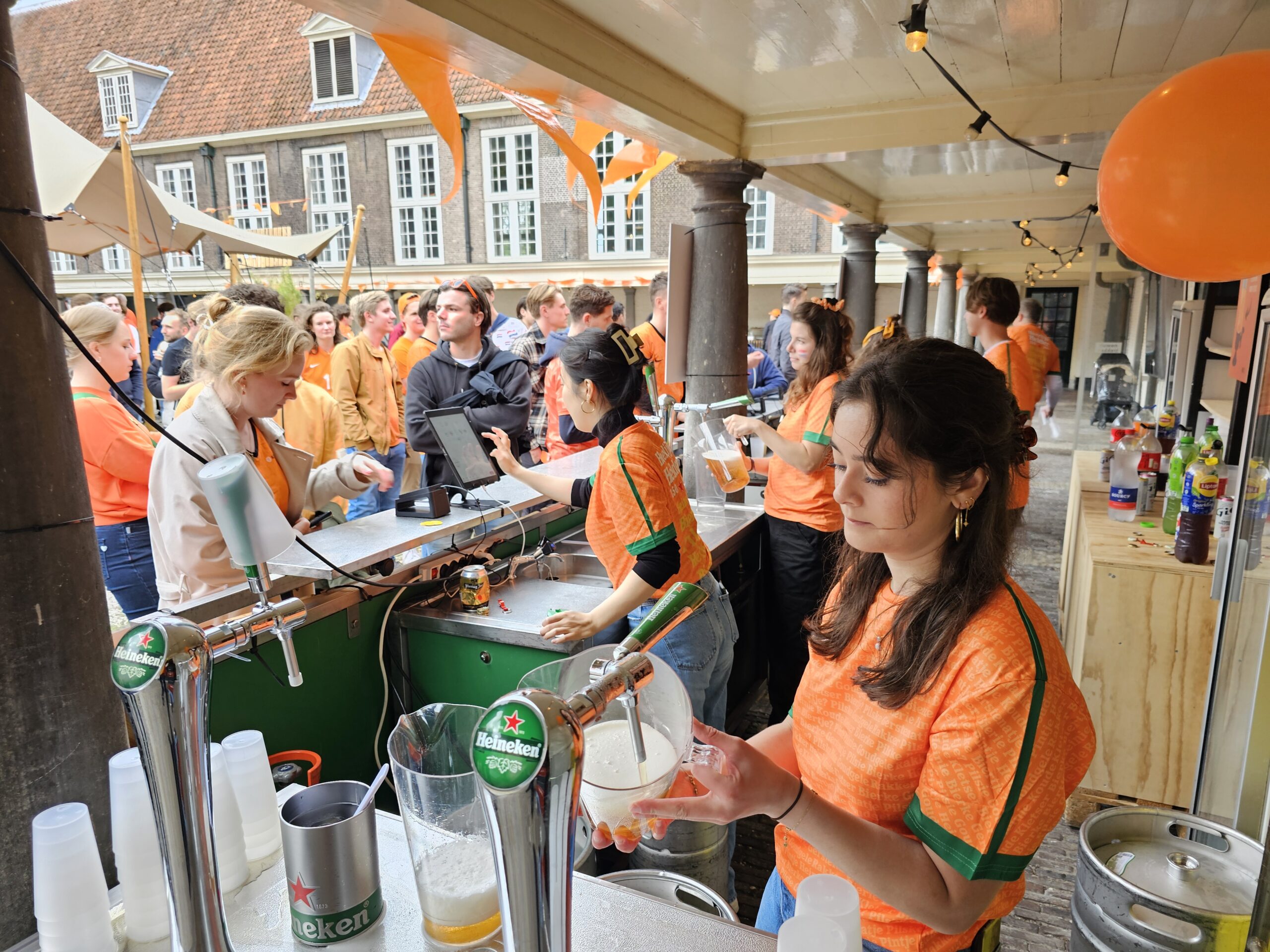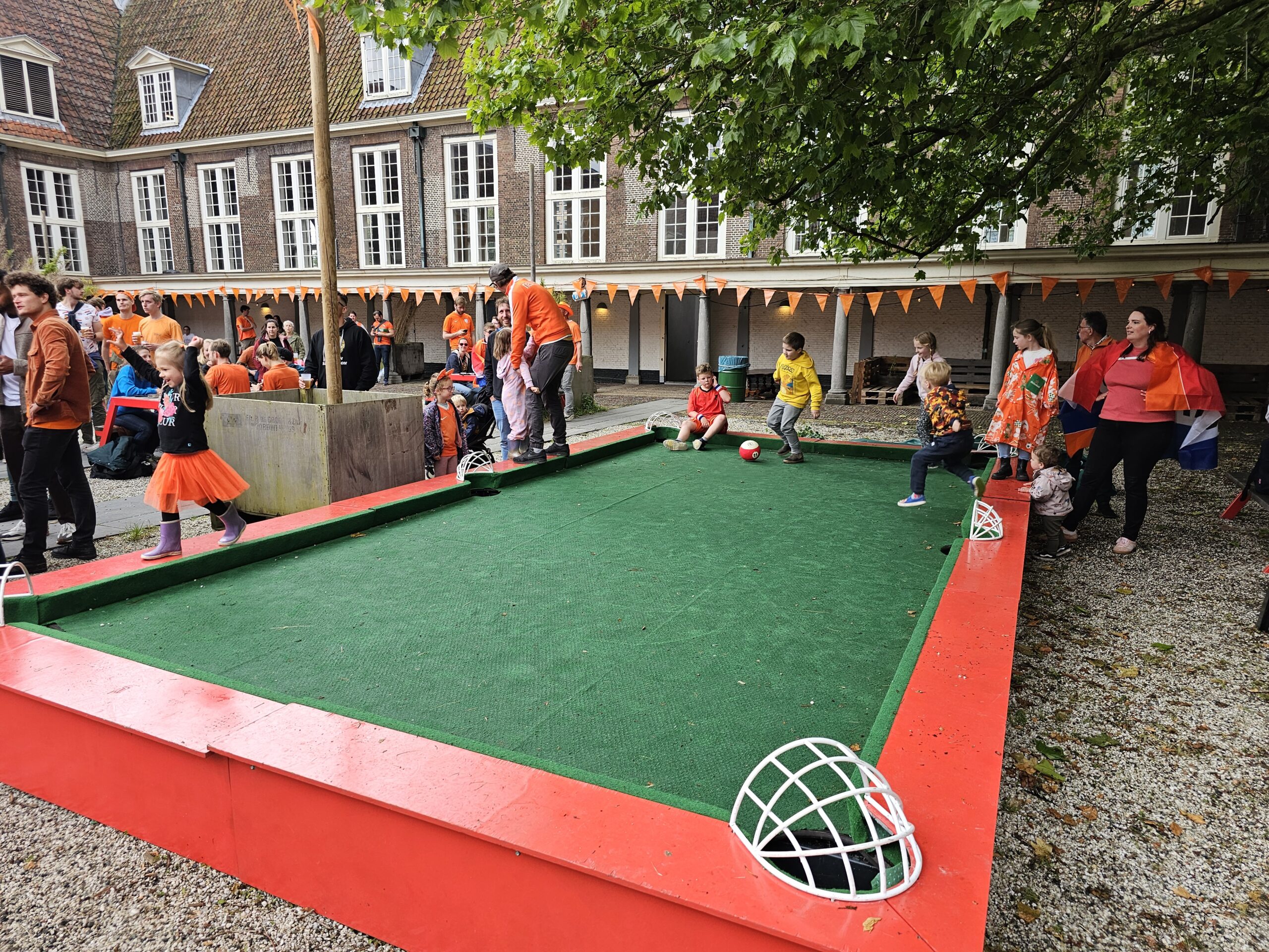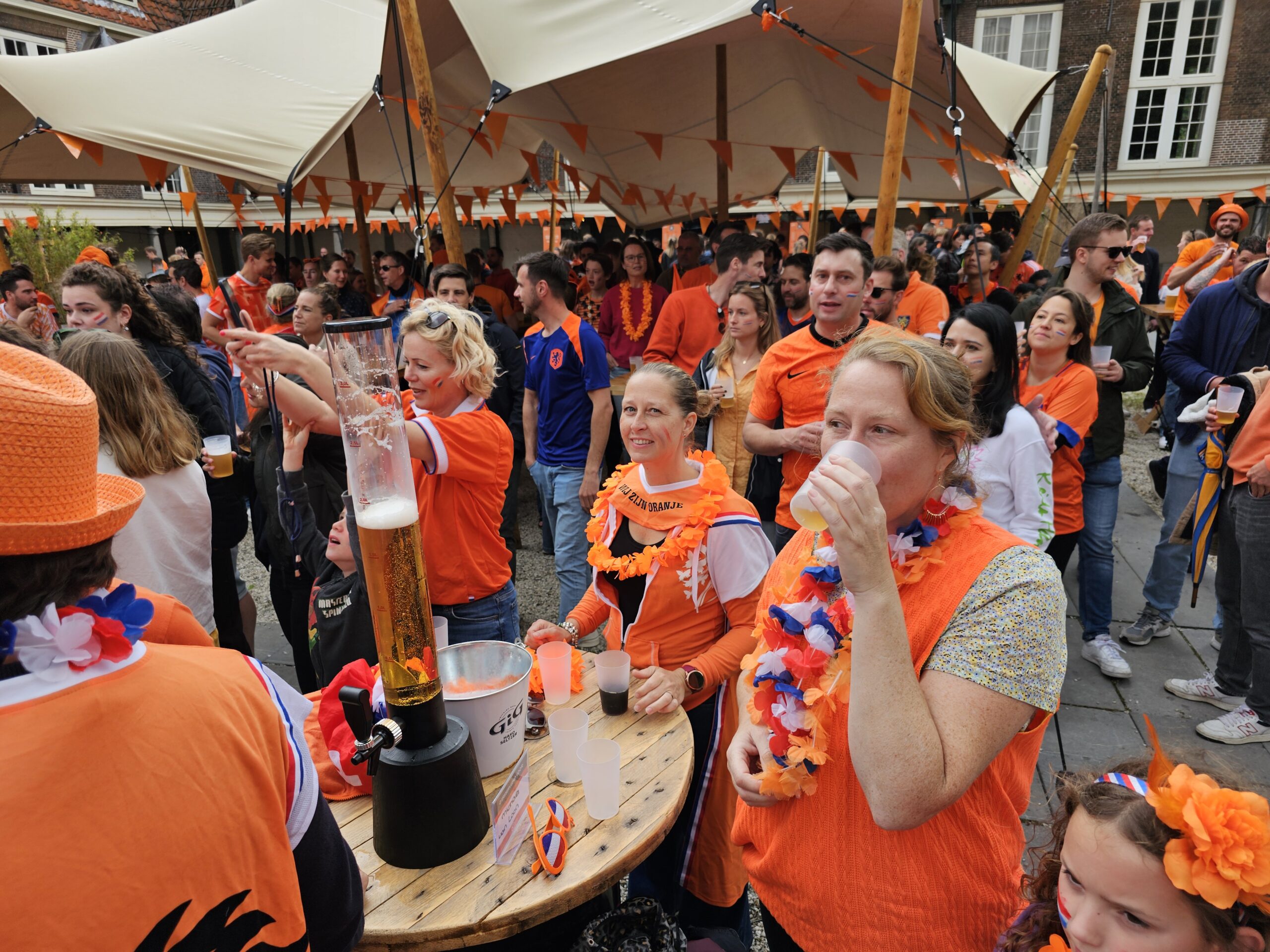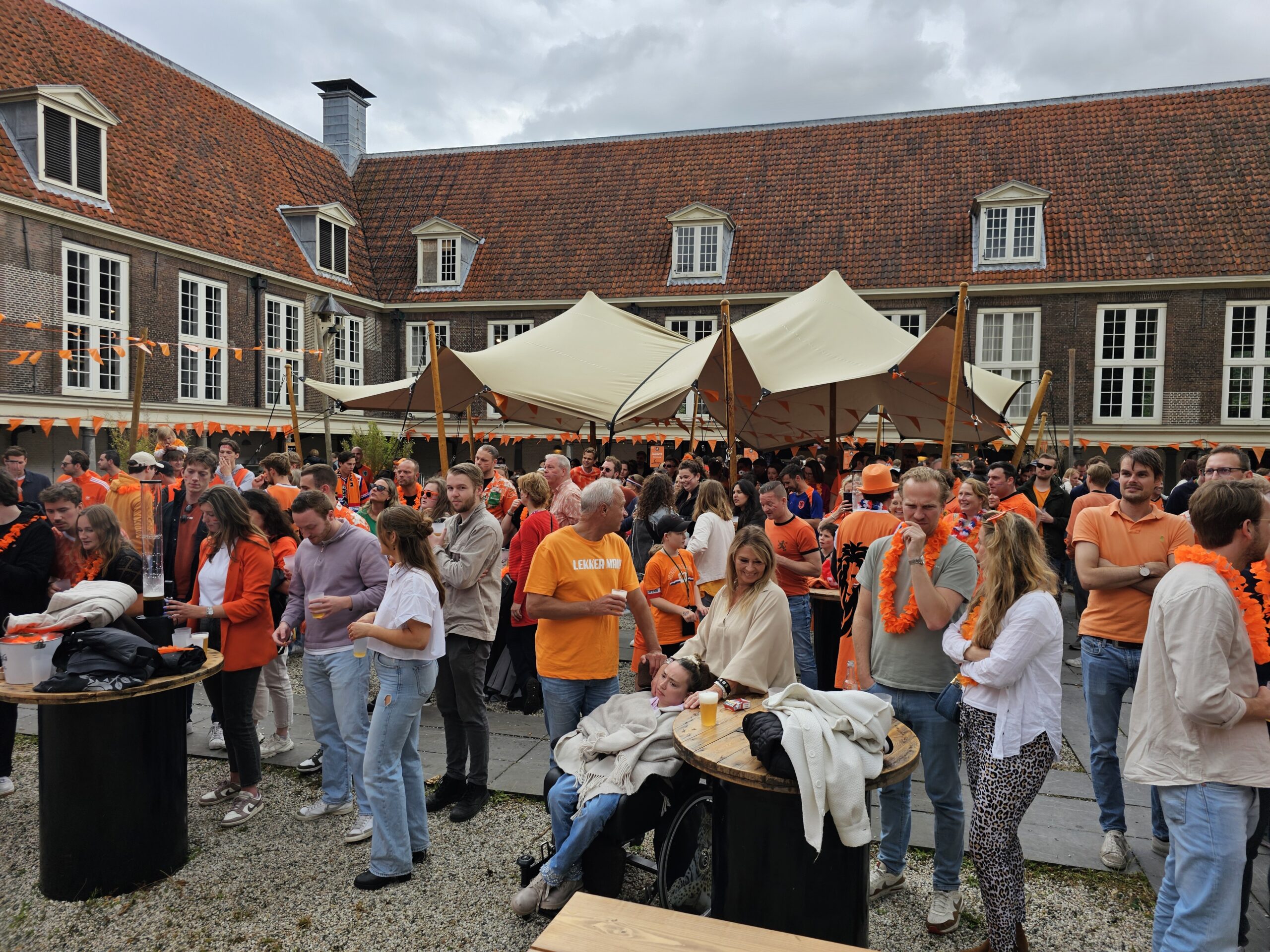 Stond er twee jaar geleden nog een groot scherm in een van de zalen van het Pesthuis, dit keer is de hele binnenplaats gevuld met uitzinnige Oranjefans die al ver voor aanvang van de wedstrijd een goed plekje kwamen opzoeken. Het opgestelde scherm is dit keer echter zo groot dat de wedstrijd vanuit elke hoek van het binnenplein goed te volgen is.