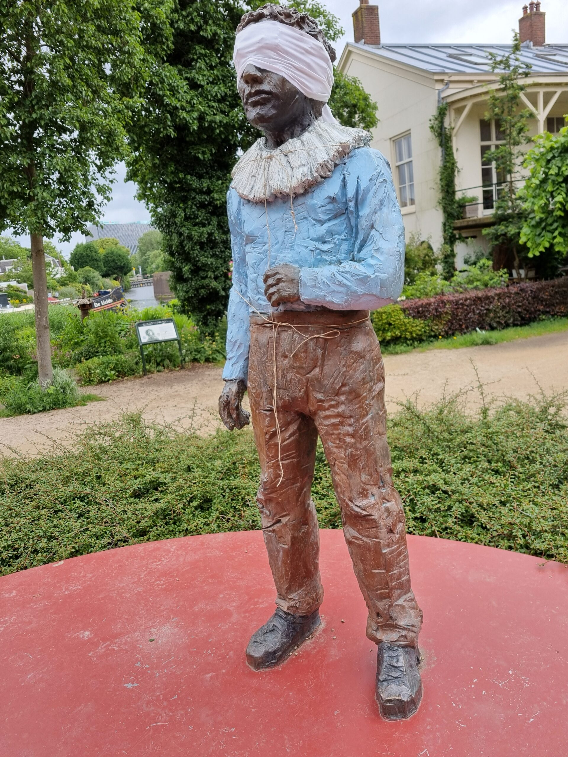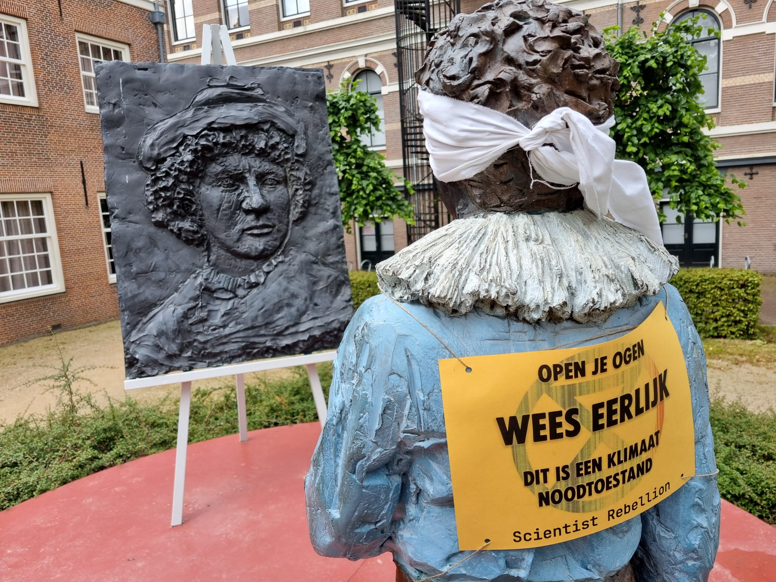 Leden van de organisatie Scientist Rebellion hebben het beeld van de Jonge Rembrandt geblinddoekt. Het bronzen beeld staat op het pleintje naast de Weddesteeg. Vlakbij de plek waar de schilder in 1606 werd geboren.