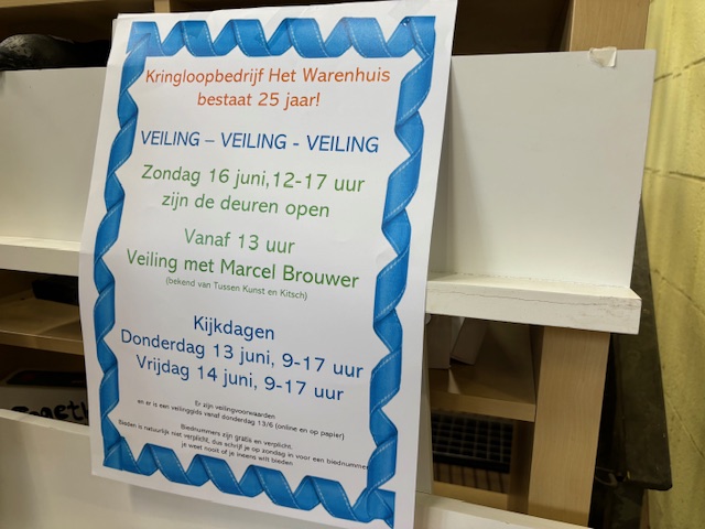 De kavels varieerden van een ‘schilderij gesigneerd H.W. Mesdag’ en Leerdam-glaswerk van Andries Copier tot een antieke trekharmonica van rond 1900 en een Jugendstil-lamp van opaalglas. Er waren meer dan zestig bieders bij de veiling, onderdeel van de viering van het 25-jarig bestaan van het kringloopbedrijf. De opbrengst komt ten goede aan Stichting Het Warenhuis.