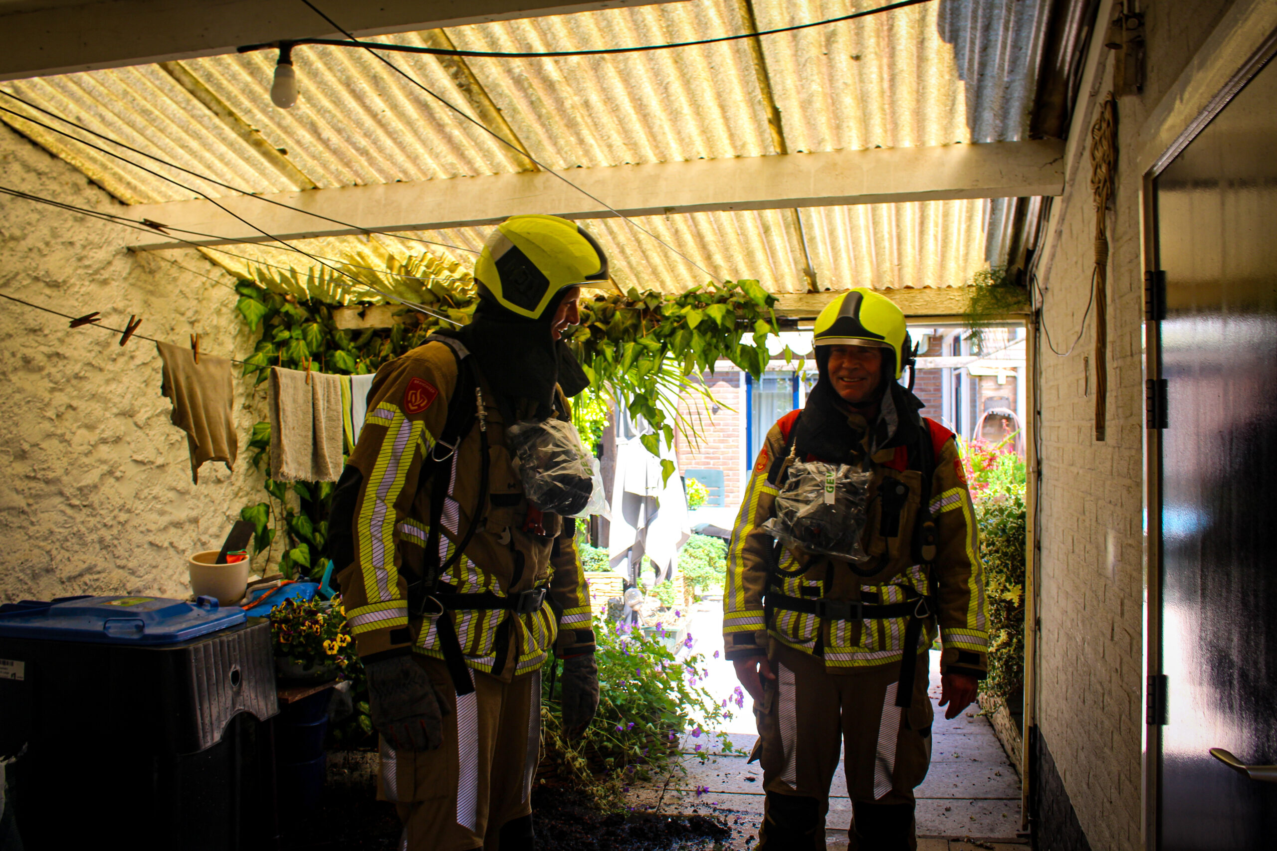De brandweer heeft de vlammen geblust en wist zo te voorkomen dat de brand oversloeg naar het woonhuis. Onder de overkapping is de nodige schade ontstaan.