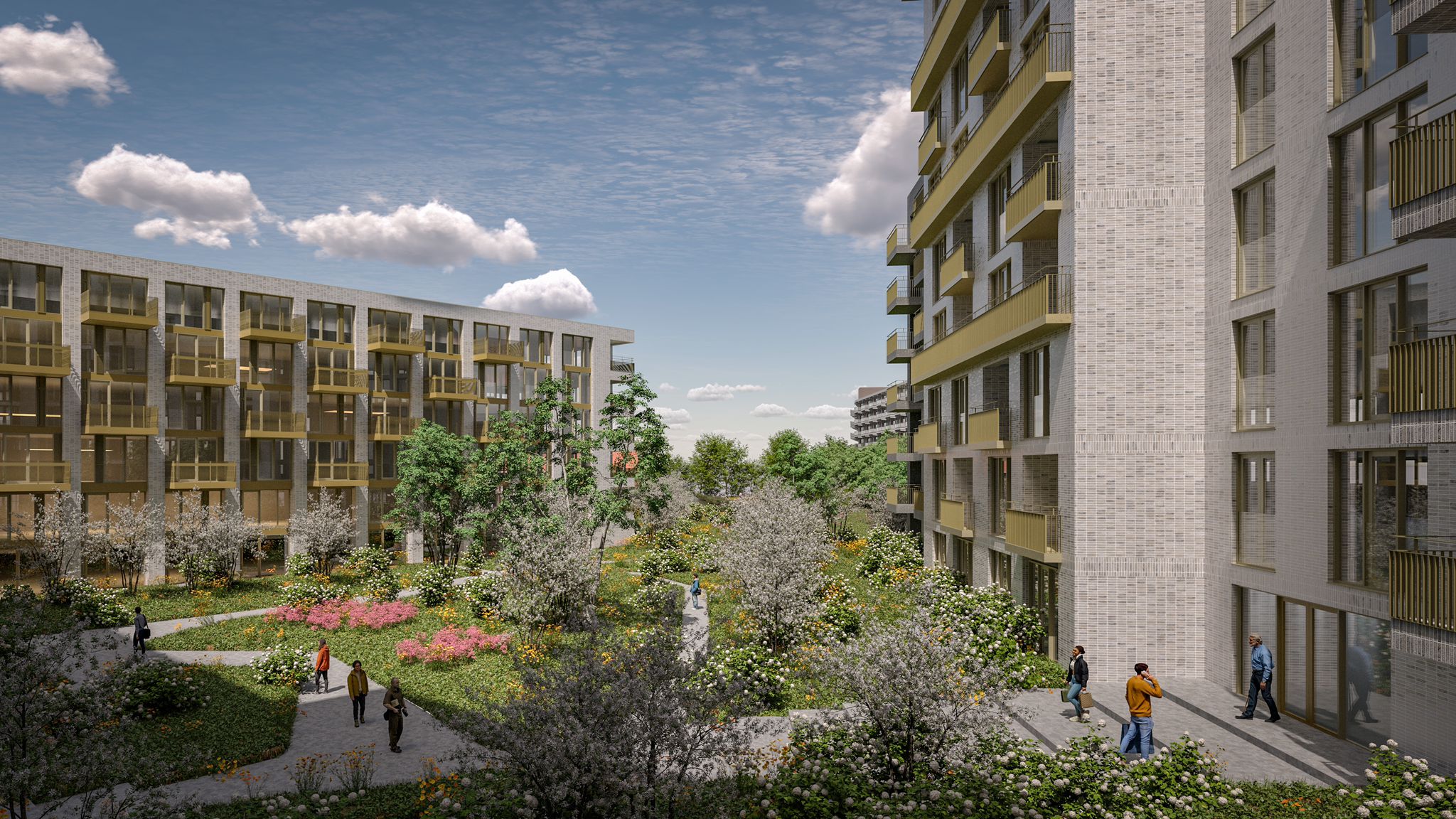 De woningen op de parkeergarage krijgen in het midden een gemeenschappelijke binnentuin op hoogte. Tussen de nieuwe gebouwen wordt een park aangelegd van zo’n 3.000 vierkante meter.