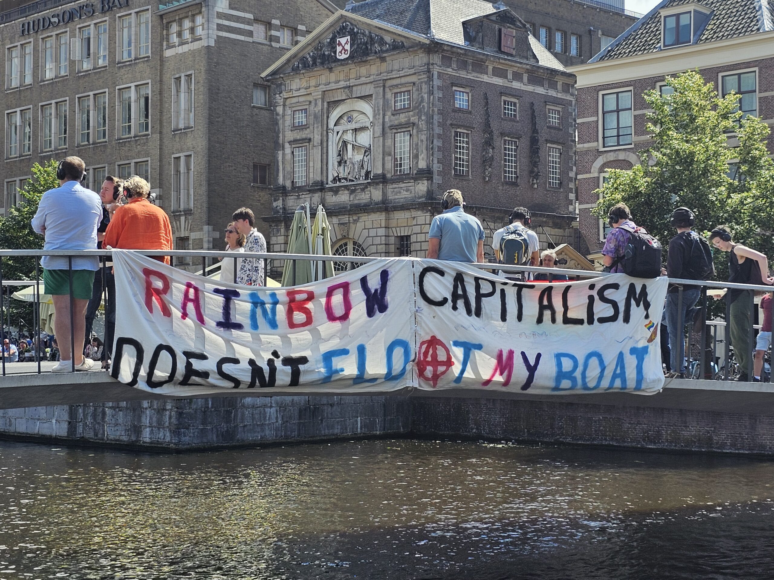 “Pride is van origine een protest”, vertelt creatief directeur van Theater De Generator Jonny Tudor, initiatiefnemer van het optreden en deelnemer aan het protest. “Terwijl zij de banner wilden ophangen sprongen er vijf, zes agenten bovenop hen. Ik heb het met eigen ogen gezien en gevoeld hoe de politie ons van die brug af heeft geslagen.”