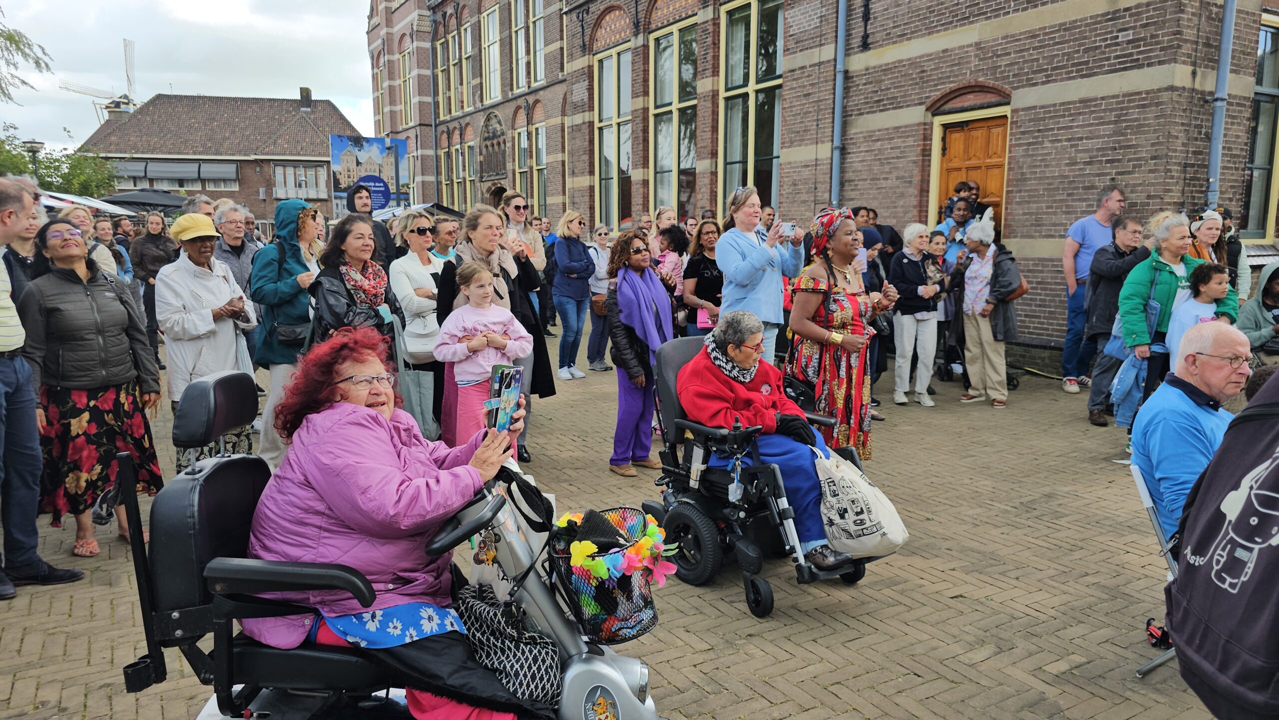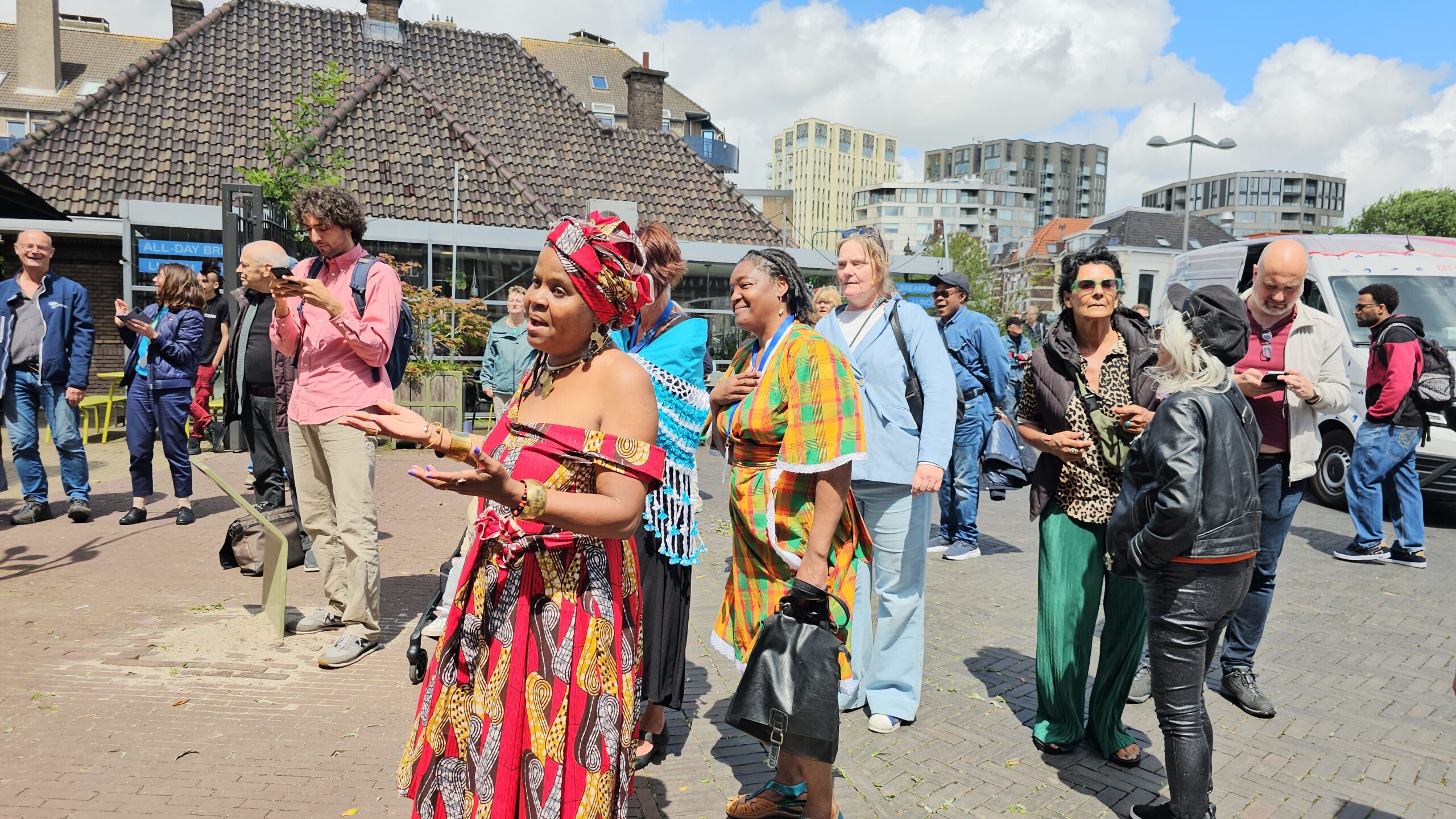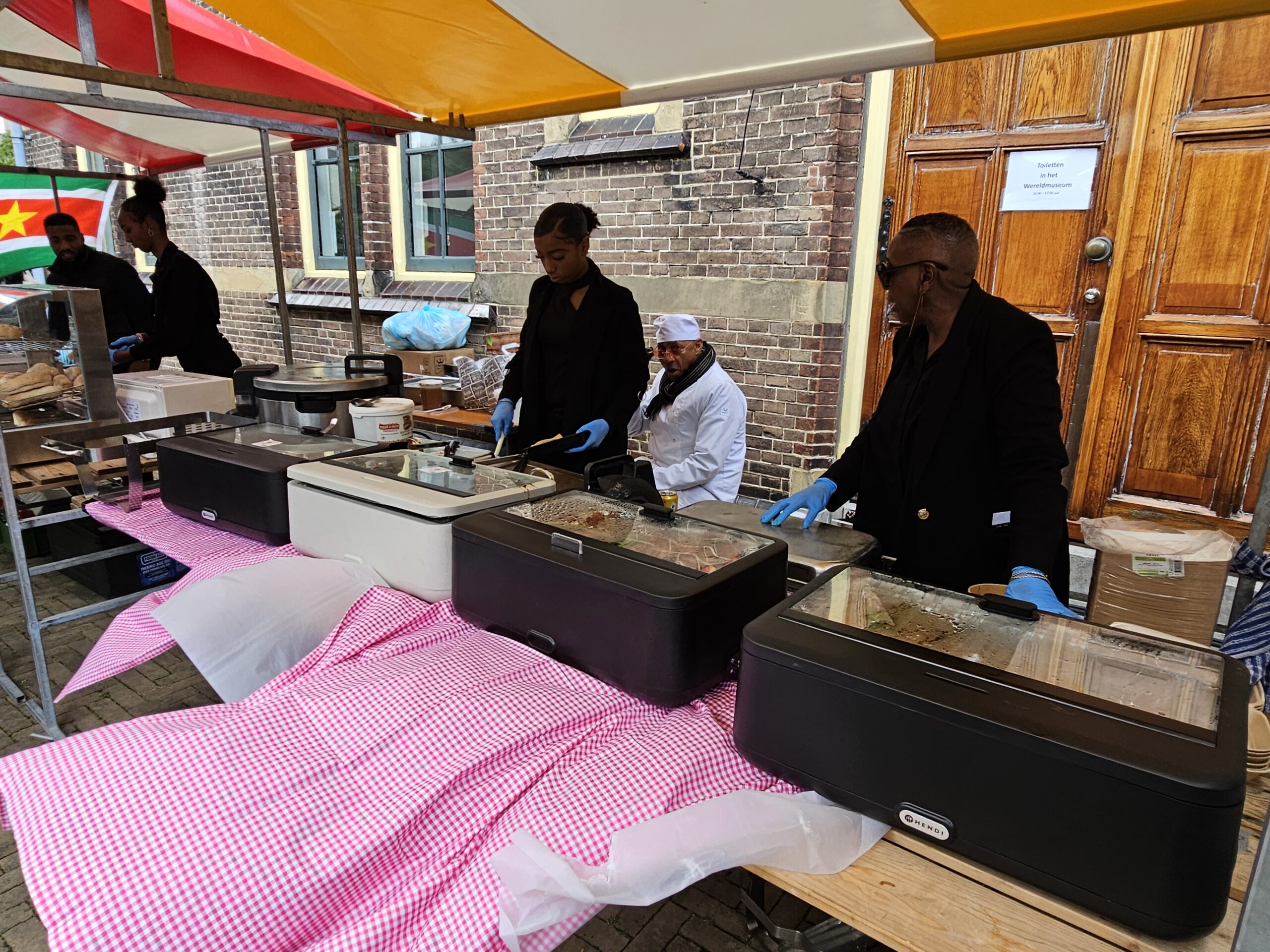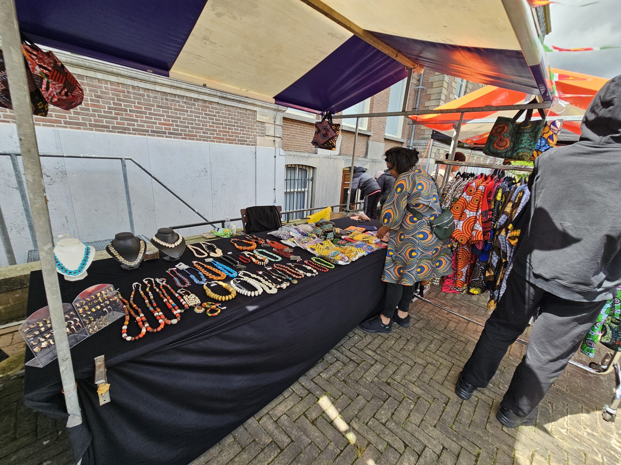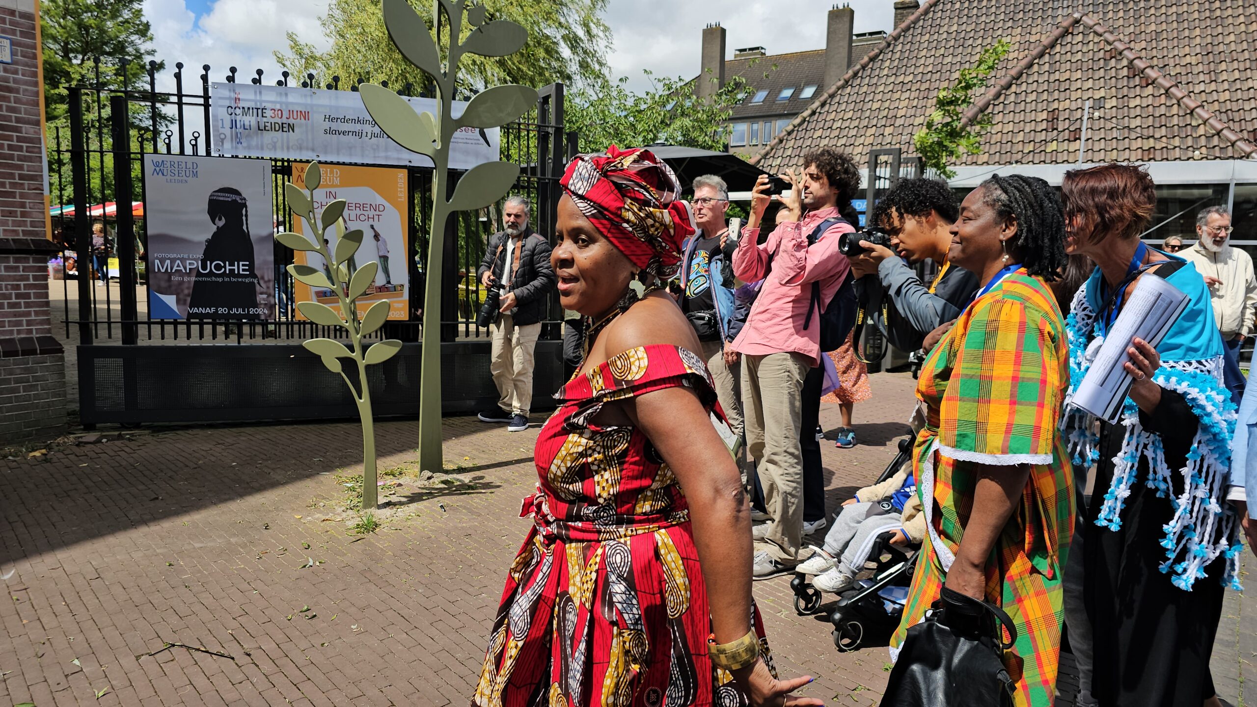 Standjes met allerlei hapjes en drankjes, maar ook met kleurrijke kleding en kunst, vulden zaterdagmiddag het buitenterrein van Wereldmuseum Leiden. Songs of Freedom organiseerde er op feestelijke wijze het verbreken van de ketenen, oftewel: Keti Koti. Een week eerder werden de slachtoffers van ons slavernijverleden al herdacht.