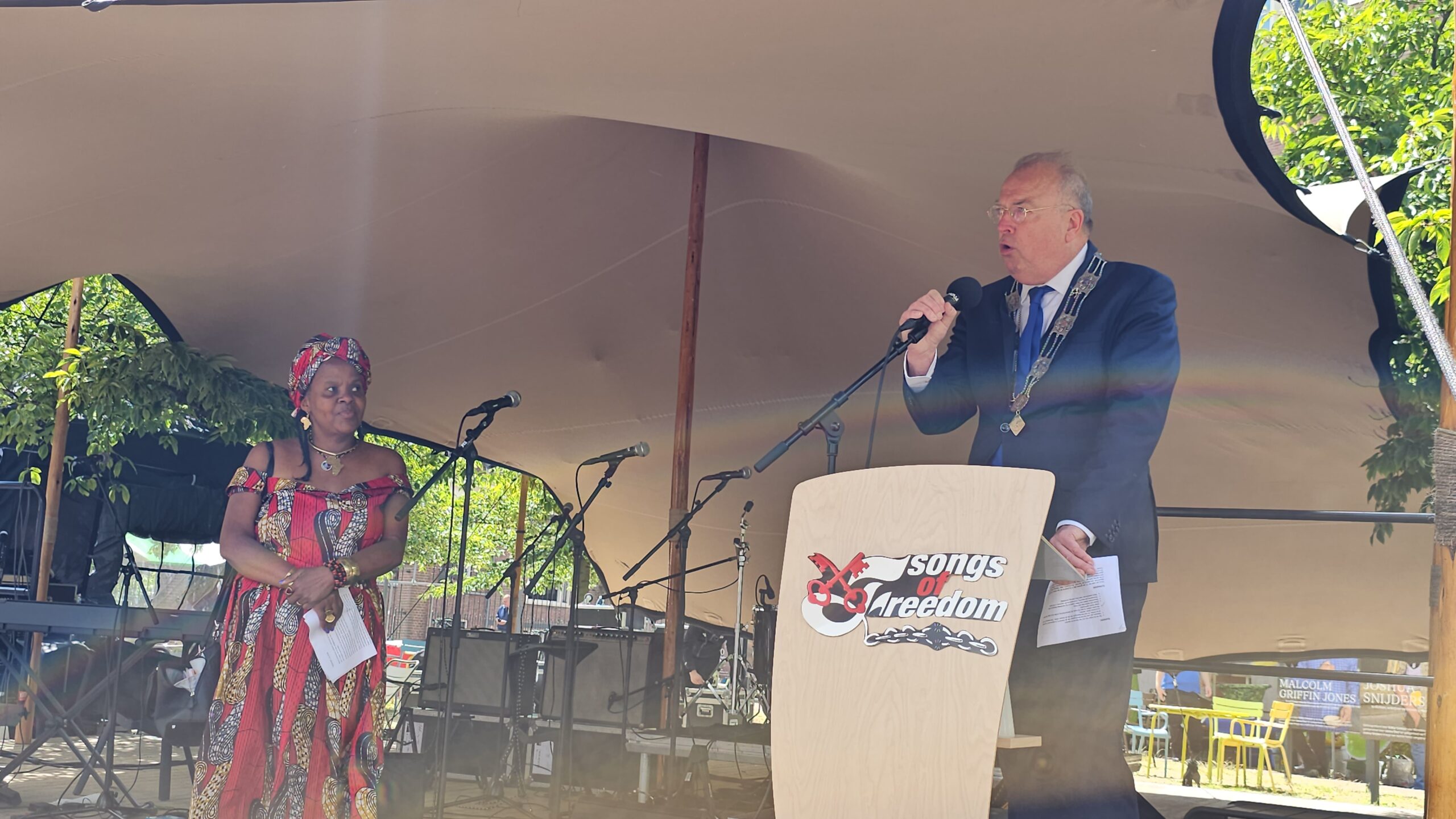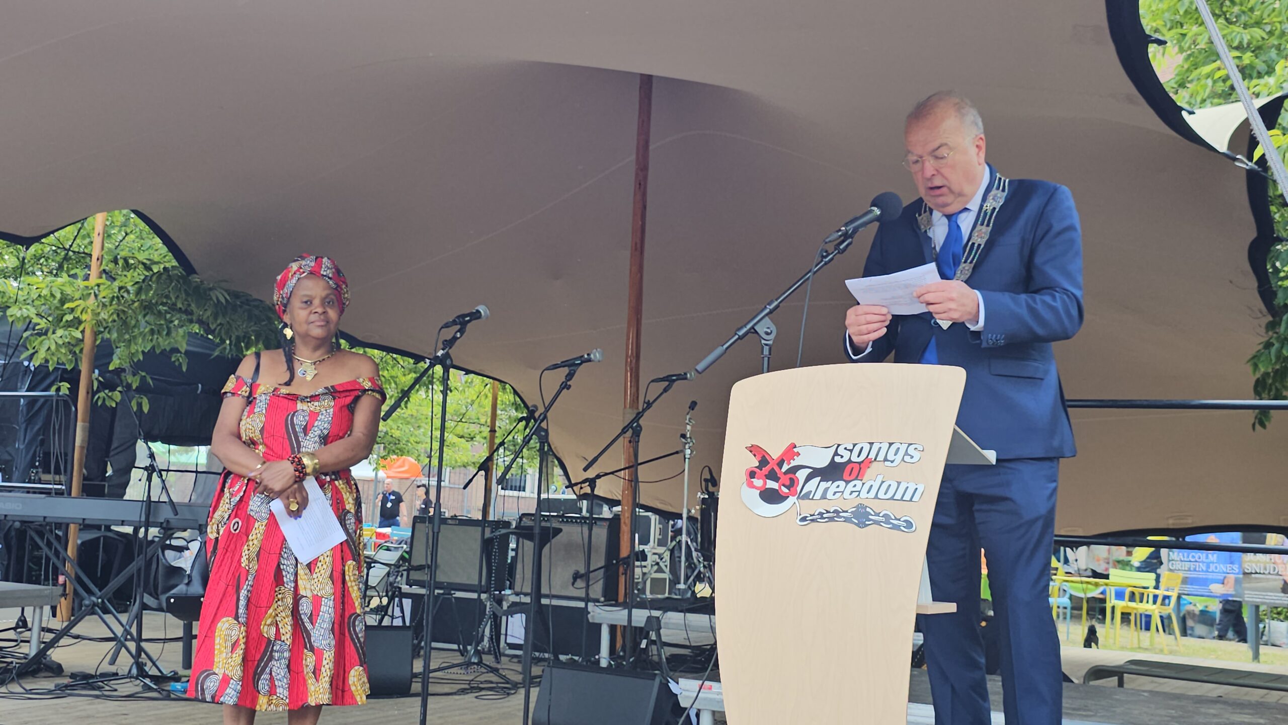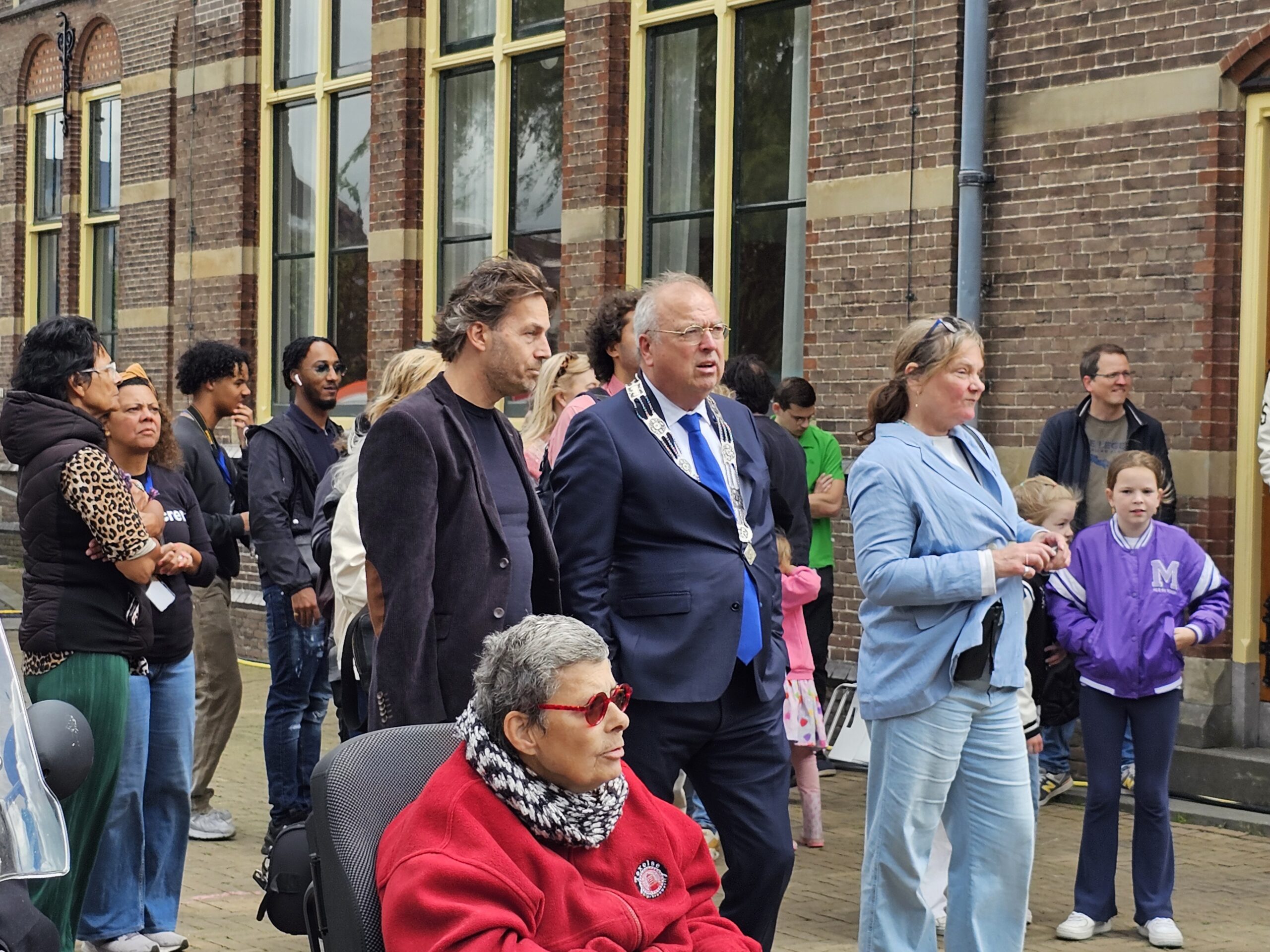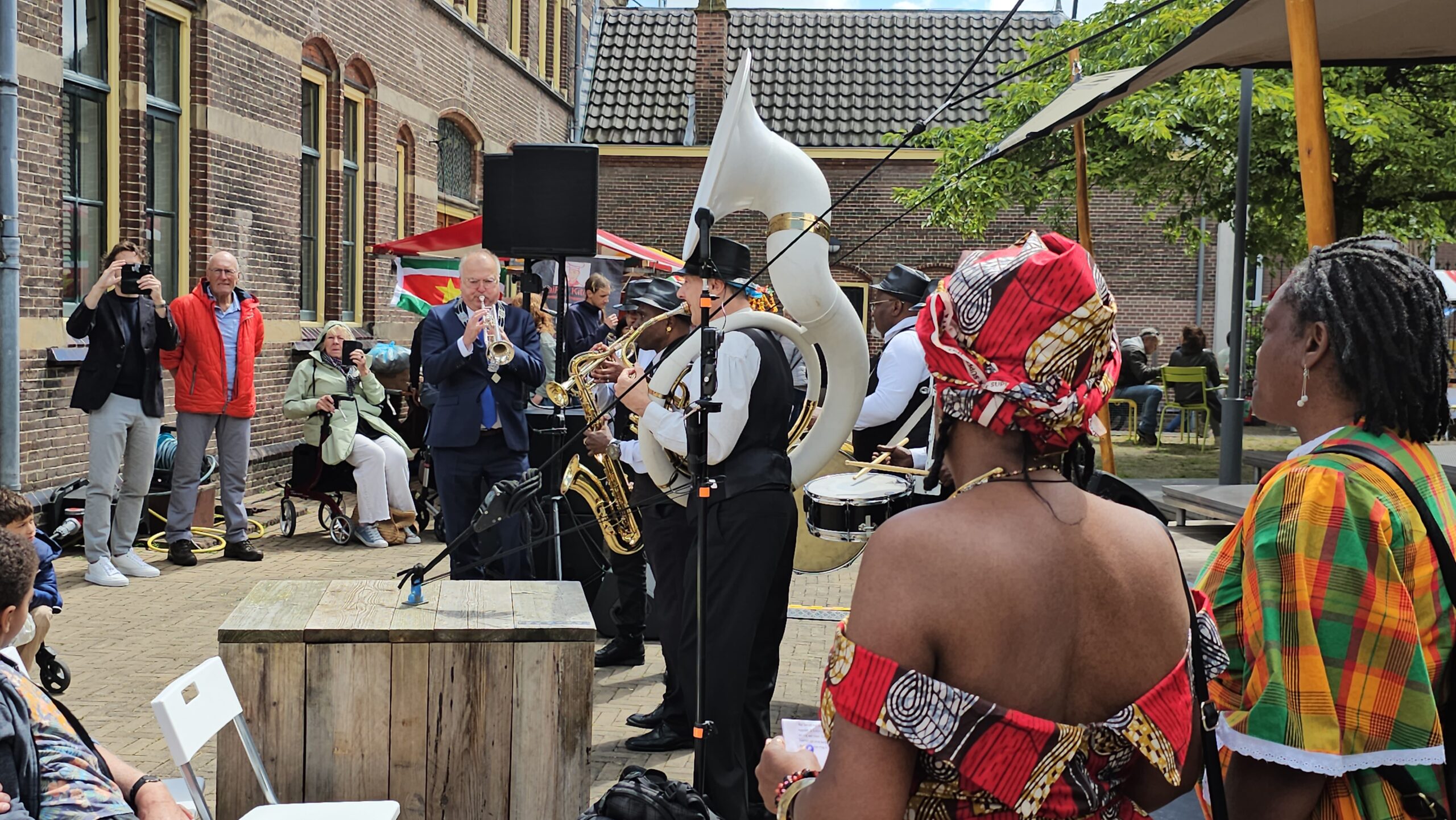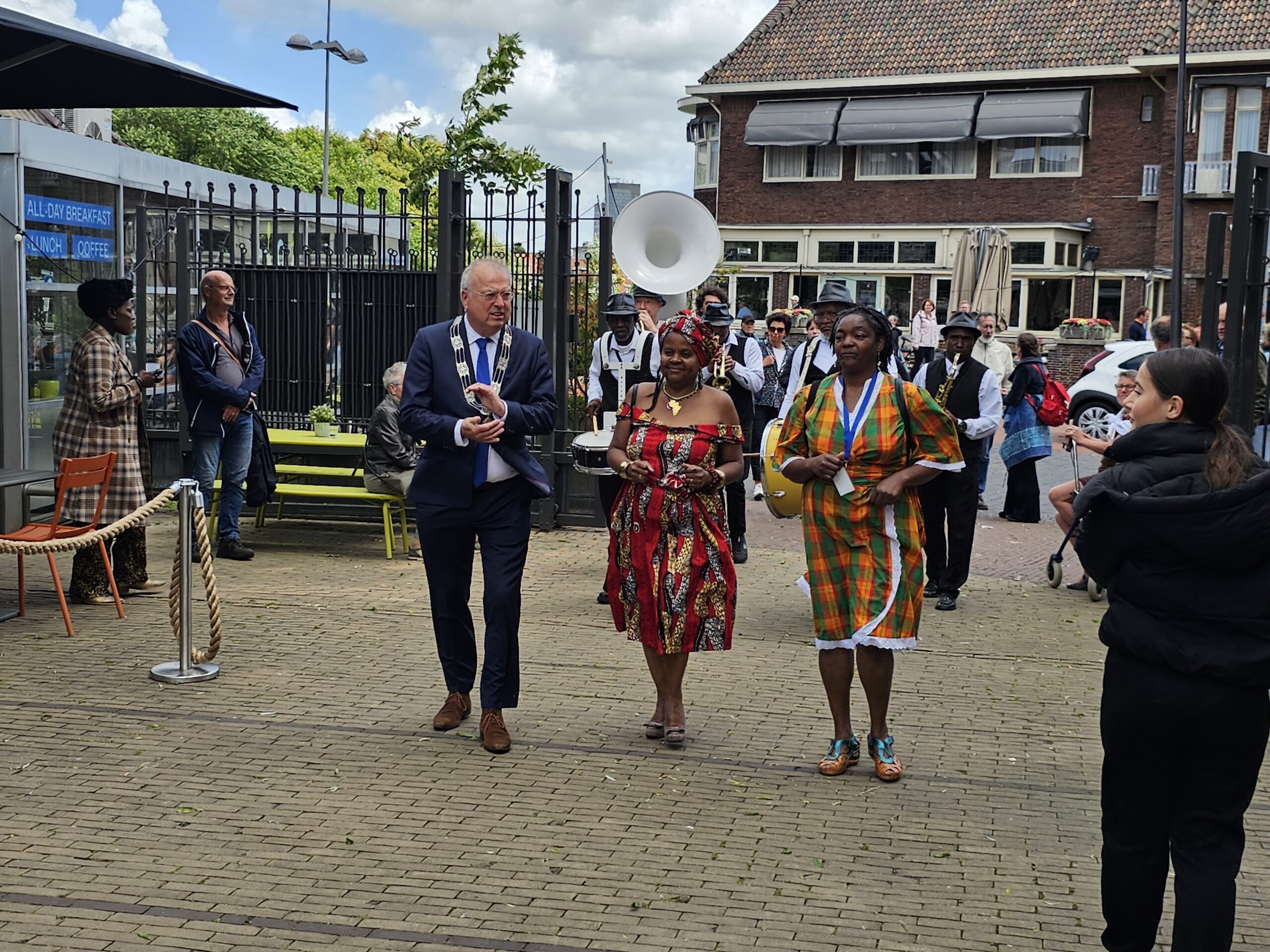 Het Keti Koti Festival begon bij de ingang van de museumtuin waar ‘Boven de Sterren’ het publiek naar het evenement lokte. De traditionele Surinaamse koperblazers verwelkomden burgemeester Peter van der Velden die op de trompet een vrolijk deuntje meeblies.