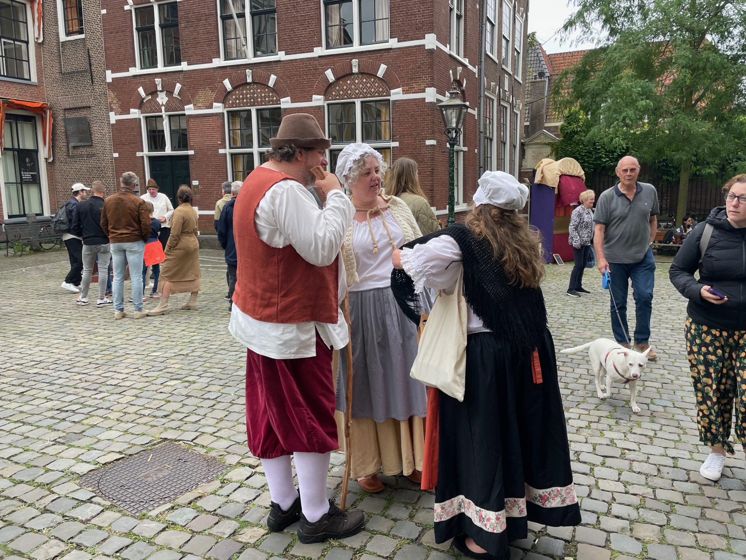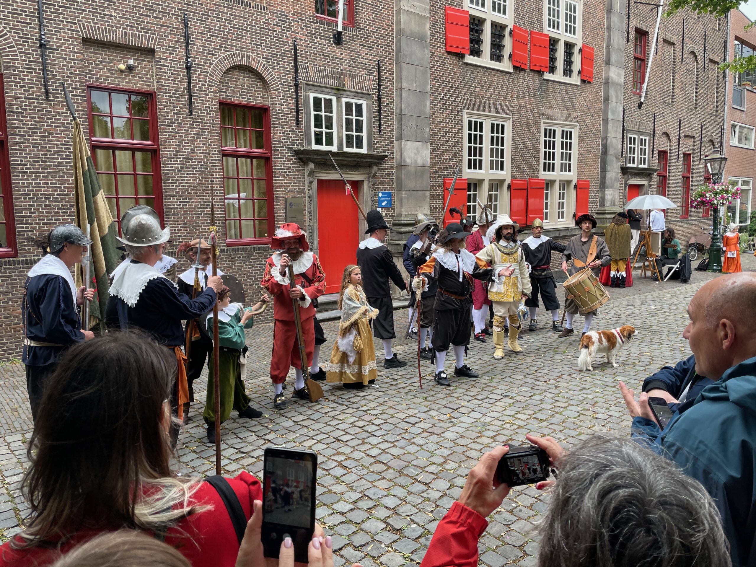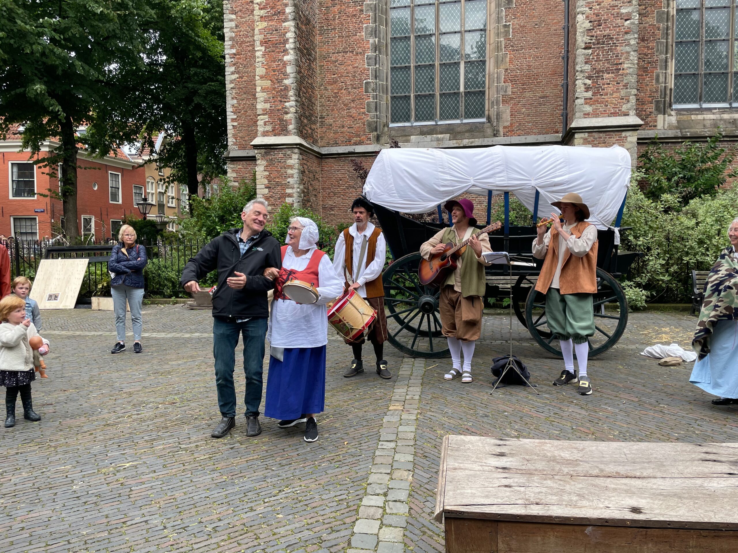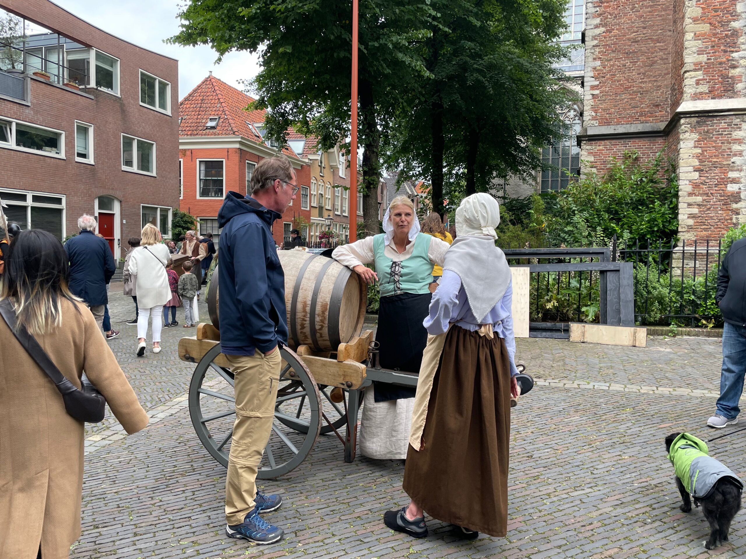 Voor de vierde keer stapt Leiden ruim vier eeuwen terug in de tijd. In de aanloop naar de geboortedag van de schilder Rembrandt van Rijn eert de Sleutelstad de beroemde zoon. Rondom de Pieterskerk is het een doorlopend historisch theater. Aanvankelijk valt het weer tegen, maar in de loop van de middag wordt het droger en komt er meer publiek.